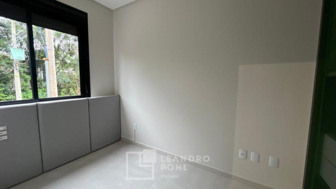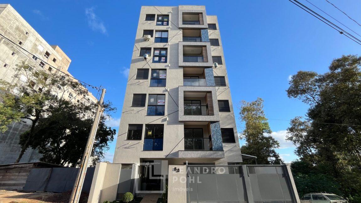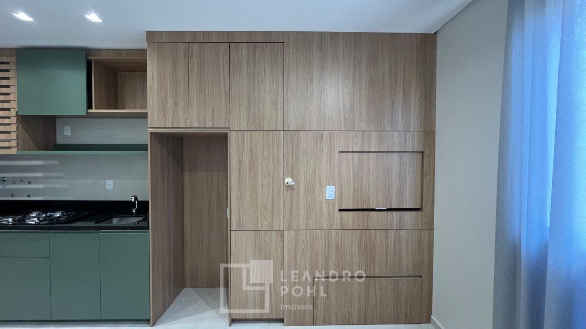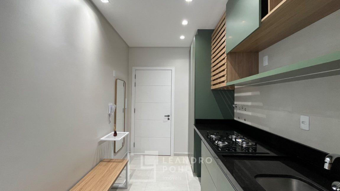 Apartamento novo, 1 dormitório, de frente, com box de estacionamento para moto, churrasqueira, piso porcelanato, semimobiliado, aberturas em alumínio, prédio com elevador, gás central, agua individual,