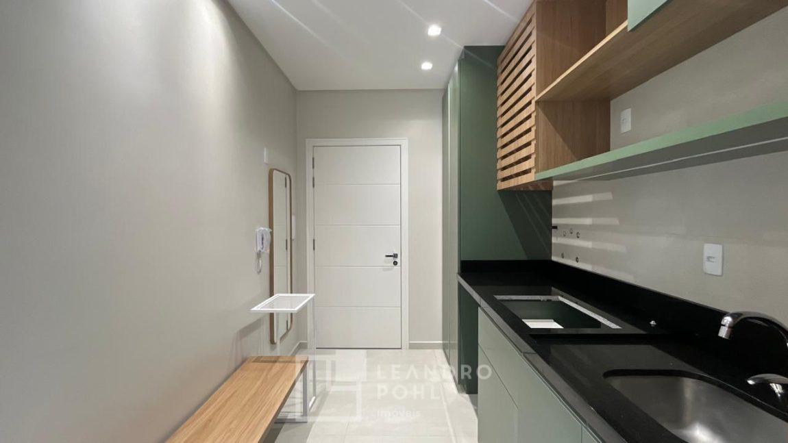 Apartamento novo, 1 dormitório, de frente, com box para moto, churrasqueira, piso porcelanato, semimobiliado, aberturas em alumínio, prédio com elevador, gás central, agua individual, a uma quadra da Univates.