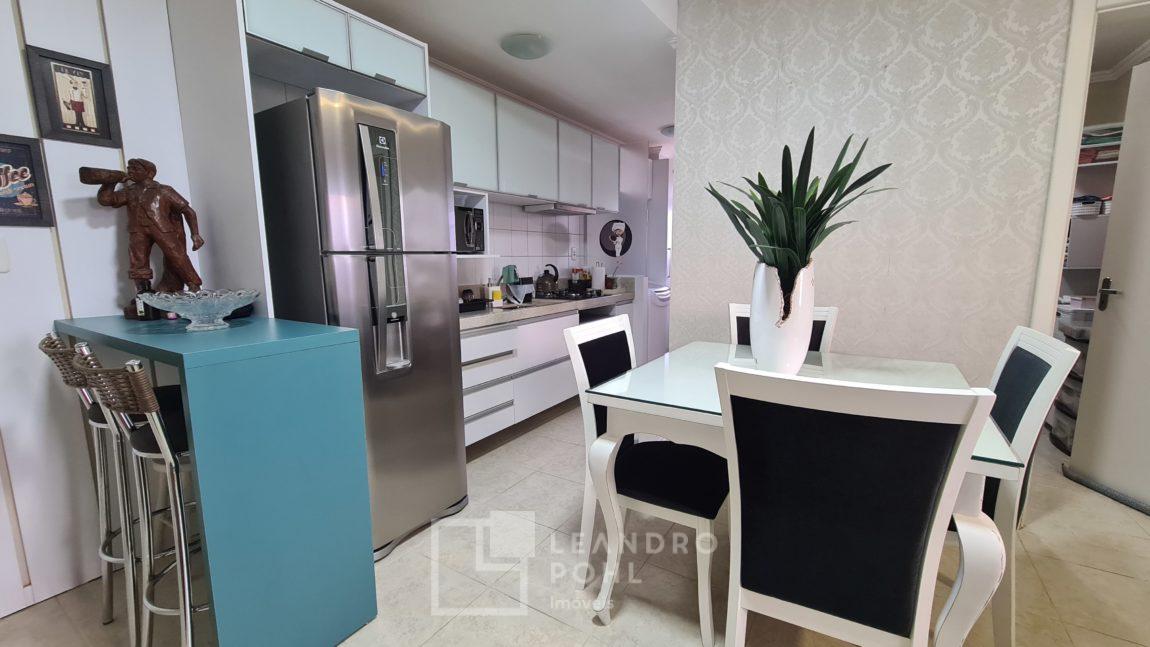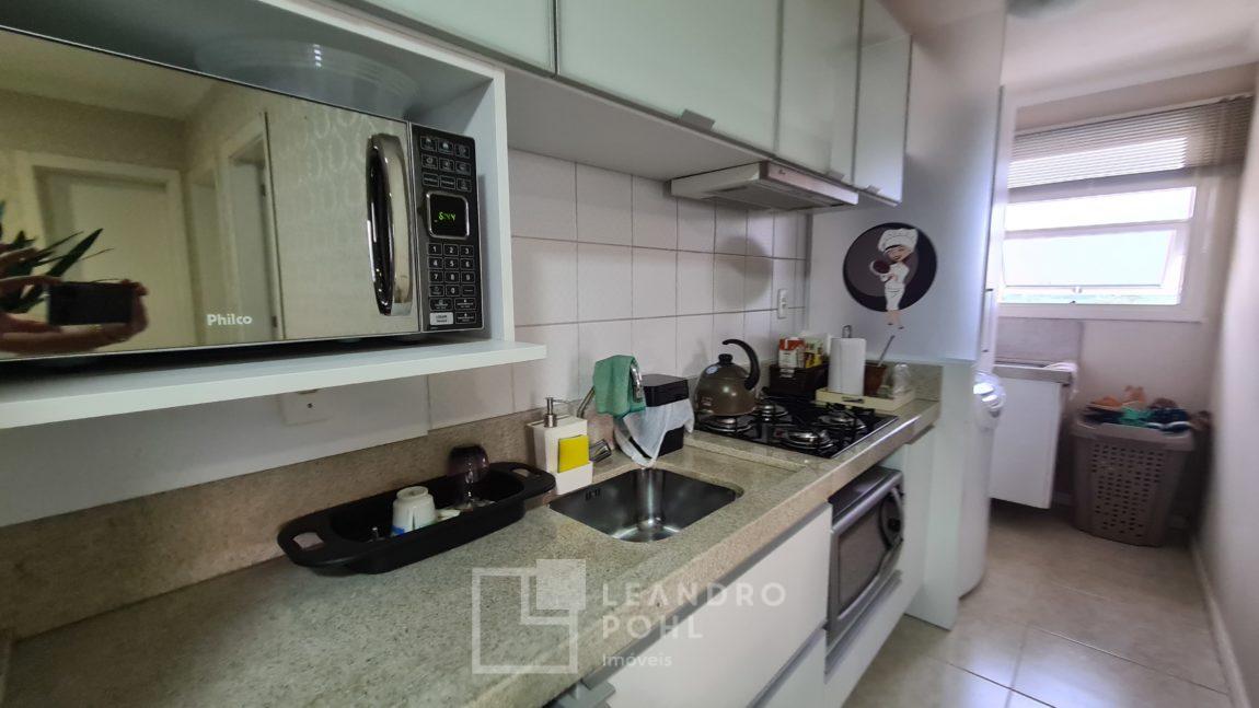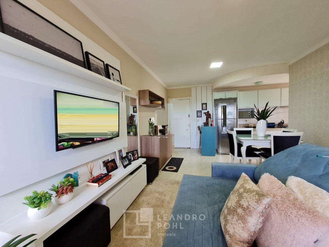 Apartamento semi mobiliado (permanece cozinha, area de serviço, banheiro, painel da sala, split), 02 dormitórios, sala de estar, jantar, piso cerâmico, área de serviço, banheiro social, sacada fechada, de fundos, churrasqueira coletiva no salão de festas, box de estacionamento.