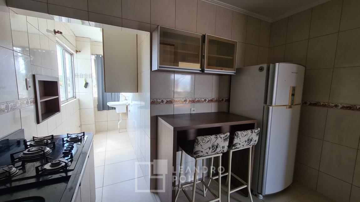 Apartamento de frente semimobiliado,02 dormitórios, sala de estar, jantar com lareira, piso cerâmico, sacada fechada, cozinha separada, área de serviço, banheiro, churrasqueira e box de estacionamento. Permanecem no imóvel os móveis sob medida da cozinha, lareira, geladeira, hall de entrada, mesa, e dois guarda roupas.