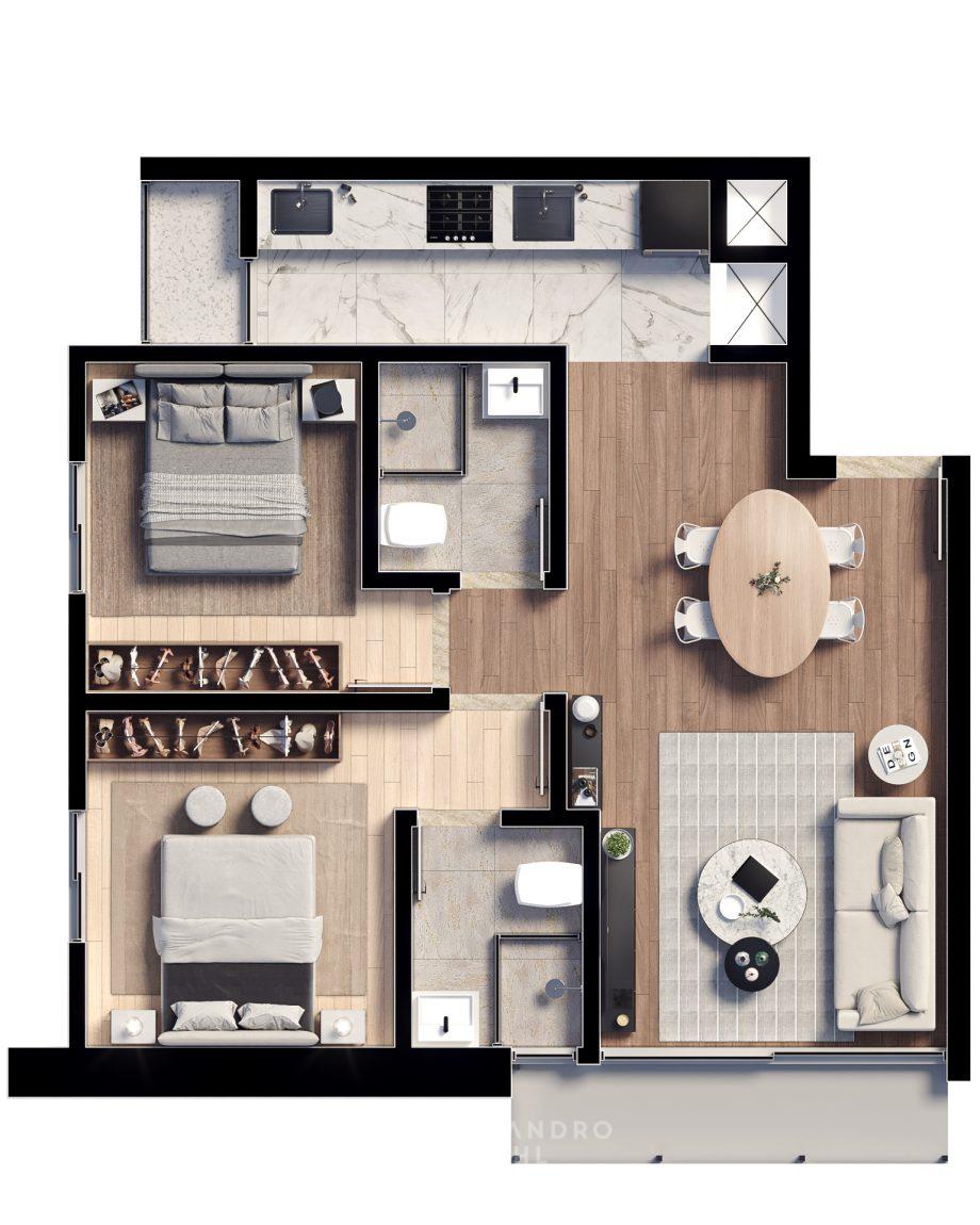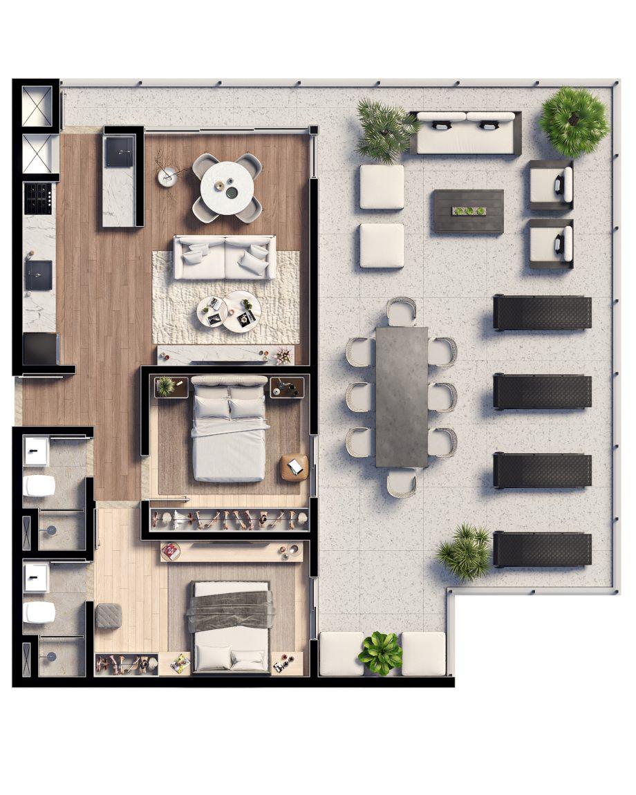 • Planta 02: 2 dormitórios com 2 súites e lavabo com área útil de (garden 97,35 m²) e 77,47m².