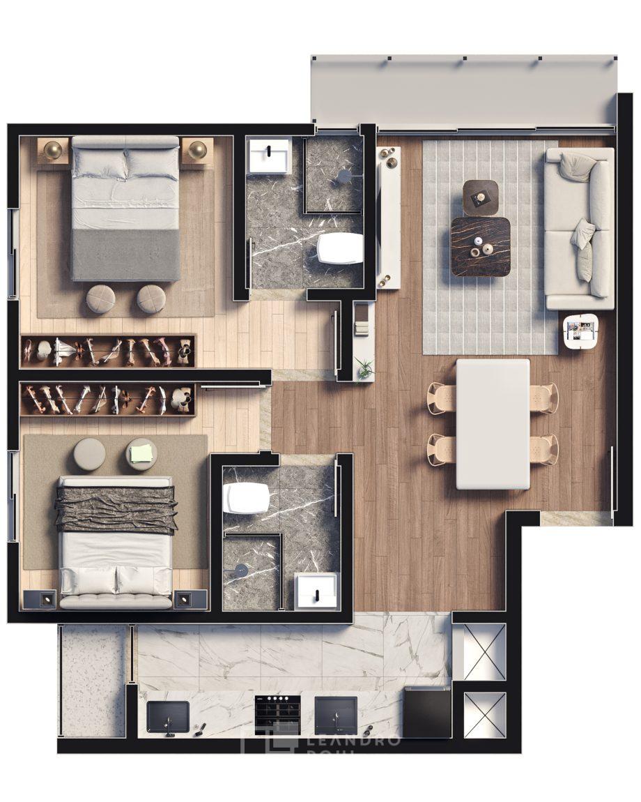 • Planta 02: 2 dormitórios com 2 súites e lavabo com área útil de (garden 97,35 m²) e 77,47m².