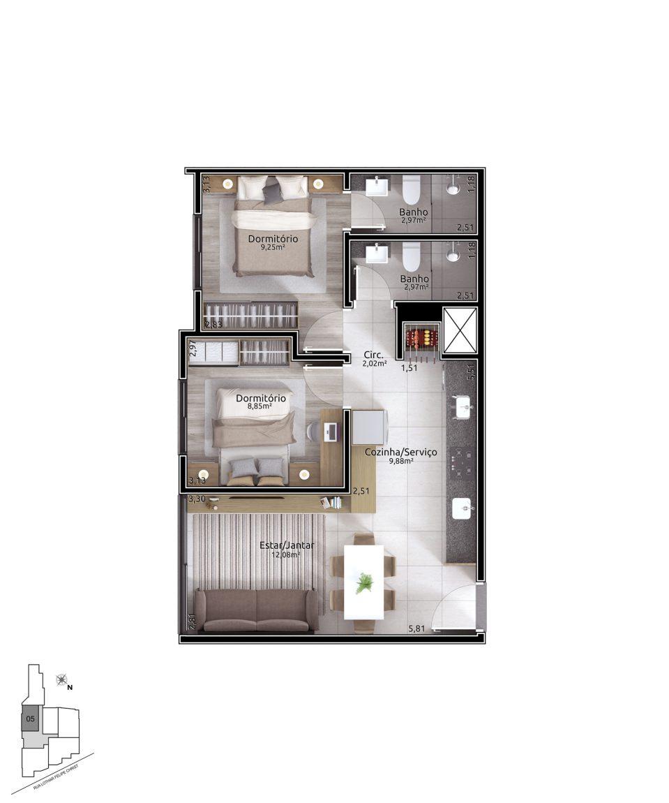 Com infraestrutura completa — Hall mobiliado, coworking, piscina, academia, salão de festas, horta, playground e estação para carro elétrico — o empreendimento combina bem-estar, sustentabilidade e funcionalidade.