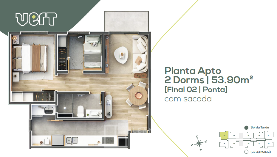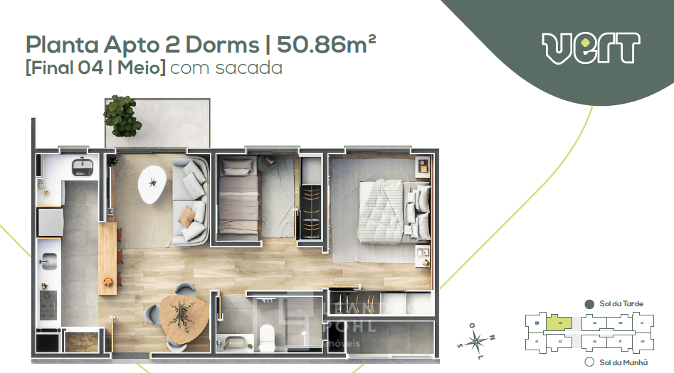 Apartamentos de 2 dormitórios, com e sem sacada, de 50,86m² e 53,90m².