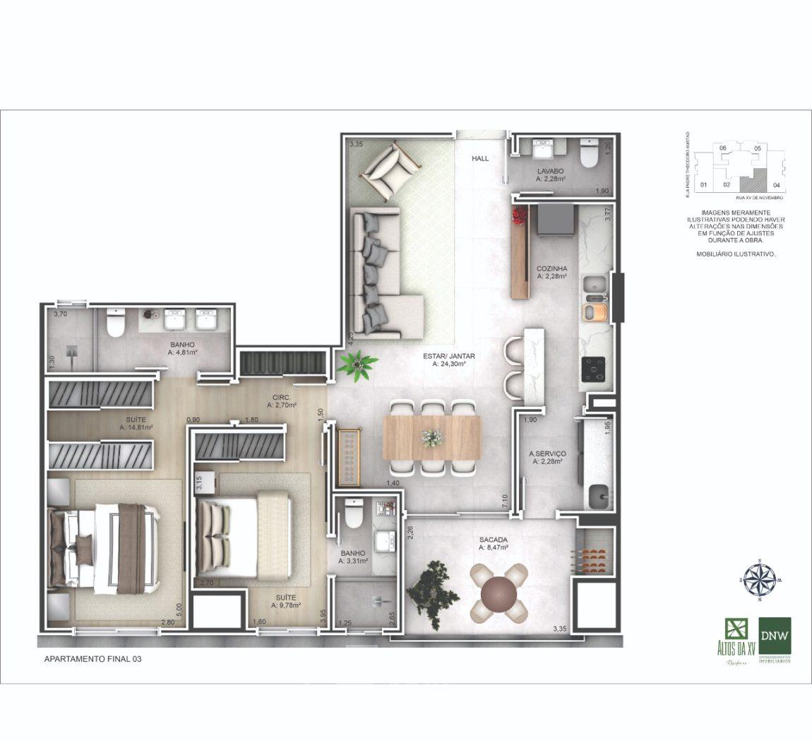 As áreas sociais, hall de entrada, salões de festa, playground, academia e belvedere serão entregues mobiliadas e decoradas.