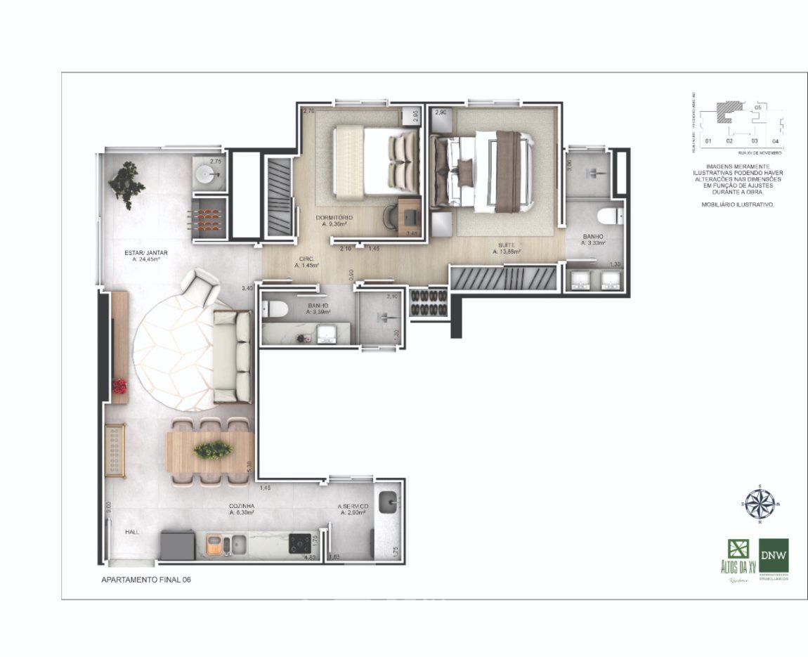 As áreas sociais, hall de entrada, salões de festa, playground, academia e belvedere serão entregues mobiliadas e decoradas.