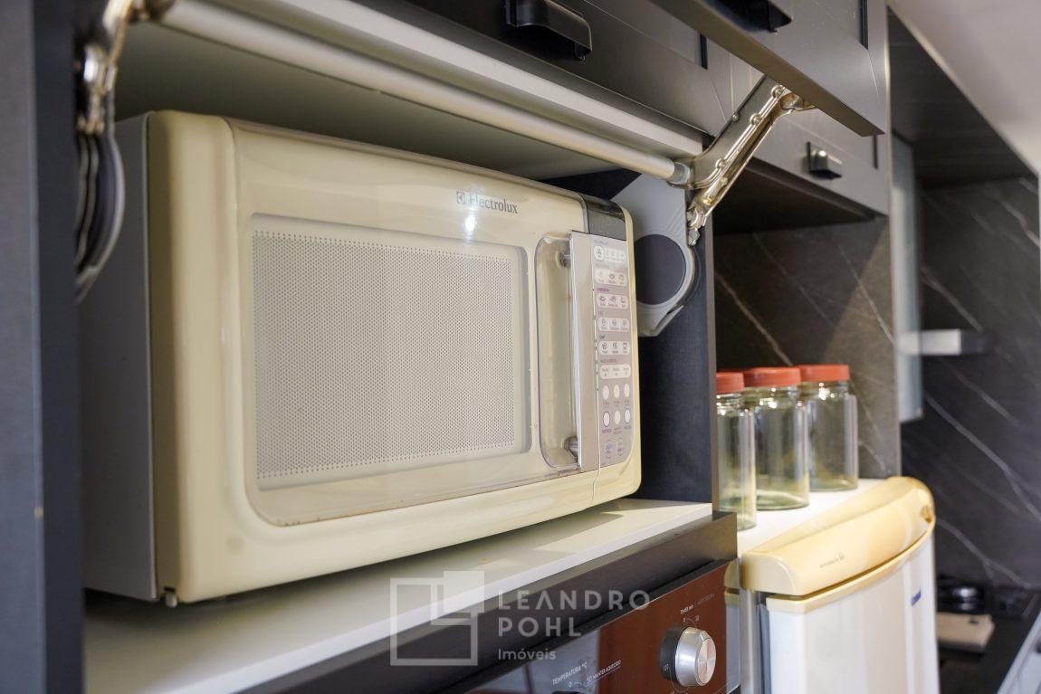chuveiro elétrico com regulagem de temperatura, microondas, cooktop 2 bocas com coifa, torradeira.