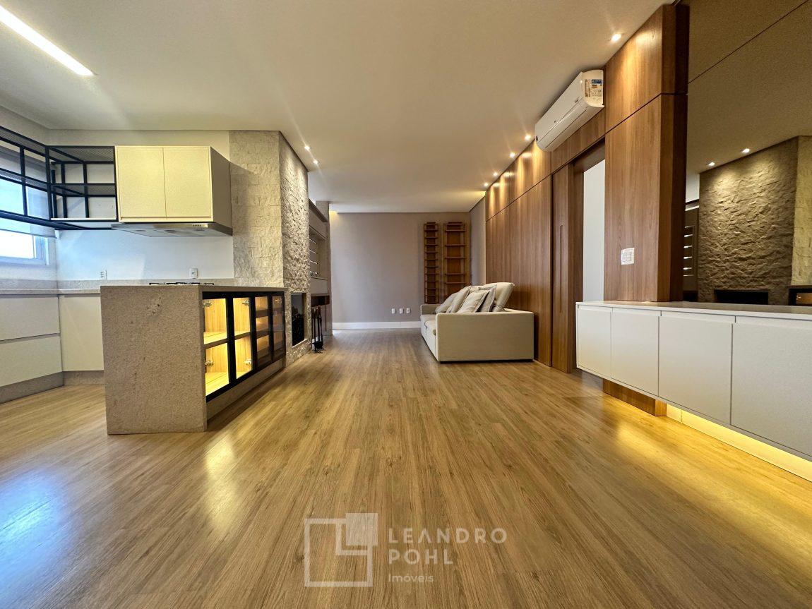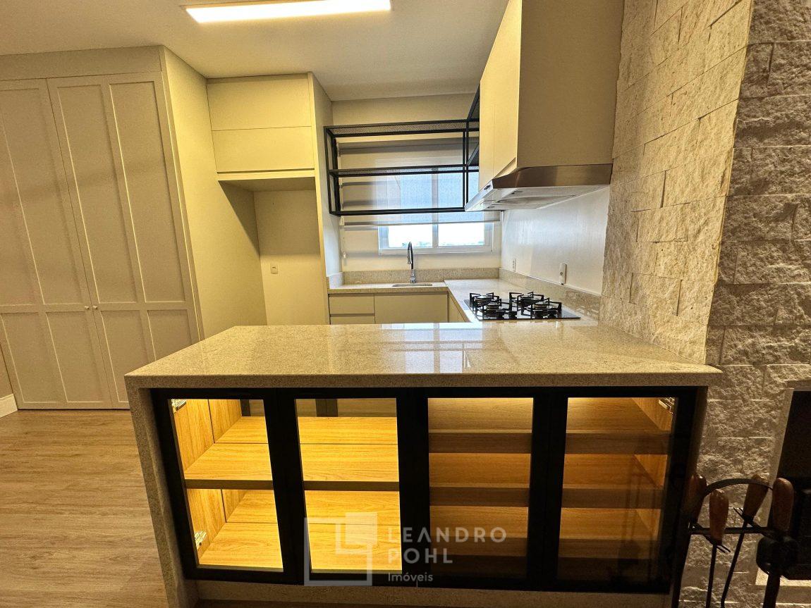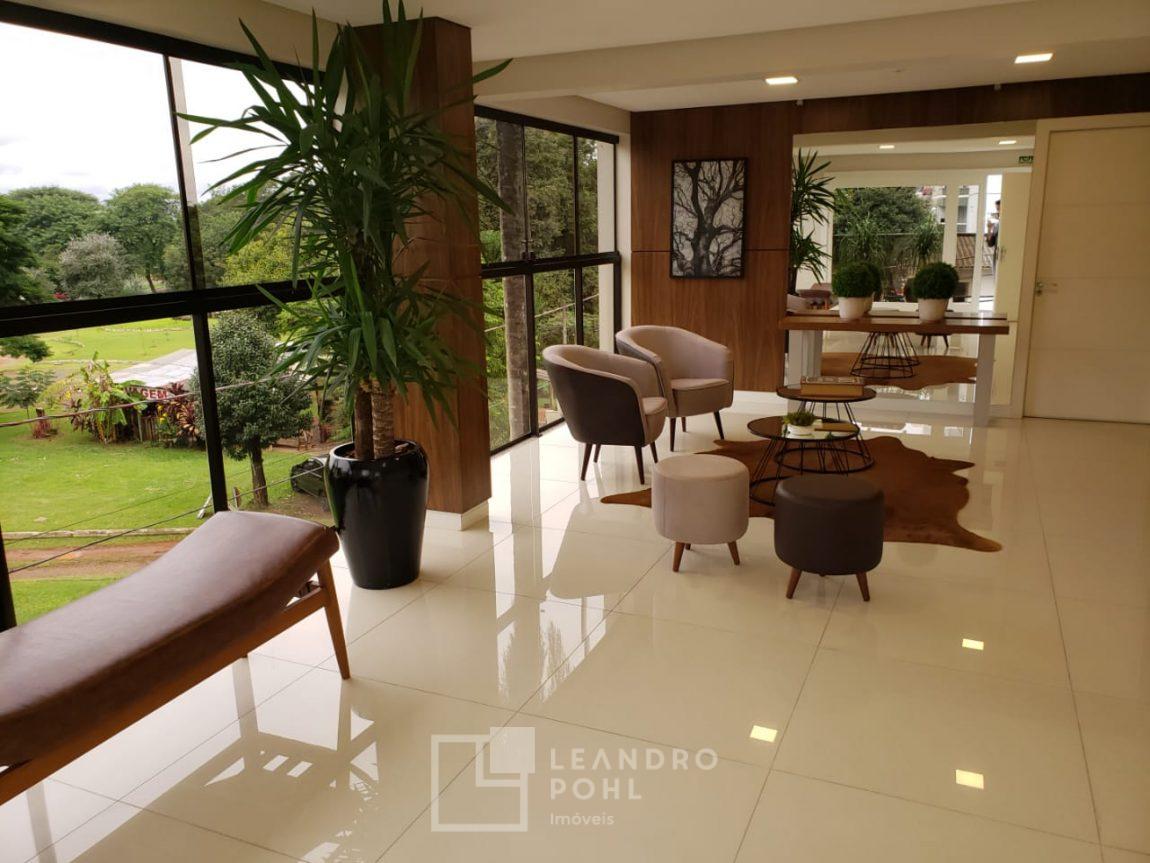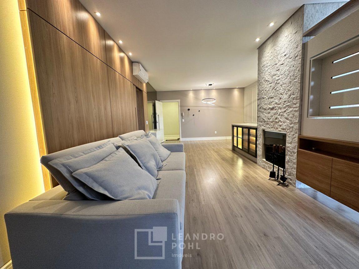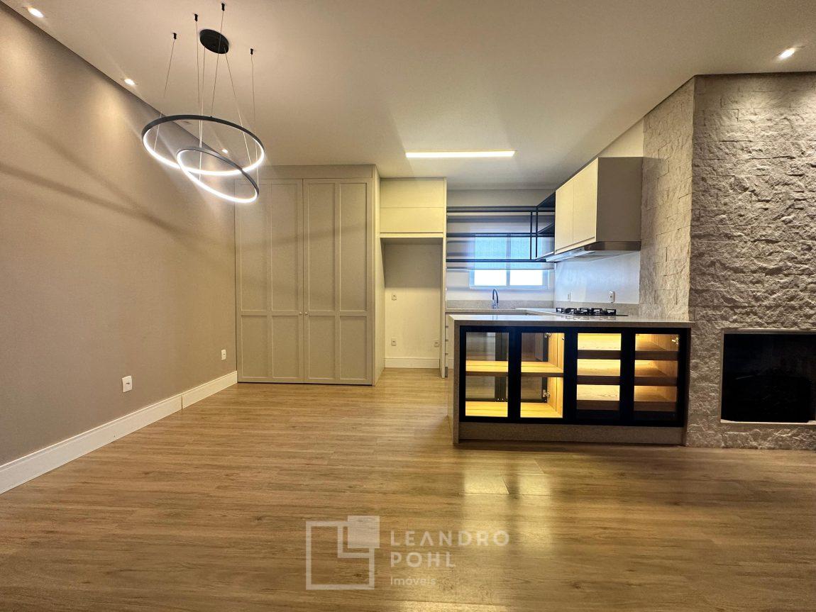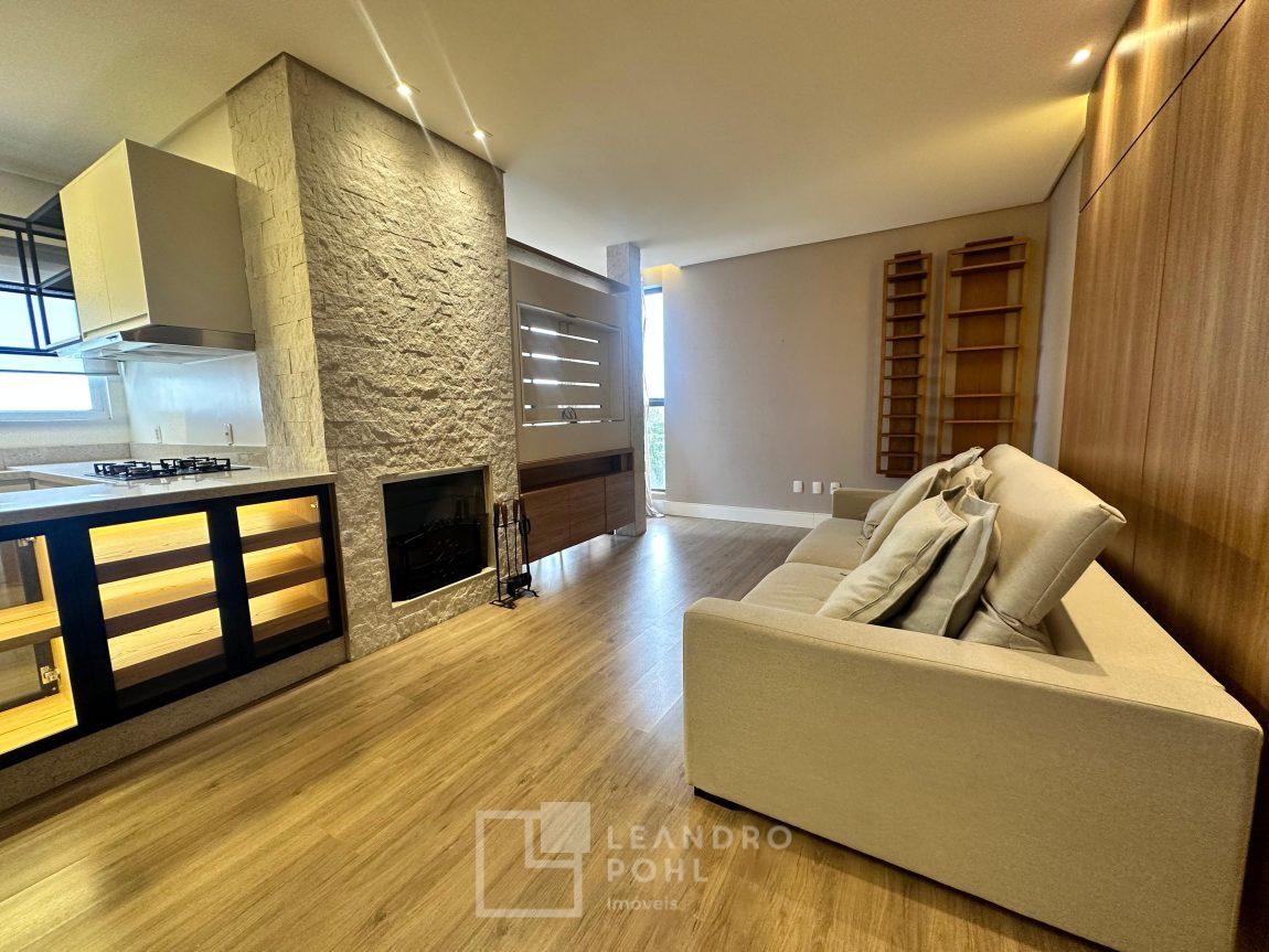 Excelente apartamento, 2 dormitórios, SEMI MOBILIADO, iluminação, split, metais, lareira, espaço gourmet, suíte com closet, piso laminado, área de serviço, box duplo de estacionamento com 22 m², vista para o Parque dos Dick, sacada, gás central, agua individual, espera para split, elevador.