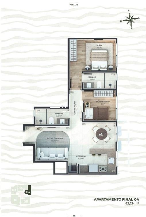 - Apartamentos de 2 dormitórios, 2 suítes e 1 suíte.\