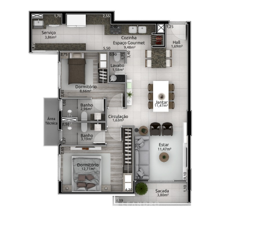 Apartamento de 2 suítes, sacada, churrasqueira, piso porcelanato, 10° andar.