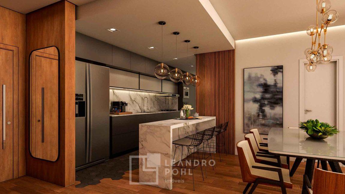 Apartamento 2 suítes, lavabo, de frente, sacada, sala de estar e jantar, cozinha com churrasqueira, área de serviço, banheiro, garagem, em condomínio com infraestrutura completa.