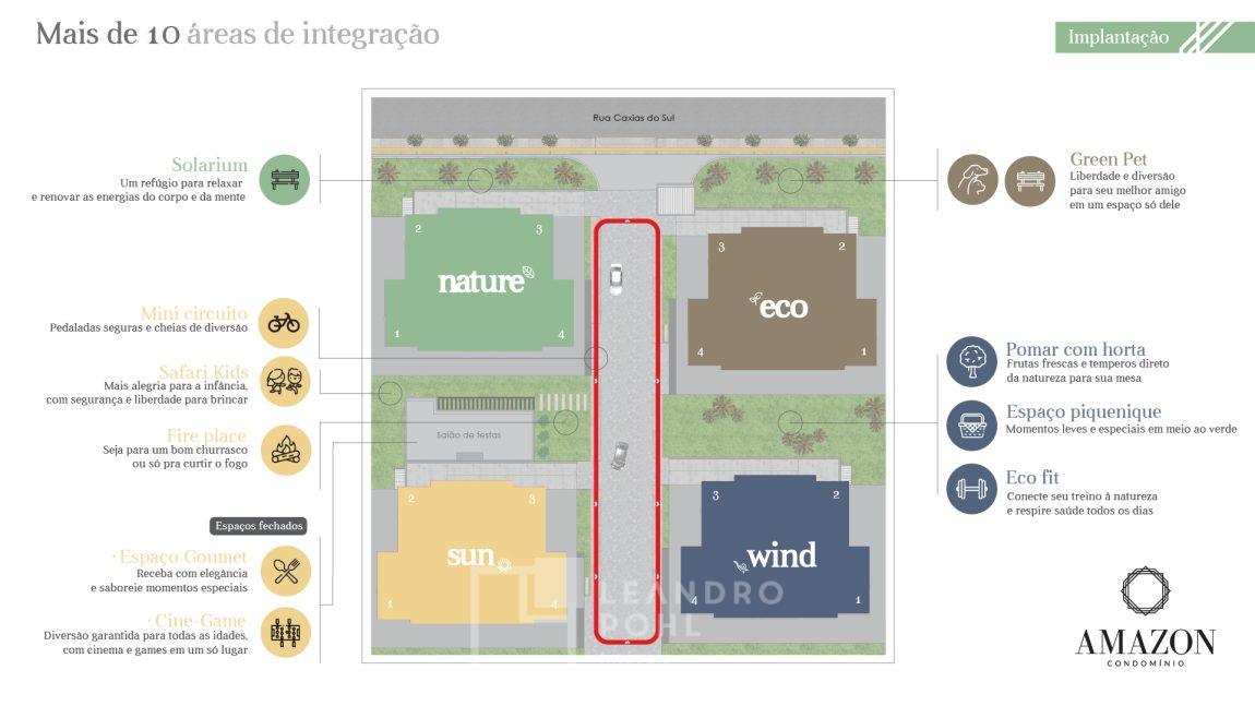 O Amazon tem o propósito de oferecer mais conforto, segurança e tranquilidade com espaços de convivência para você, sua família e amigos, inspirado na natureza, o sol, a terra e o ar. São 4 torres (nature, sun, eco, wind) com 8 andares cada e 4 apartamentos por andar, somente com unidades de 2 dormitórios.
