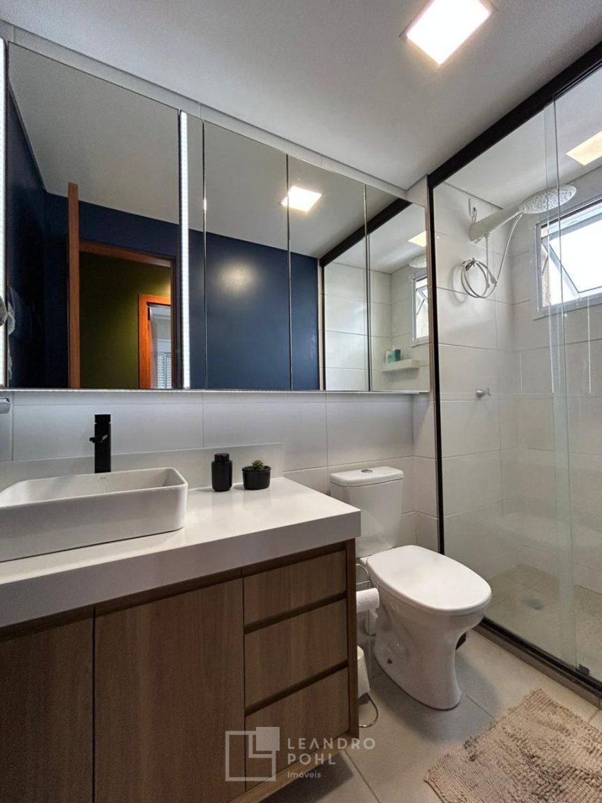 Banheiro: móvel sob medida, louça, box e chuveiro.