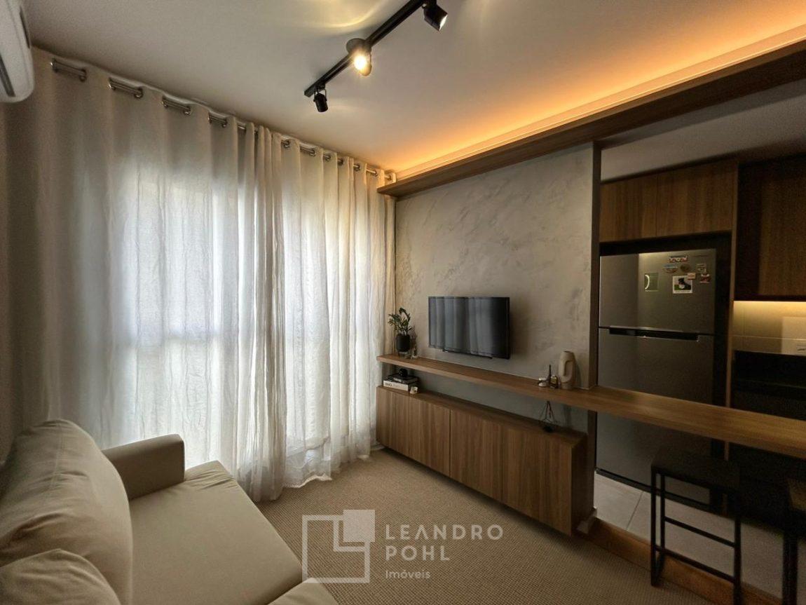 Sala de estar e jantar: móvel sob medida, cortina, canto alemão, mesa com cadeiras, luminárias e ar condicionado.