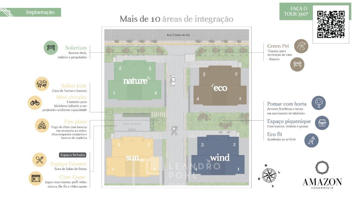 O Amazon tem o propósito de oferecer mais conforto, segurança e tranquilidade com espaços de convivência para você, sua família e amigos, inspirado na natureza, o sol, a terra e o ar. São 4 torres (nature, sun, eco, wind) com 8 andares cada e 4 apartamentos por andar, somente com unidades de 2 dormitórios.