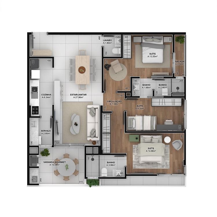 São 3 suítes, uma com sacada, 02 salões de festas com churrasqueira, varanda gourmet, lavabo, condomínio com quiosque, área de lazer, quadra esportiva para criança, conforme projeto (a área será entregue equipada, e decorada, conforme projeto)