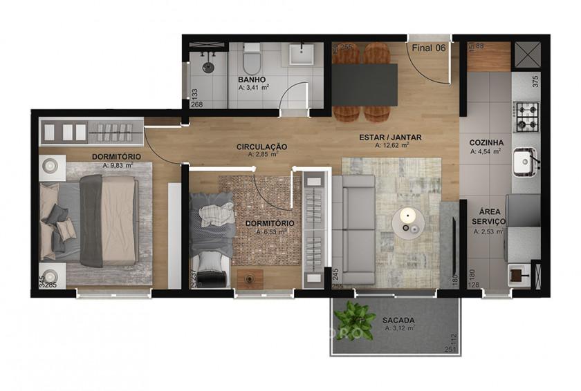 Apartamentos de 54,59m² e 52,80m² com 2 dormitórios;