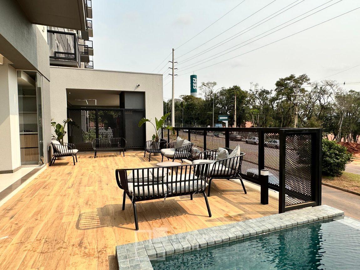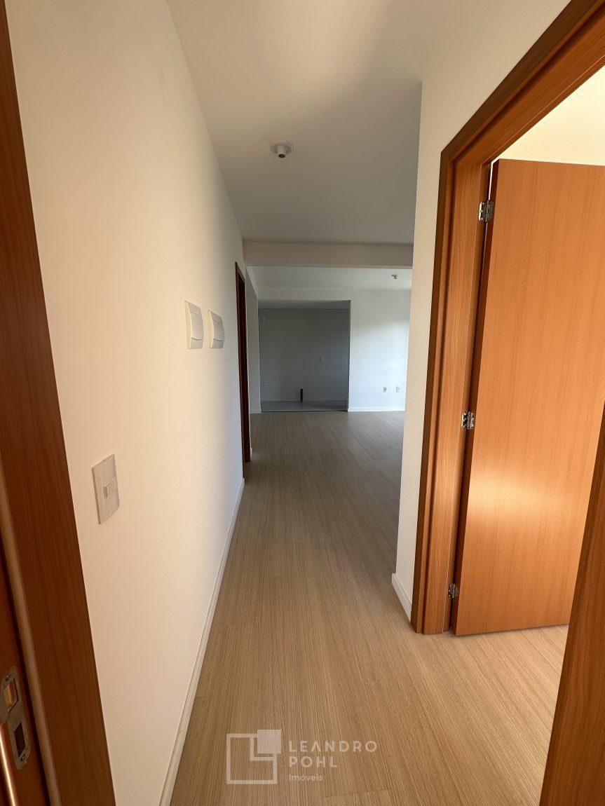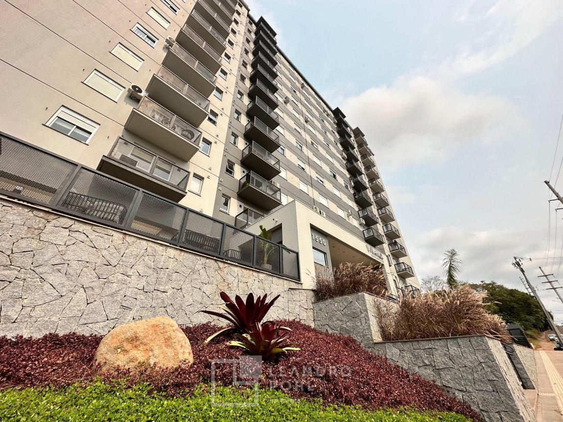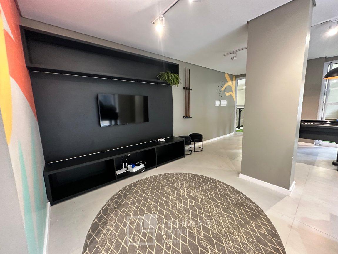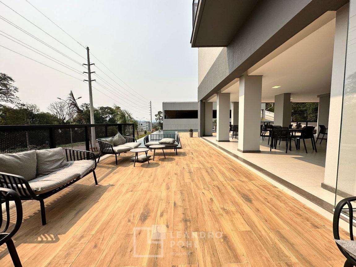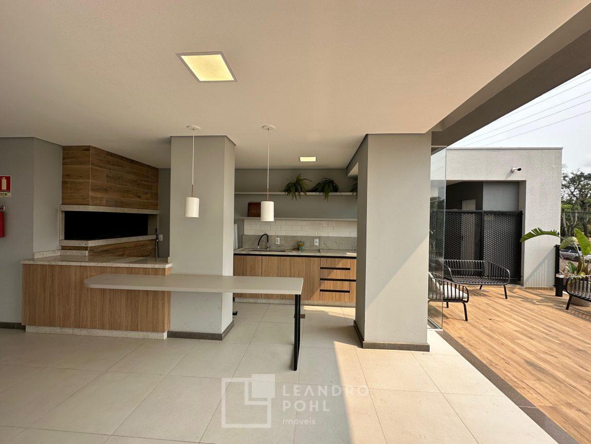 Apartamento 3 dormitórios, mobiliado, piso laminado na área privativa e porcelanato na social, de fundos, espera para ar condicionado, sacada, churrasqueira, agua quente.