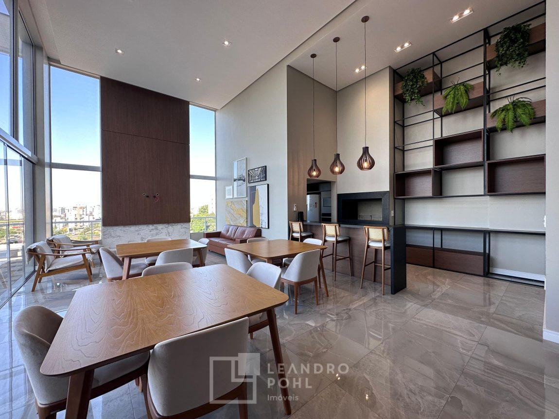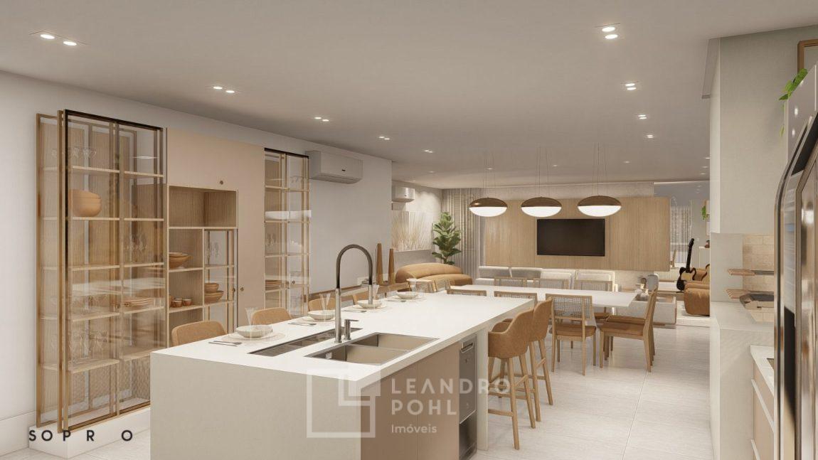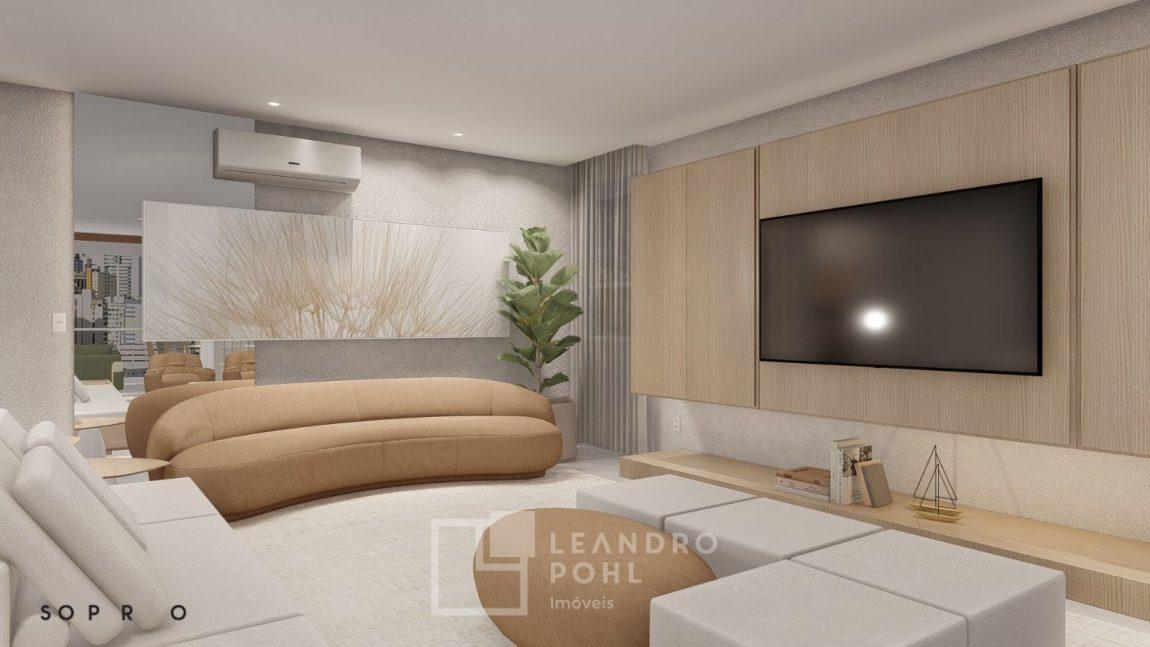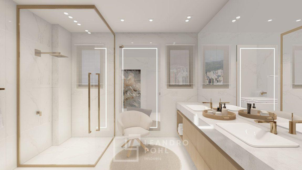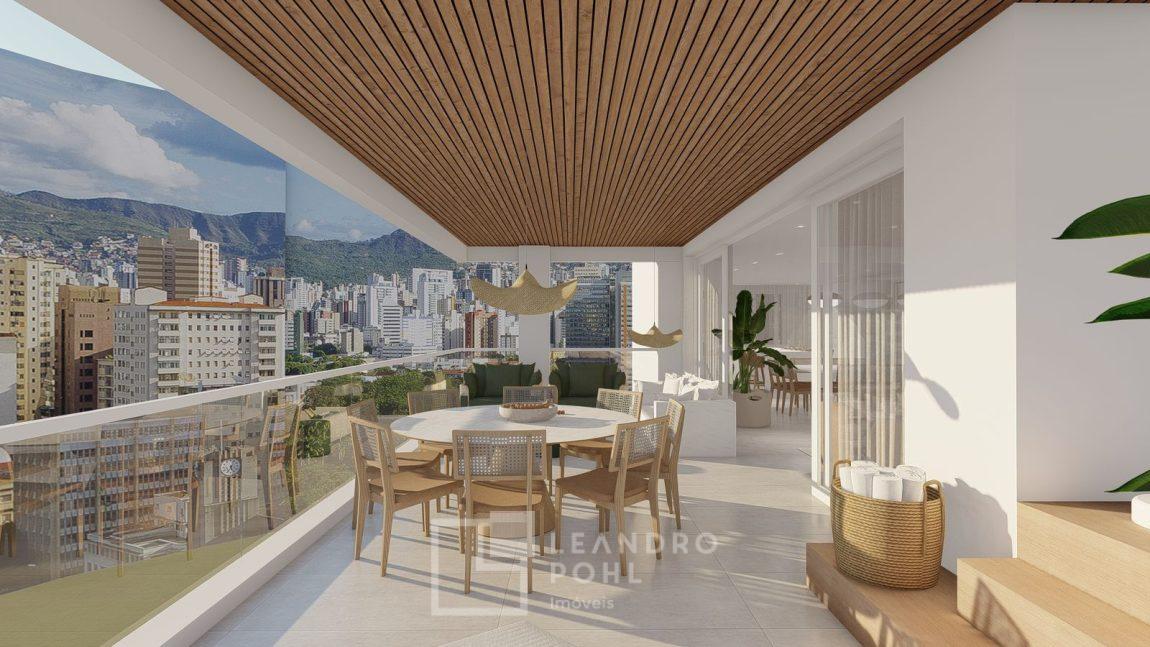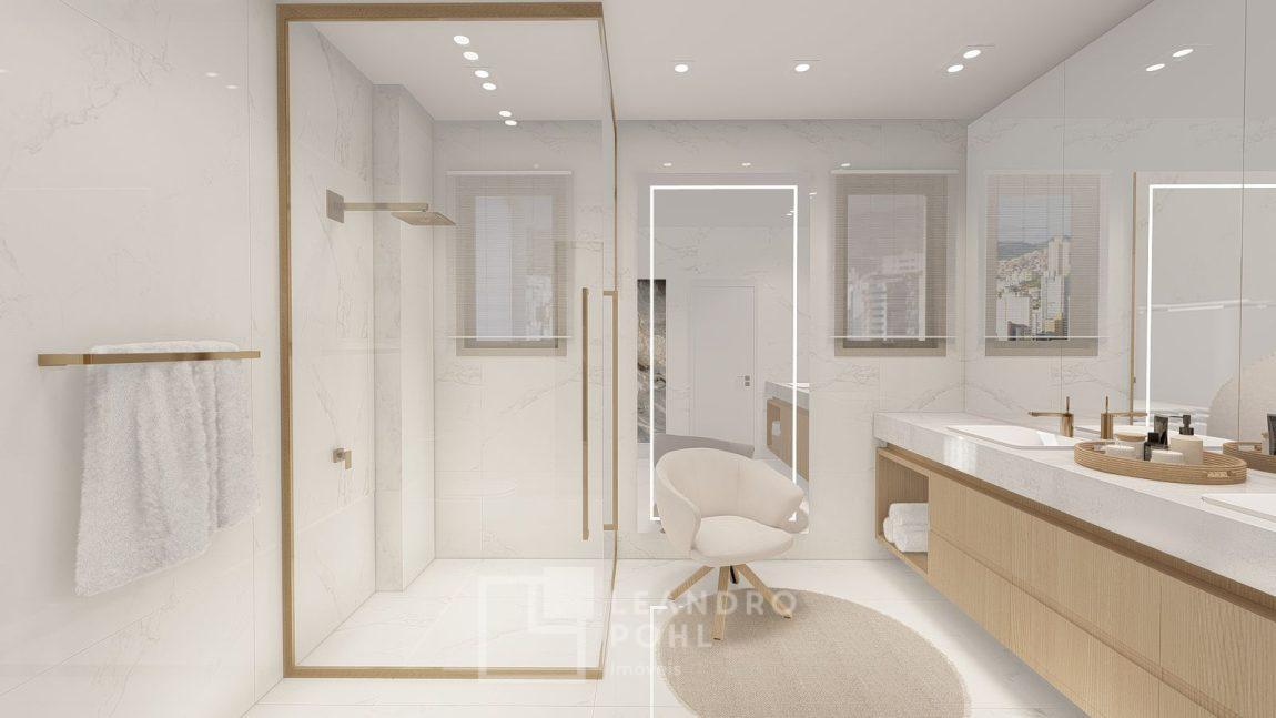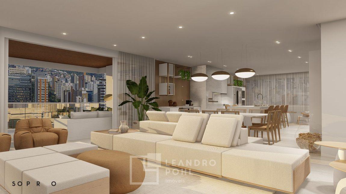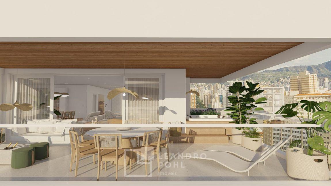 living externo com espera para spa, cozinha com churrasqueira, espaço para ilha e estar gourmet, área social do apartamento integrada e com amplos vãos livres, sem colunas ou vigas aparentes, pé direito de 3m, rebaixo em gesso, acabamentos classe A, porcelanato 80x80 nas áreas sociais do apartamento e terraço, aberturas em PVC branco, áreas sociais decoradas (Hall de entrada, salão de festas e academia), 2 elevadores de última geração.