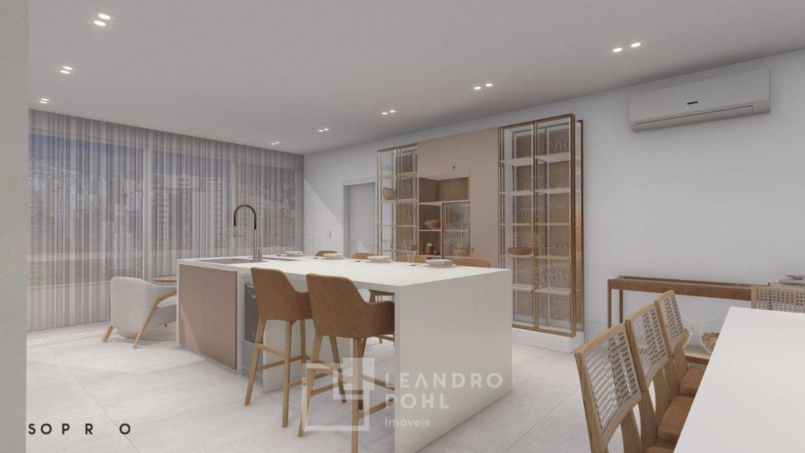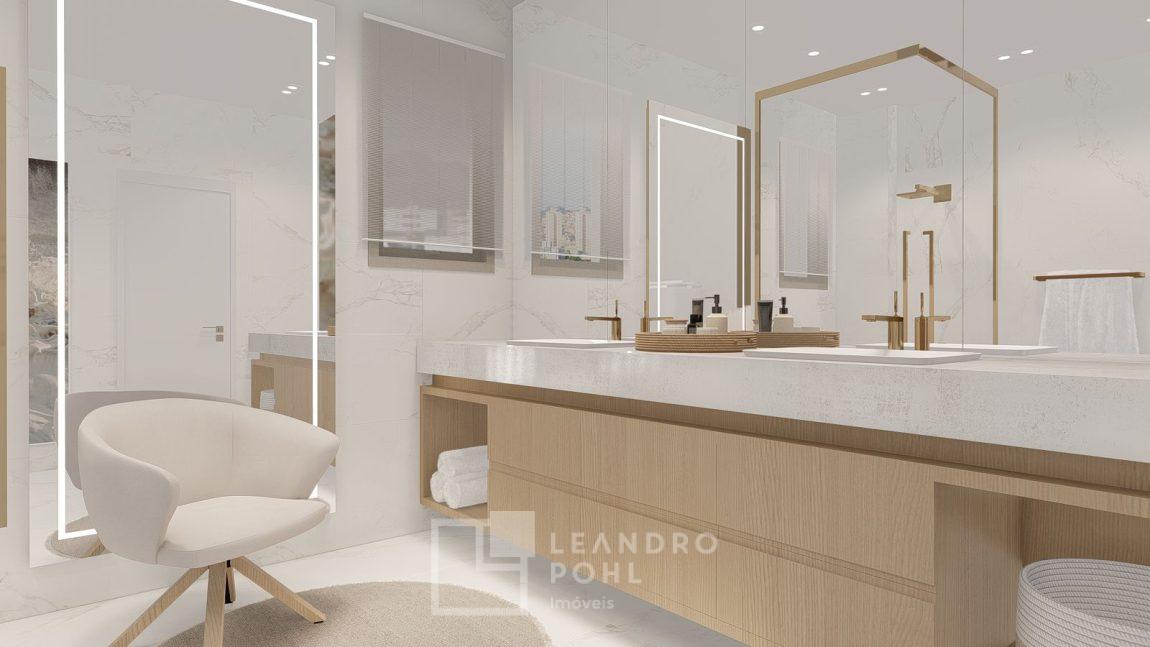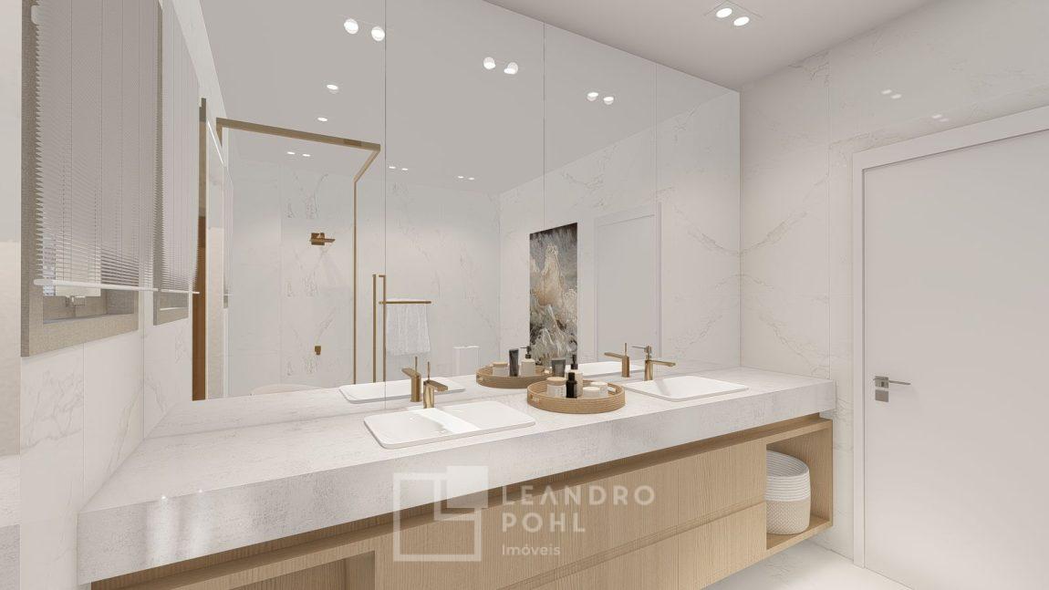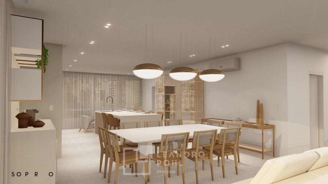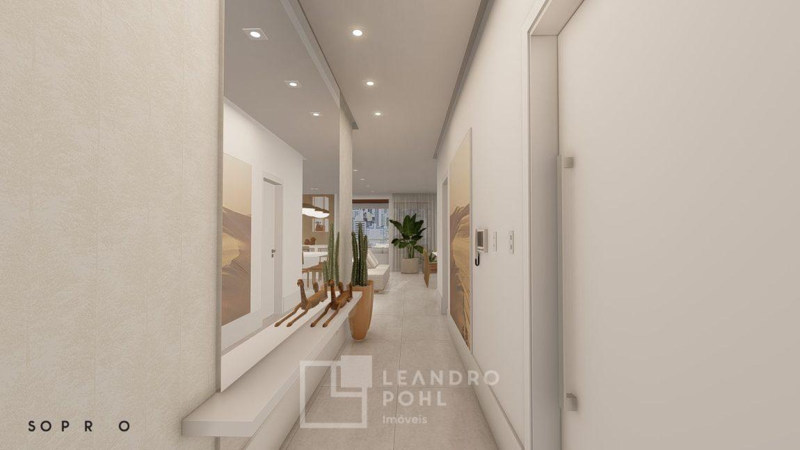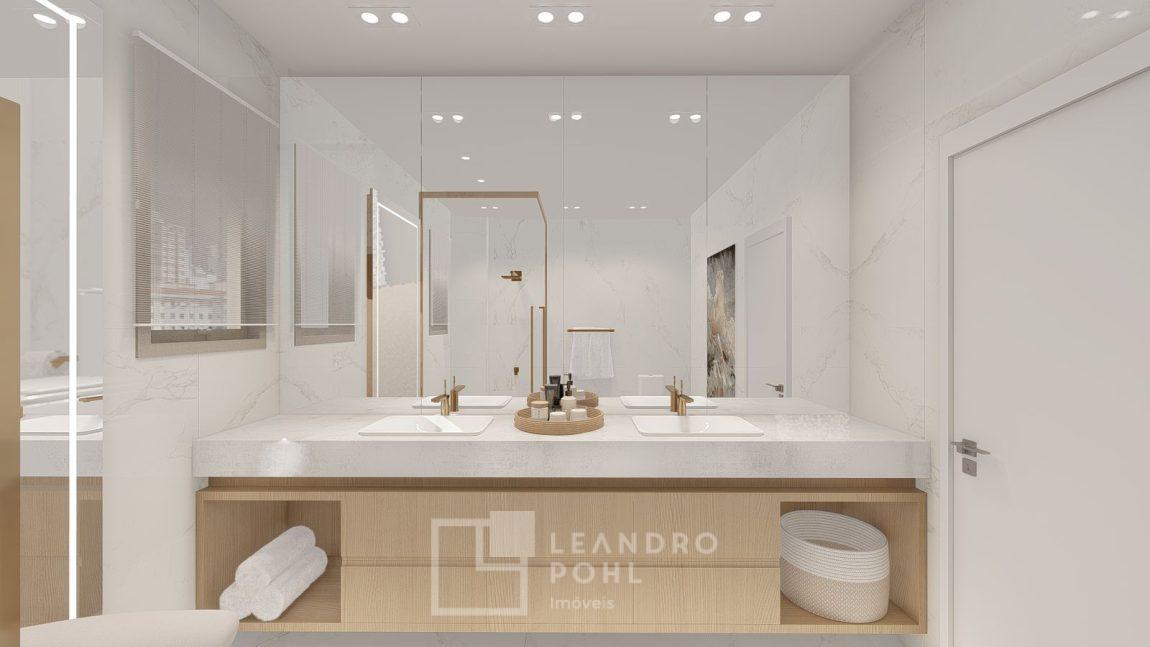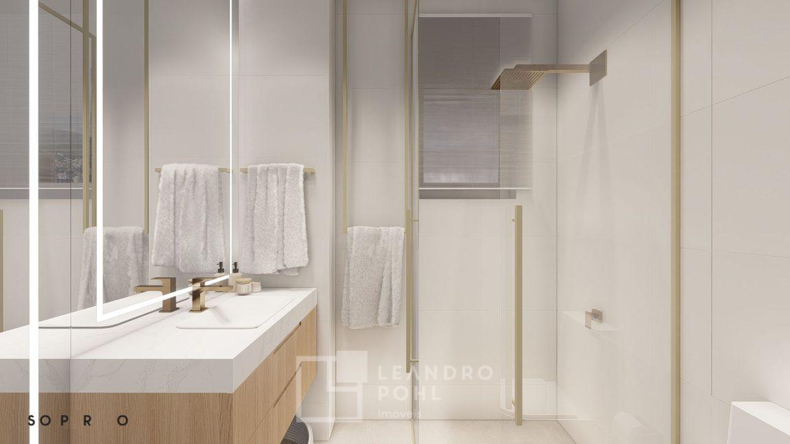 living externo com espera para spa, cozinha com churrasqueira, espaço para ilha e estar gourmet, área social do apartamento integrada e com amplos vãos livres, sem colunas ou vigas aparentes, pé direito de 3m, rebaixo em gesso, acabamentos classe A, porcelanato 80x80 nas áreas sociais do apartamento e terraço, aberturas em PVC branco, áreas sociais decoradas (Hall de entrada, salão de festas e academia), 2 elevadores de última geração.