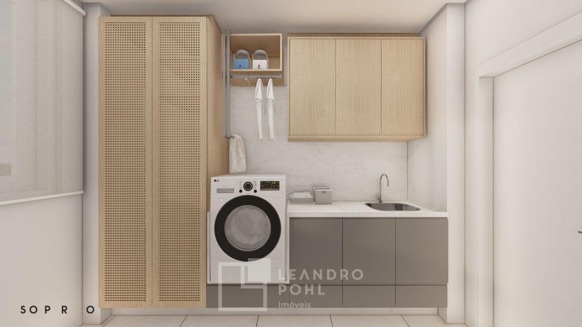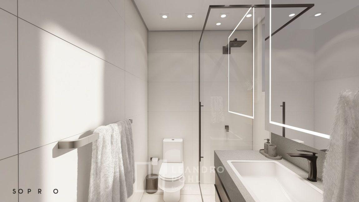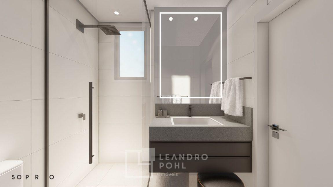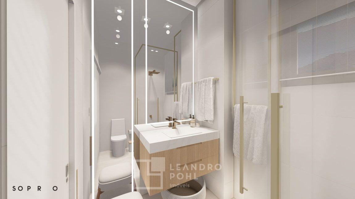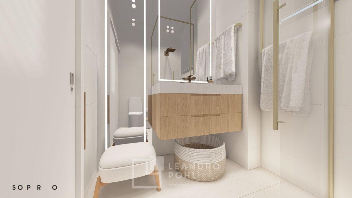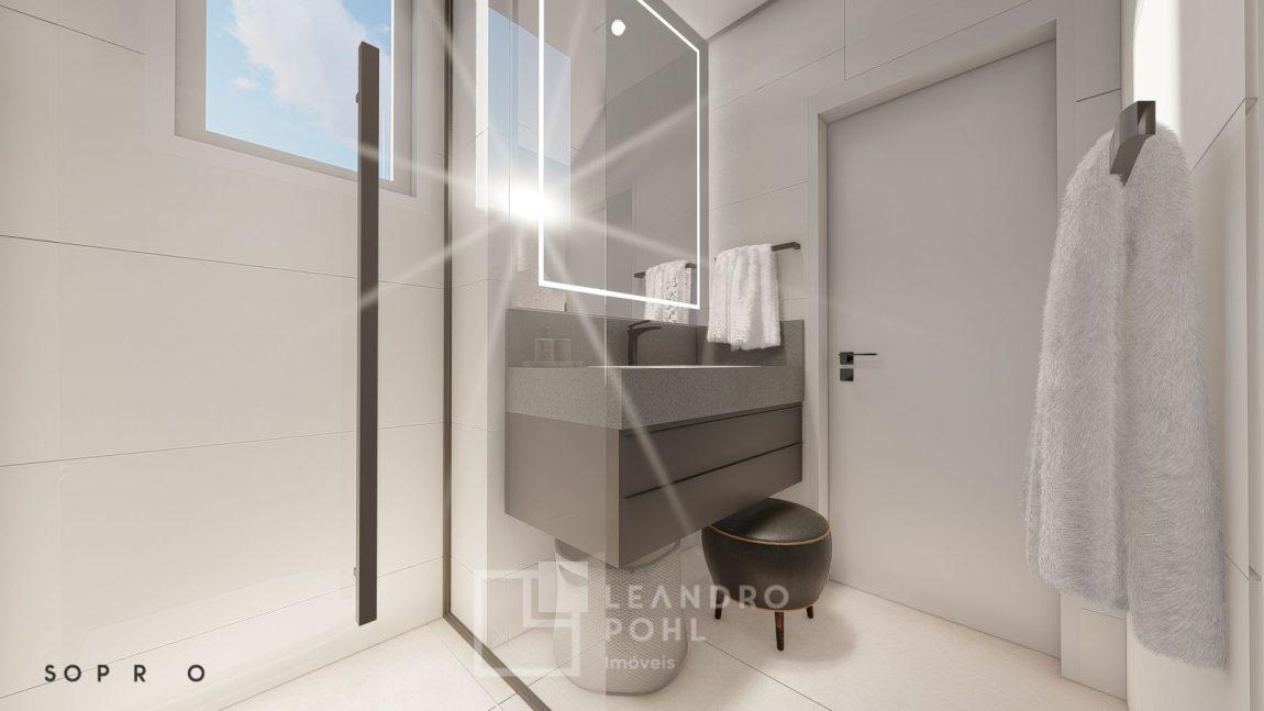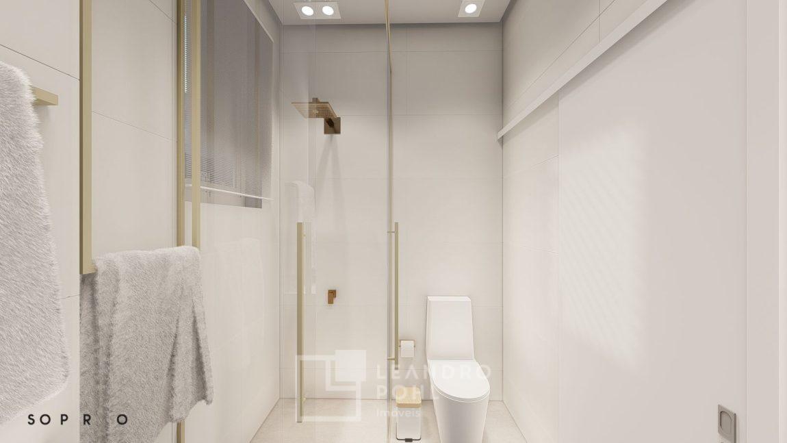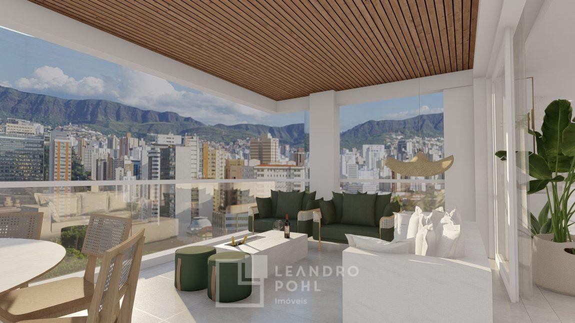 living externo com espera para spa, cozinha com churrasqueira, espaço para ilha e estar gourmet, área social do apartamento integrada e com amplos vãos livres, sem colunas ou vigas aparentes, pé direito de 3m, rebaixo em gesso, acabamentos classe A, porcelanato 80x80 nas áreas sociais do apartamento e terraço, aberturas em PVC branco, áreas sociais decoradas (Hall de entrada, salão de festas e academia), 2 elevadores de última geração.