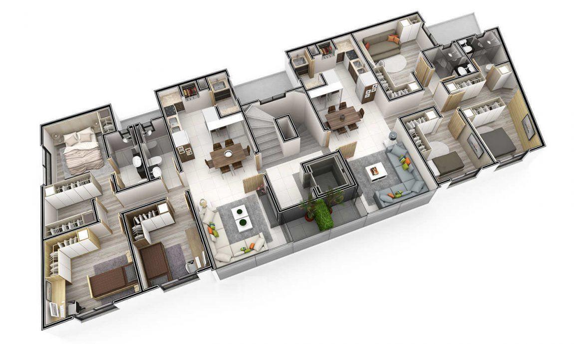 - todo rebaixado em gesso com cortineiros, rodapés de PVC, espera para ares condicionados, lavanderia separada, salas e cozinha integradas;