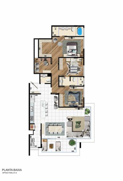 As áreas sociais dos apartamentos foram cuidadosamente desenhadas em esquadrias panorâmicas do piso ao teto, com 12 metros de comprimento, priorizando a vista de seus moradores e visitantes.