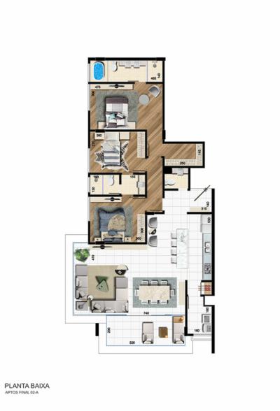 As áreas sociais dos apartamentos foram cuidadosamente desenhadas em esquadrias panorâmicas do piso ao teto, com 12 metros de comprimento, priorizando a vista de seus moradores e visitantes.