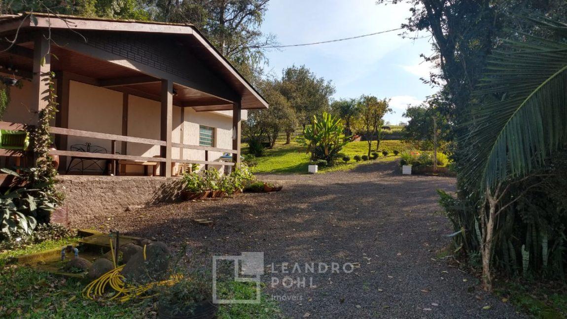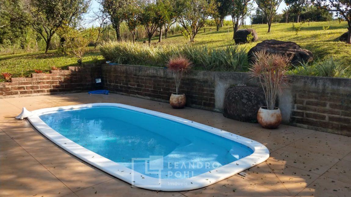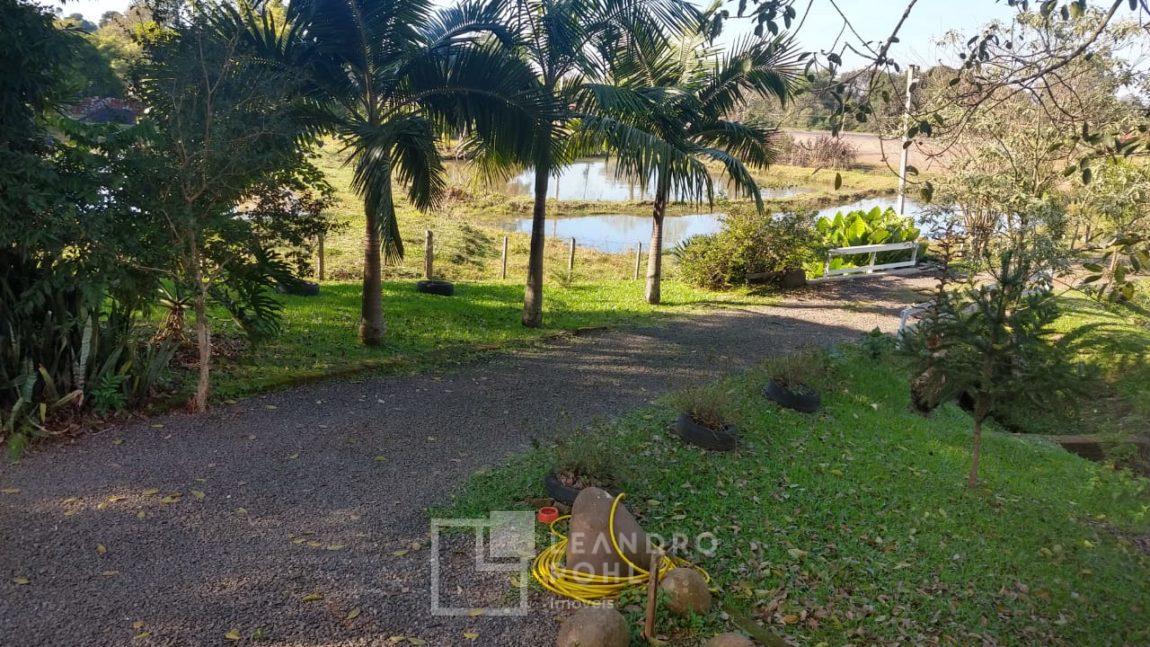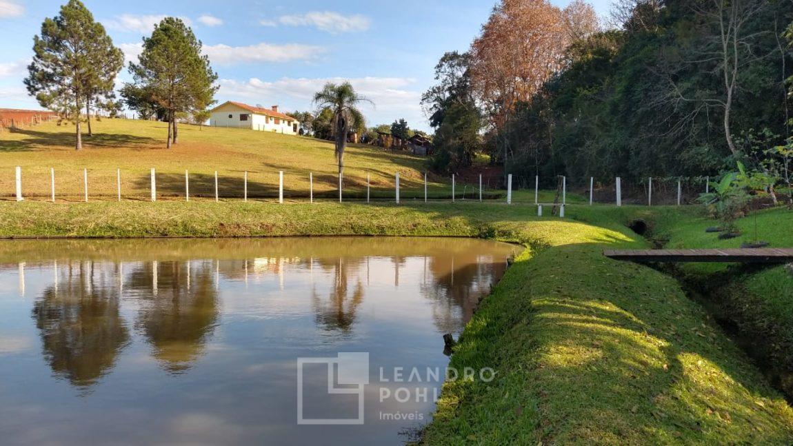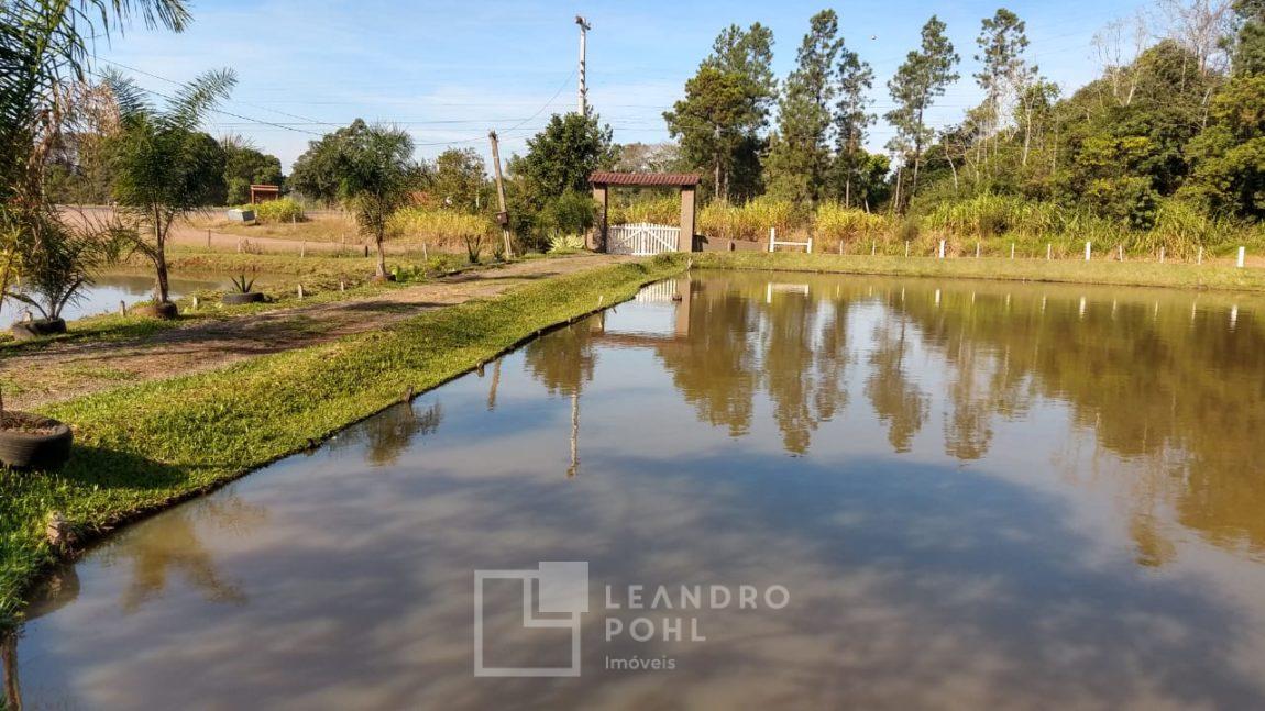 Espaço externo nos fundos com churrasqueira, coberto, mesa com 8 cadeiras em madeira; varanda para frente de um açude. No açude tem peixes em torno de 10 kg (carpa e traíra);