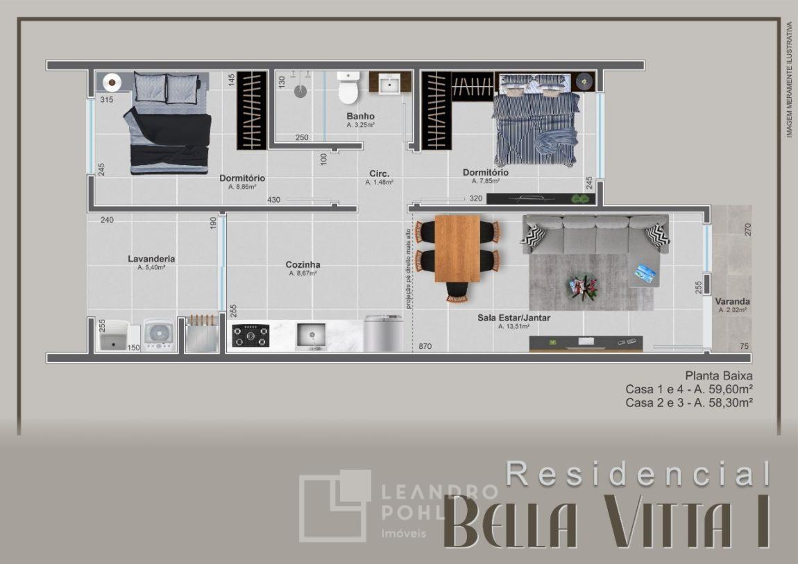 Casa 01 e 04: Área de 59,60 m² com dois dormitórios, pátio na frente e nos