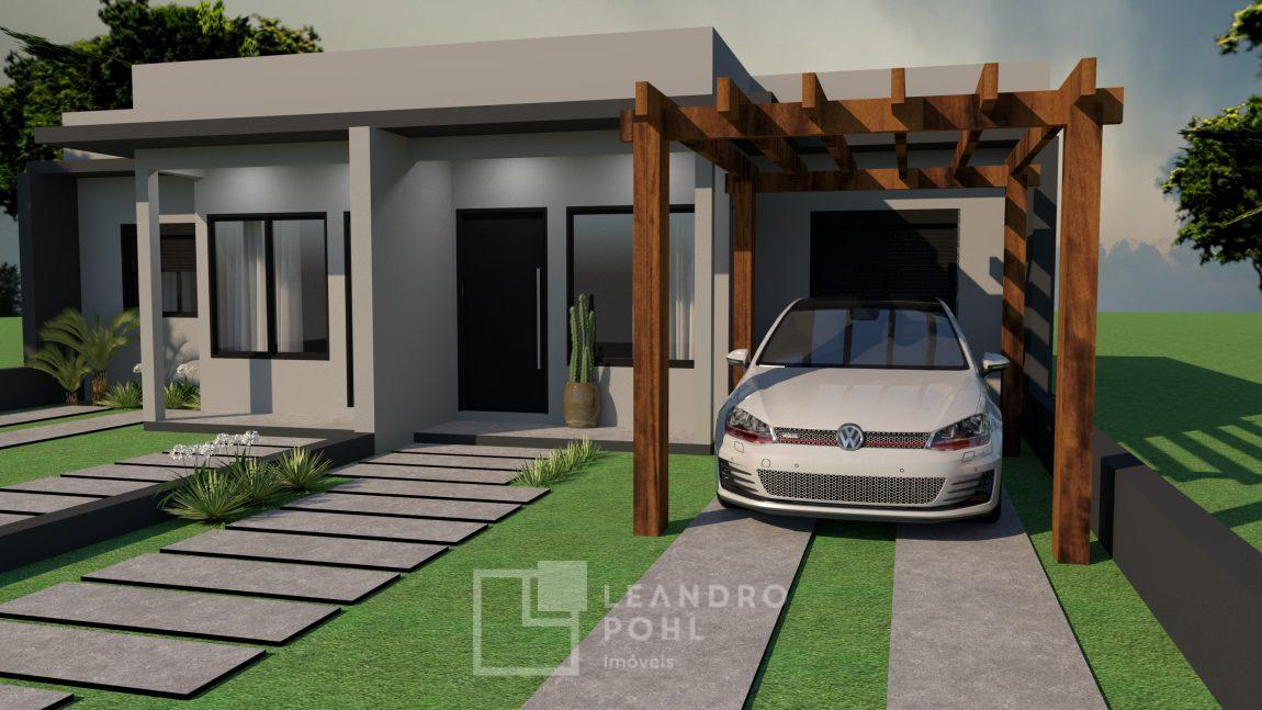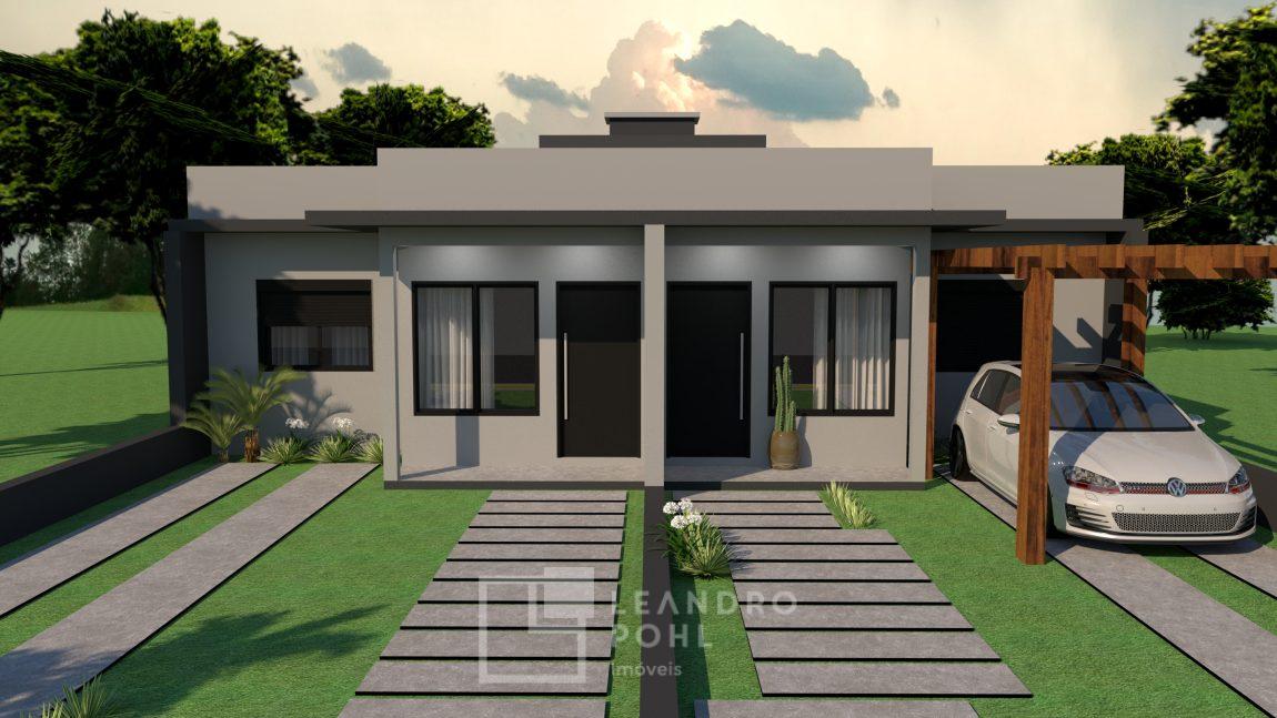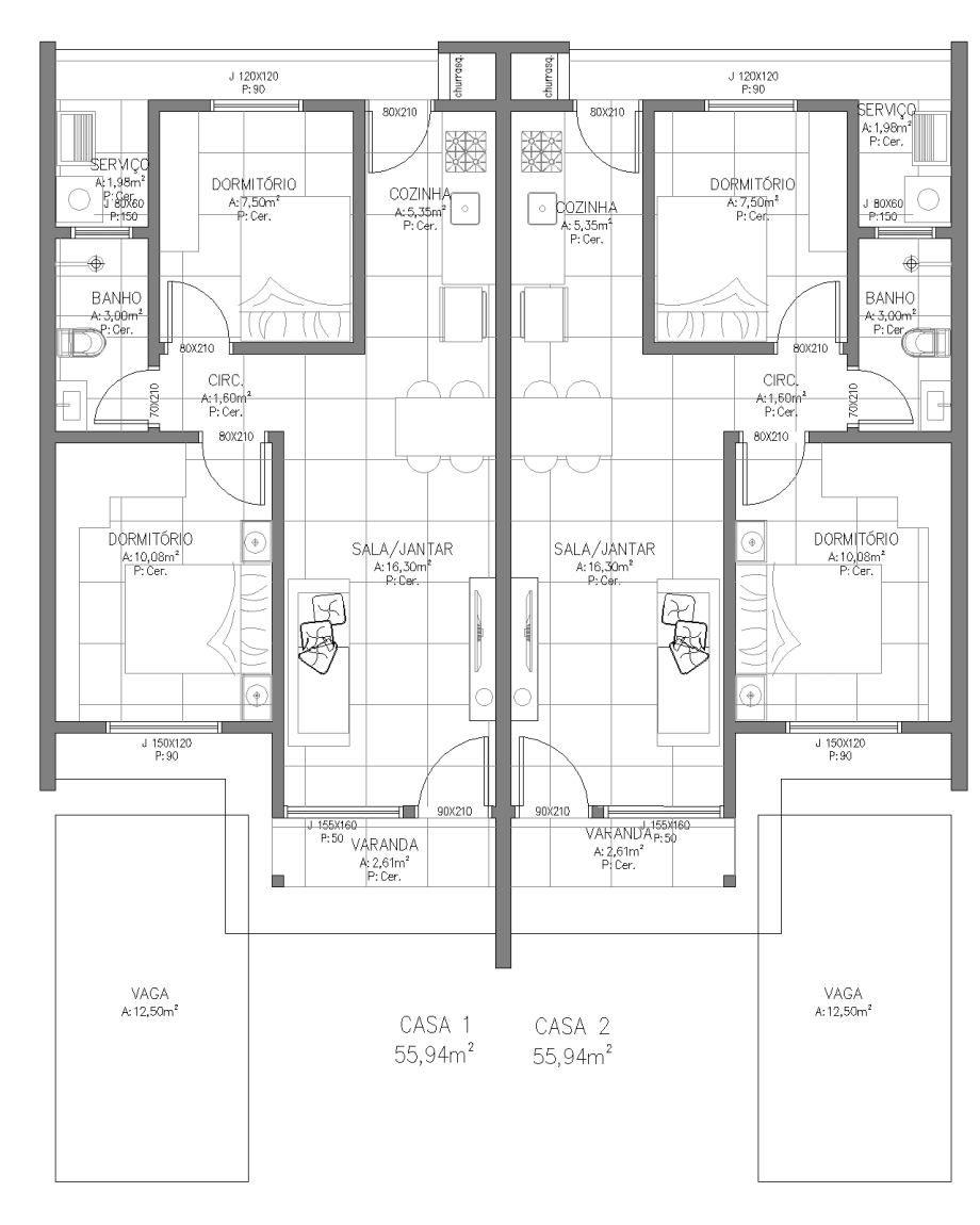 Casa geminada, de 2 dormitórios, 55,94m², banheiro social, churrasqueira (externa com aba), sala de estar, jantar e cozinha integrados, área de serviço (externa com aba), 01 vaga de garagem (possibilidade de 02 veículos um atrás do outro).