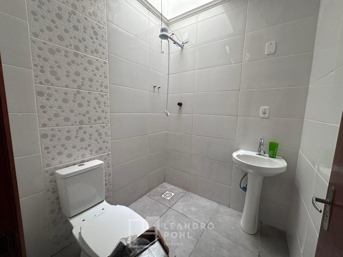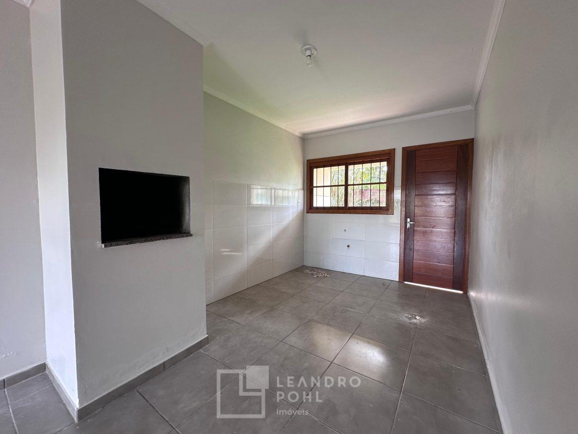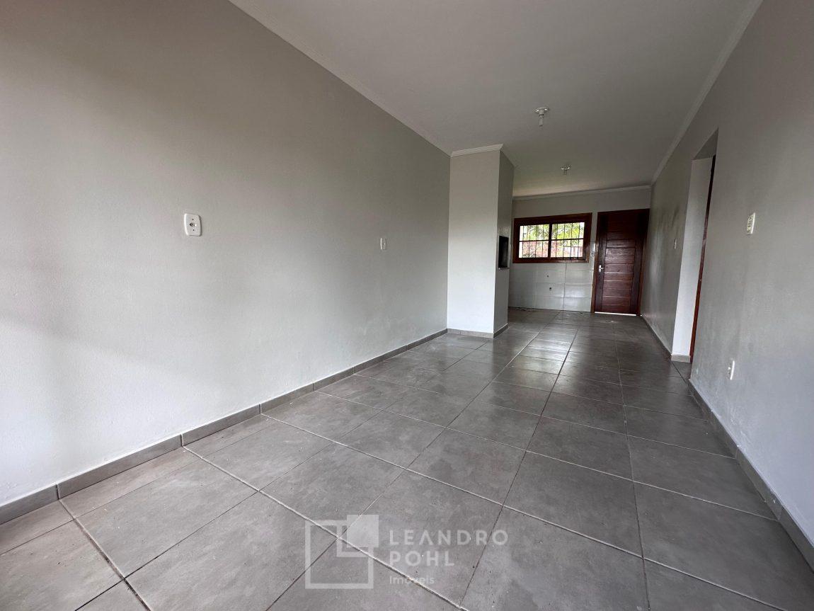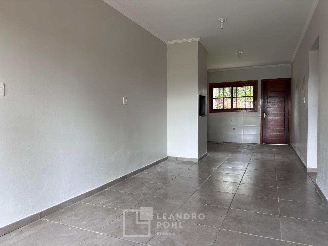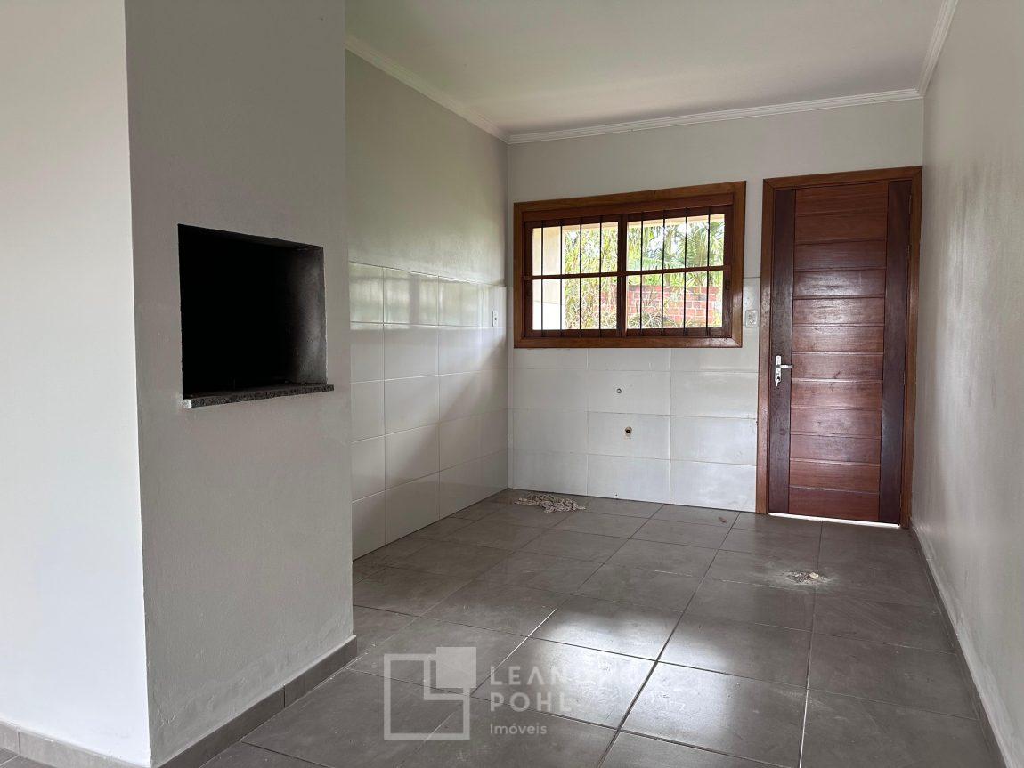 Casa geminada com 2 dormitórios, amplo pátio nos fundos, em piso cerâmico, cozinha e sala conjugadas, churrasqueira, não cercada.