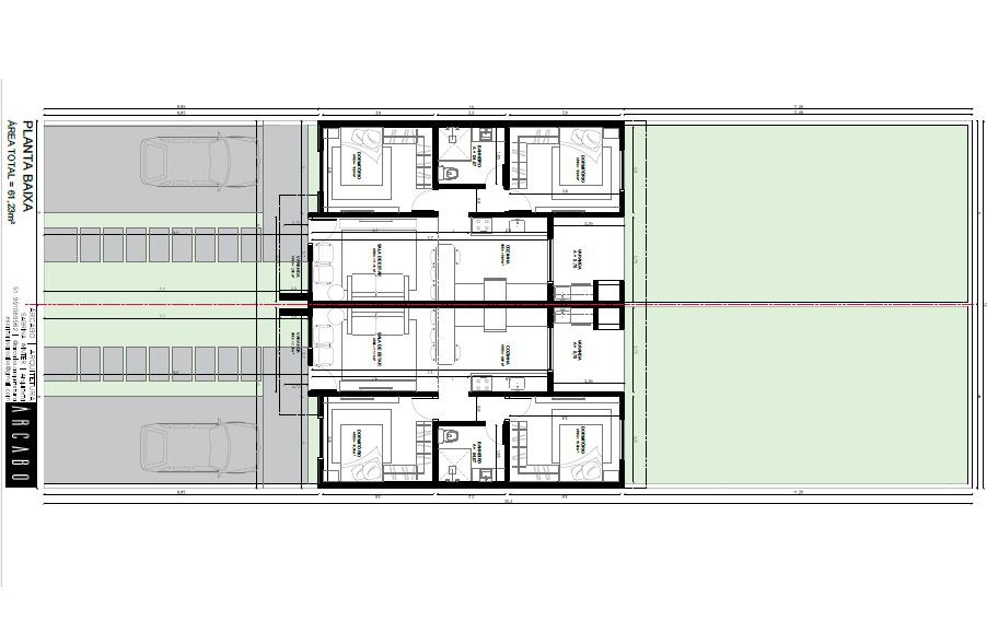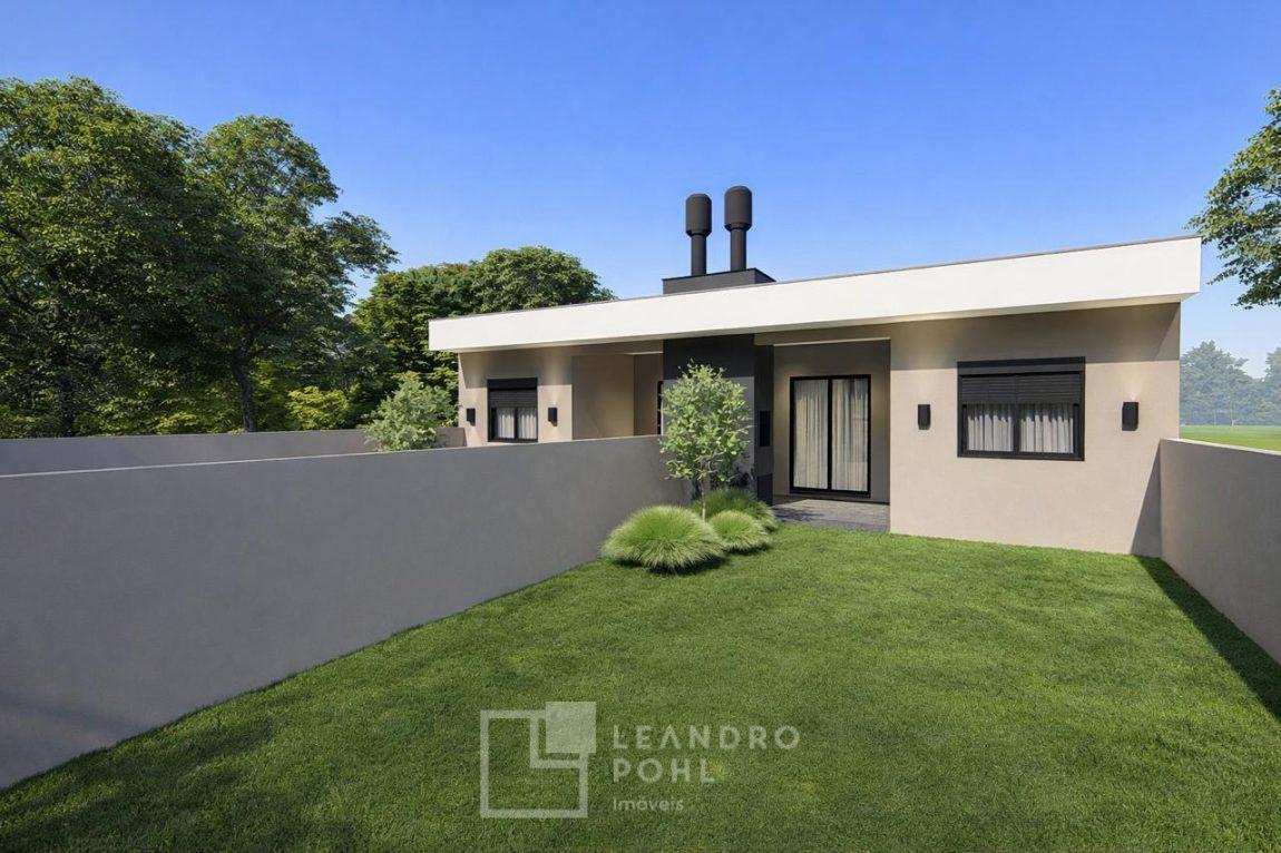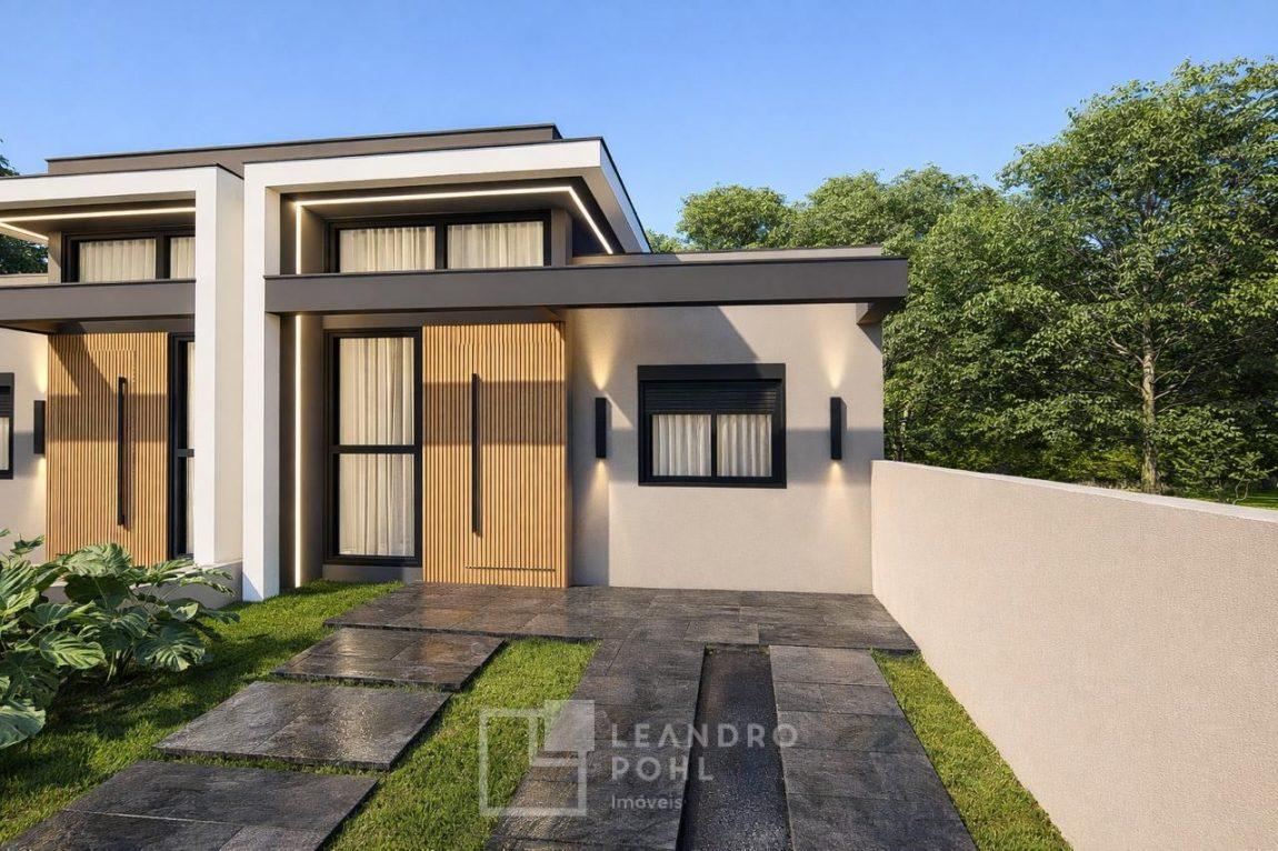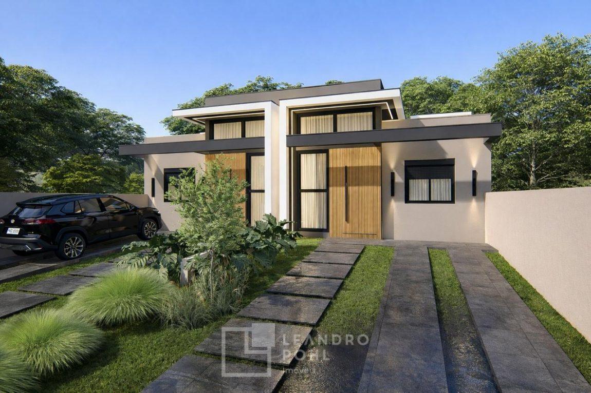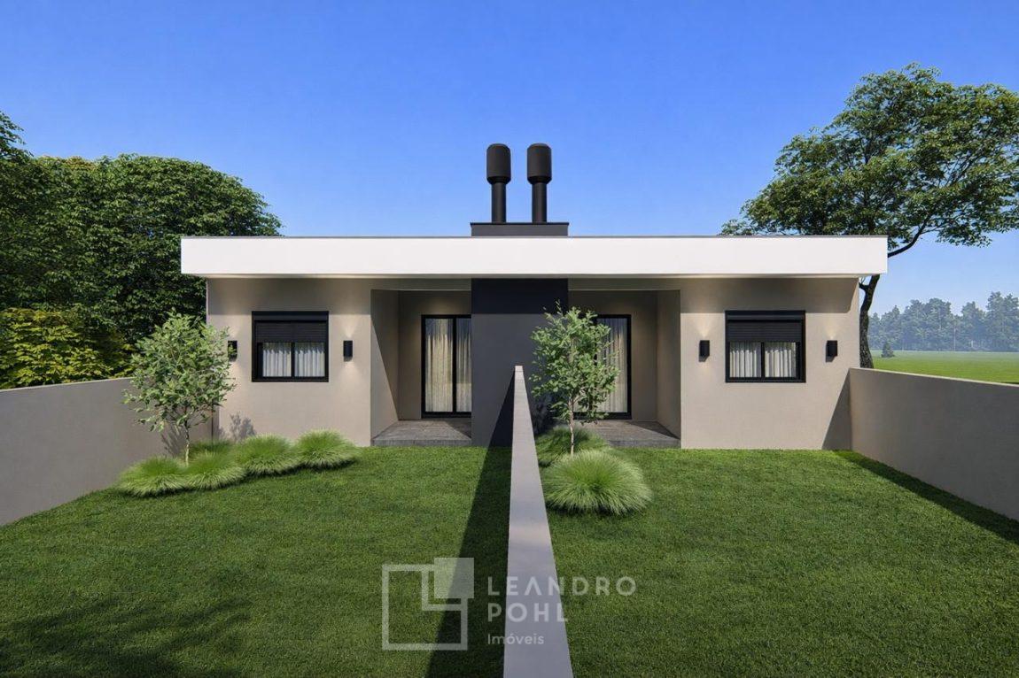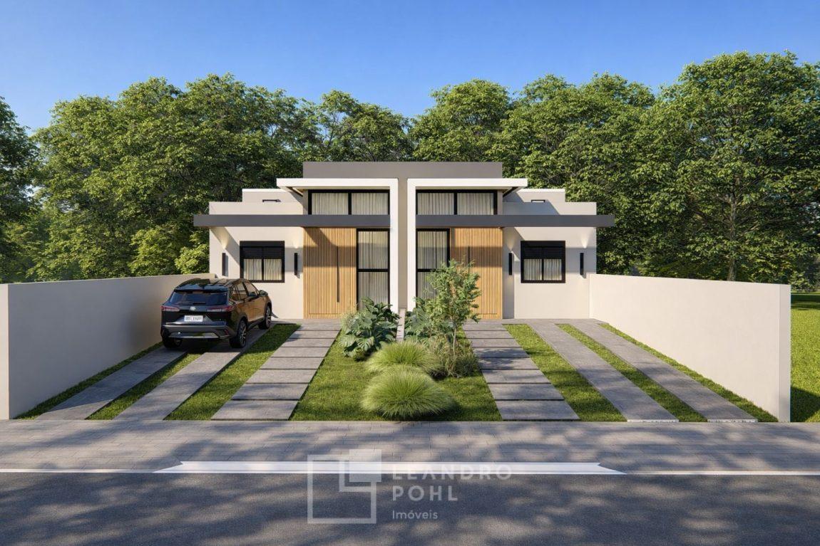 Casa geminada com 61,23 m², composta por 2 dormitórios, Sala de estar, Sala de jantar, Churrasqueira externa, Cozinha, Lavanderia, 1 banheiro social, Garagem (possibilidade de 02 veículos um atrás do outro), Pé direito alto, Amplo pátio, divisas: Mureta na frente e fundos muro 1,6m, Frente: Gramado., Fundo: Coberto com brita., Trilhos: Concreto na rampa para o carro e pisantes até a entrada