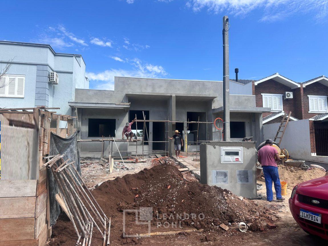 Casa geminada 2 dormitórios, suíte, banheiro social, pé direito alto na sala e cozinha, piso porcelanato, churrasqueira, pátio murado nos fundos, vaga de estacionamento para dois carros.