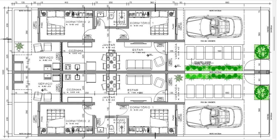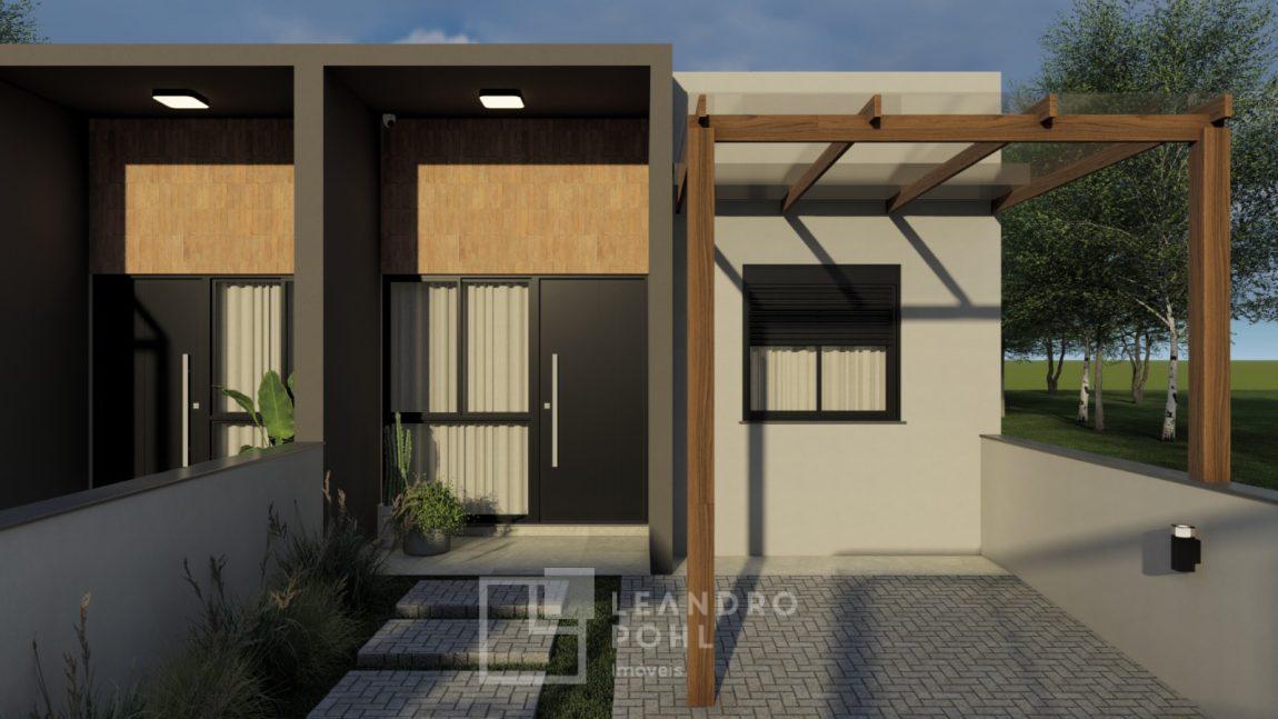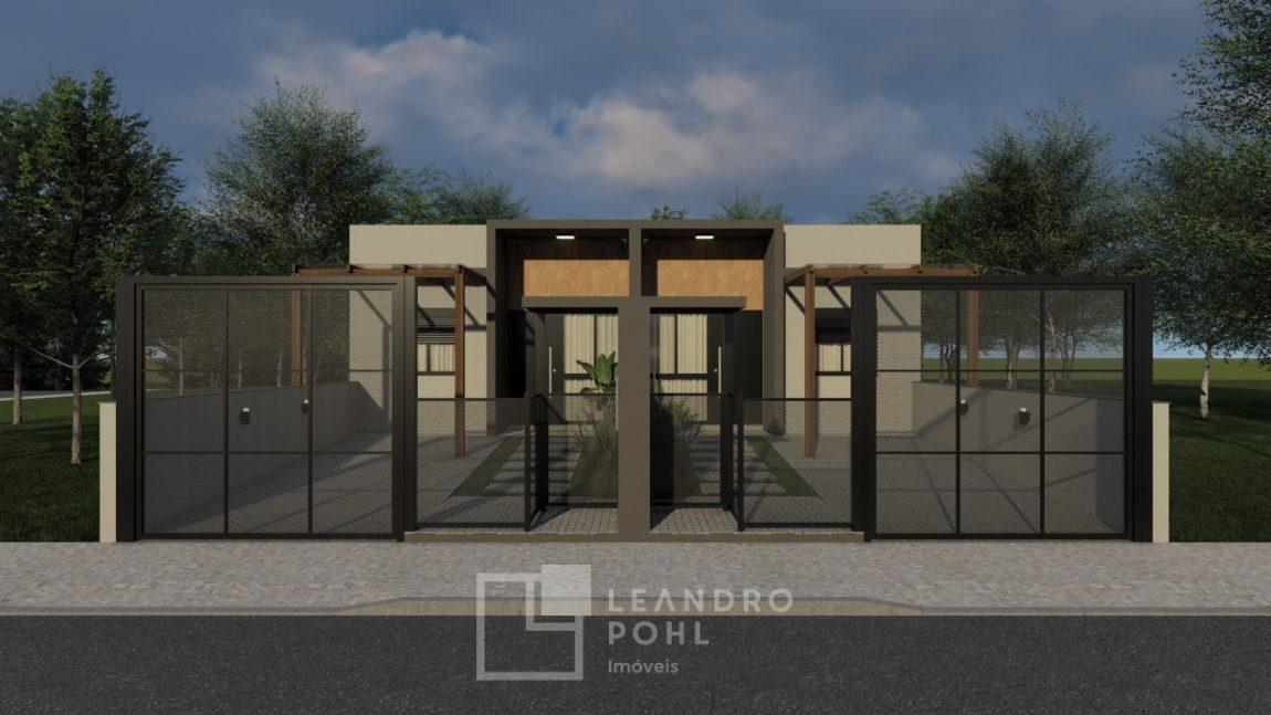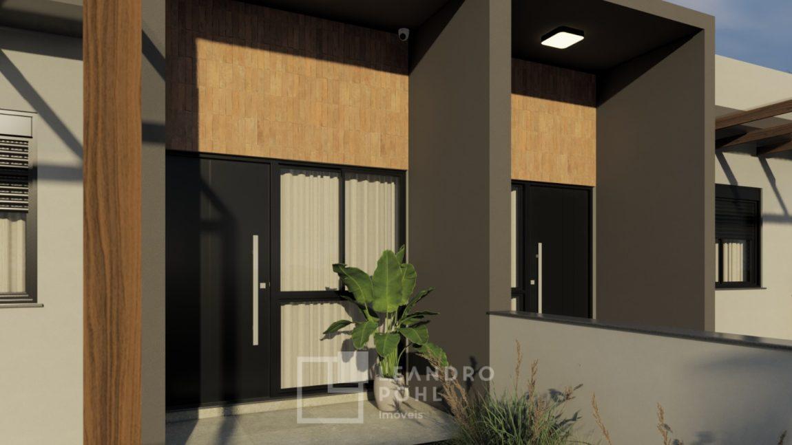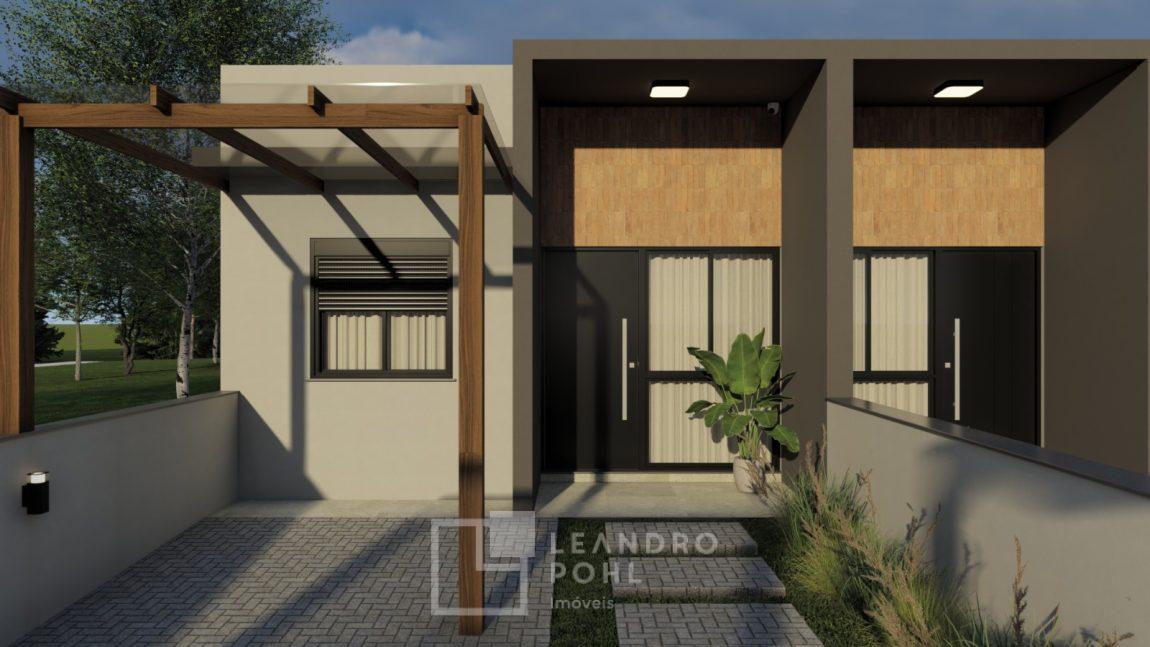 Casa geminada de alvenaria, 2 dormitórios, somente 2 unidades em lote, acabamento em massa corrida, varanda, piso cerâmico retificado, banheiro com nicho na área de banho, churrasqueira, cercada, vaga de estacionamento, calçada, jardim com automação das luzes, grades.