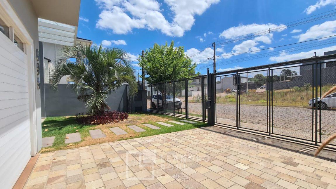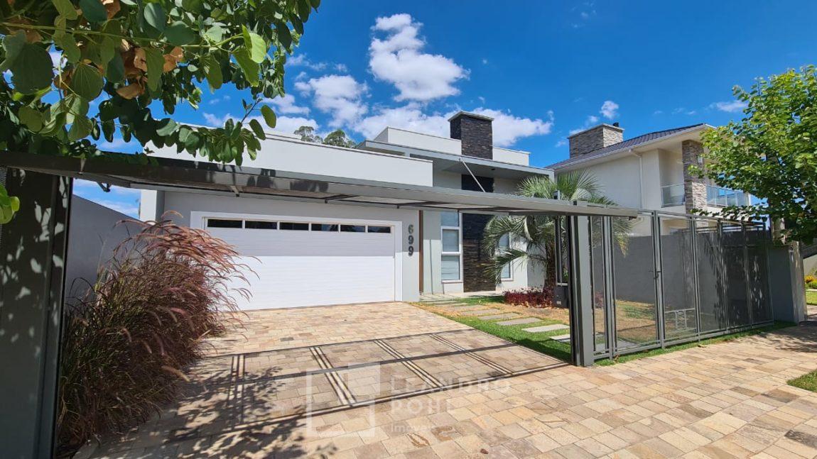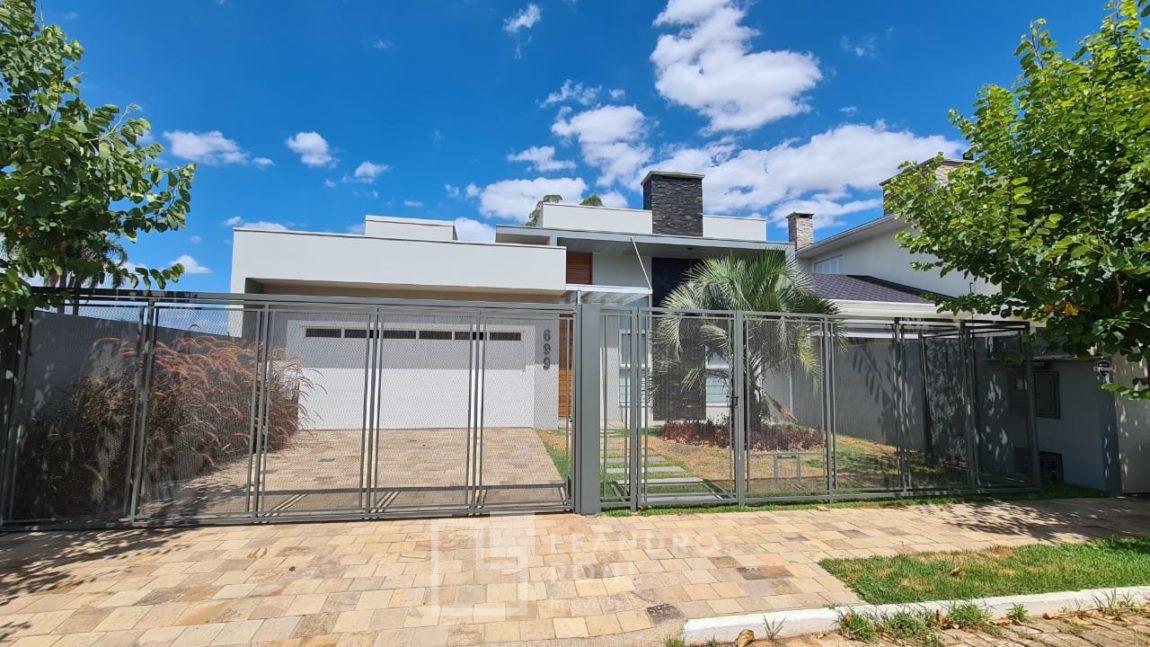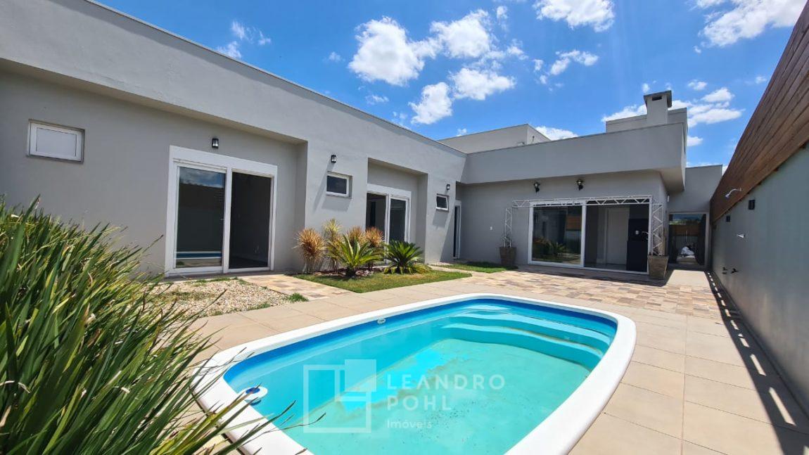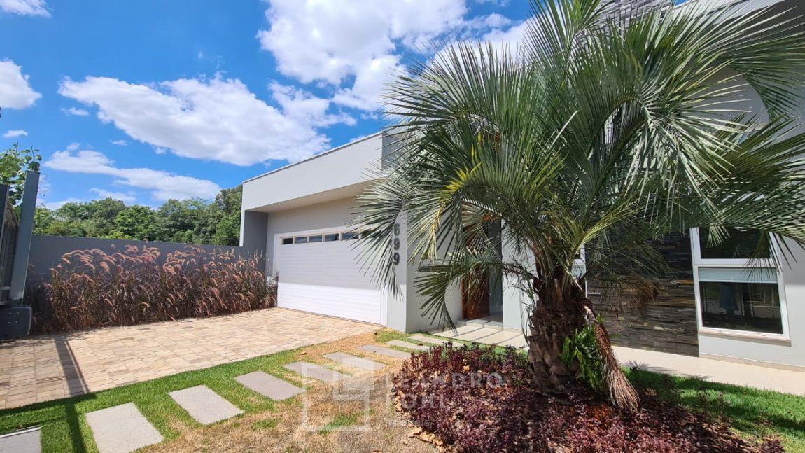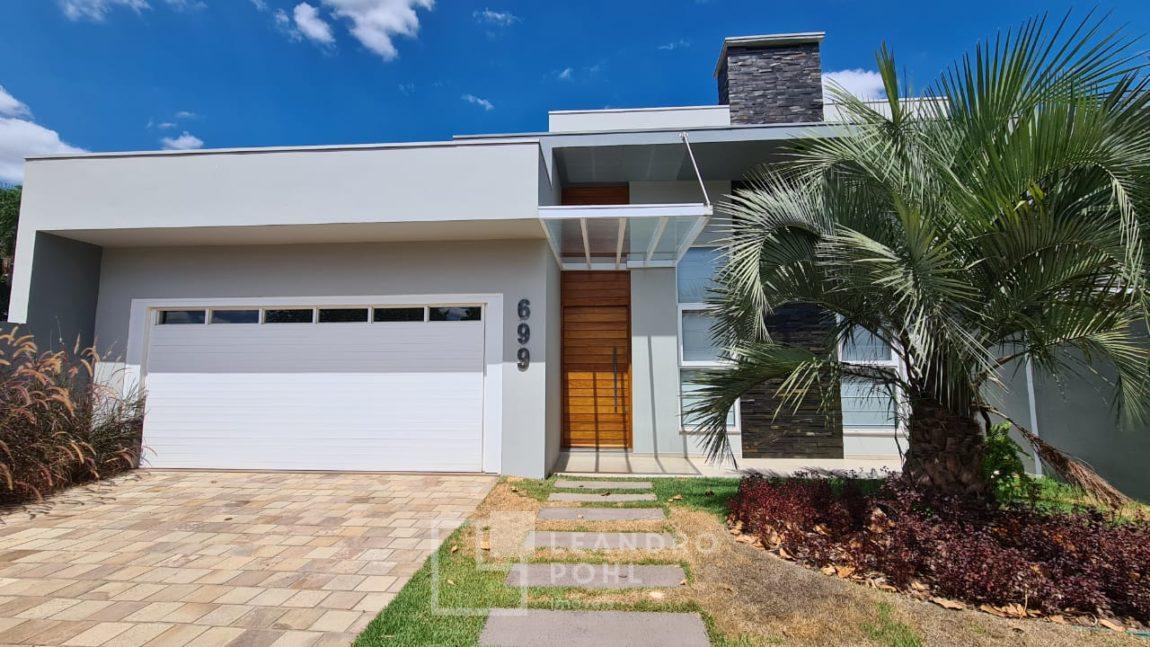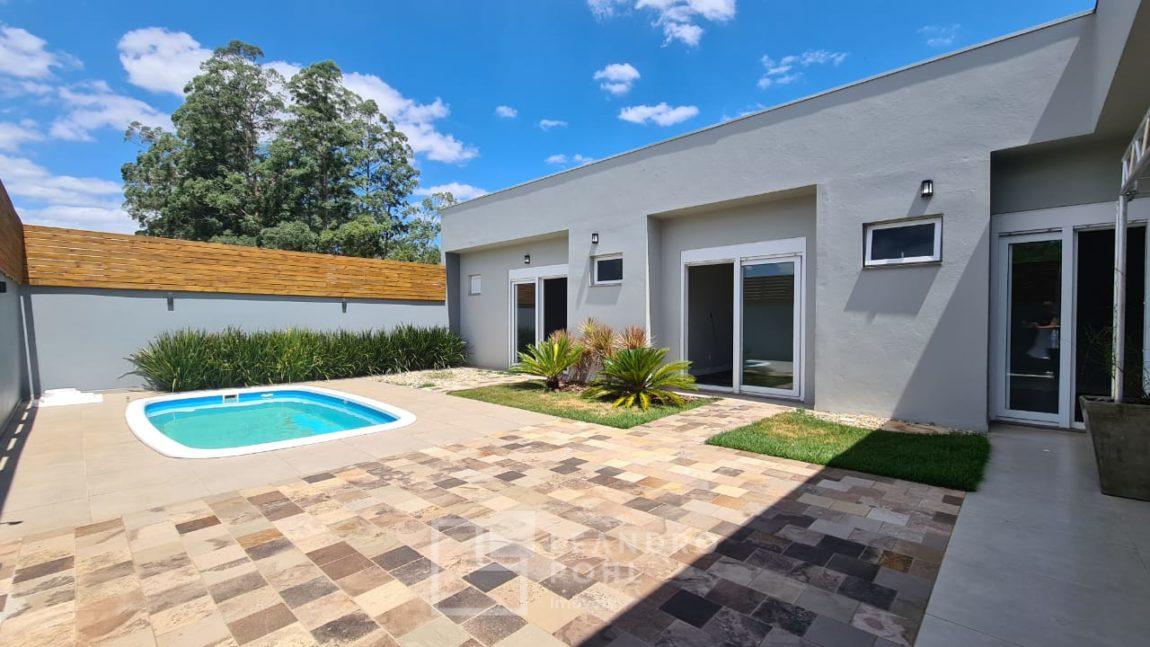 Casa plana com pé direito duplo na sala, acabamento em gesso, parrilla uruguaia, lavabo, piscina, amplo pátio com paisagismo, espera para placas solares no telhado e para automação, 1 suite master e 2 suítes americanas, murada, cercada com portão eletrônico,