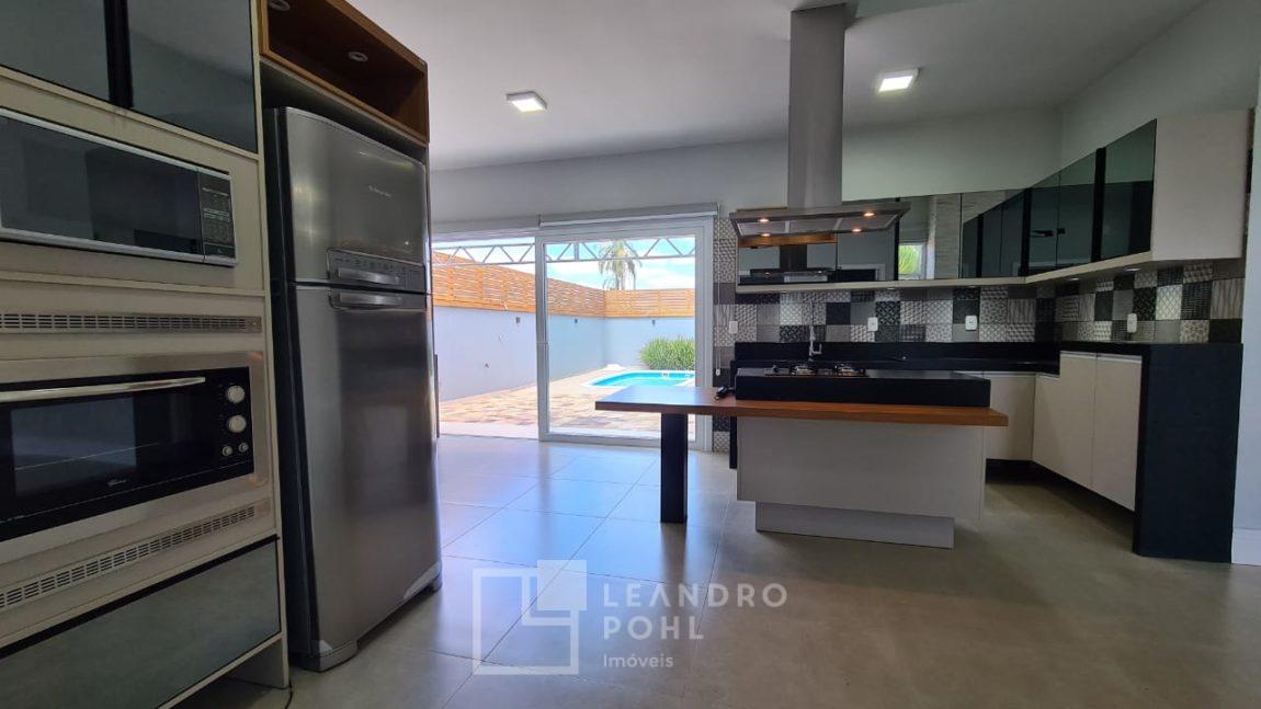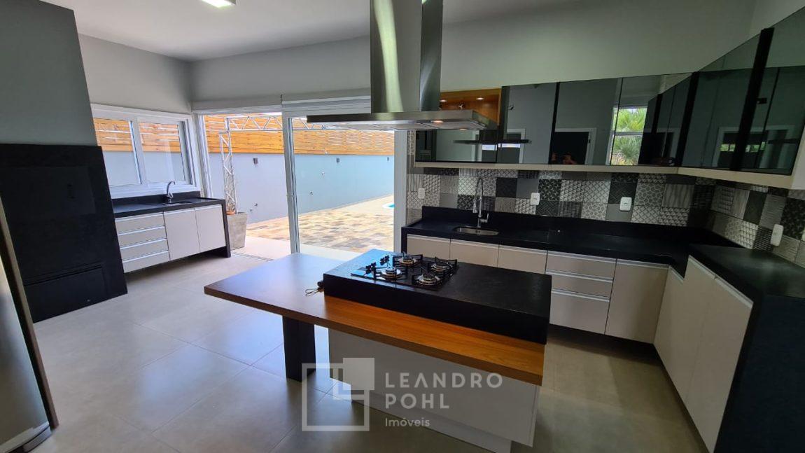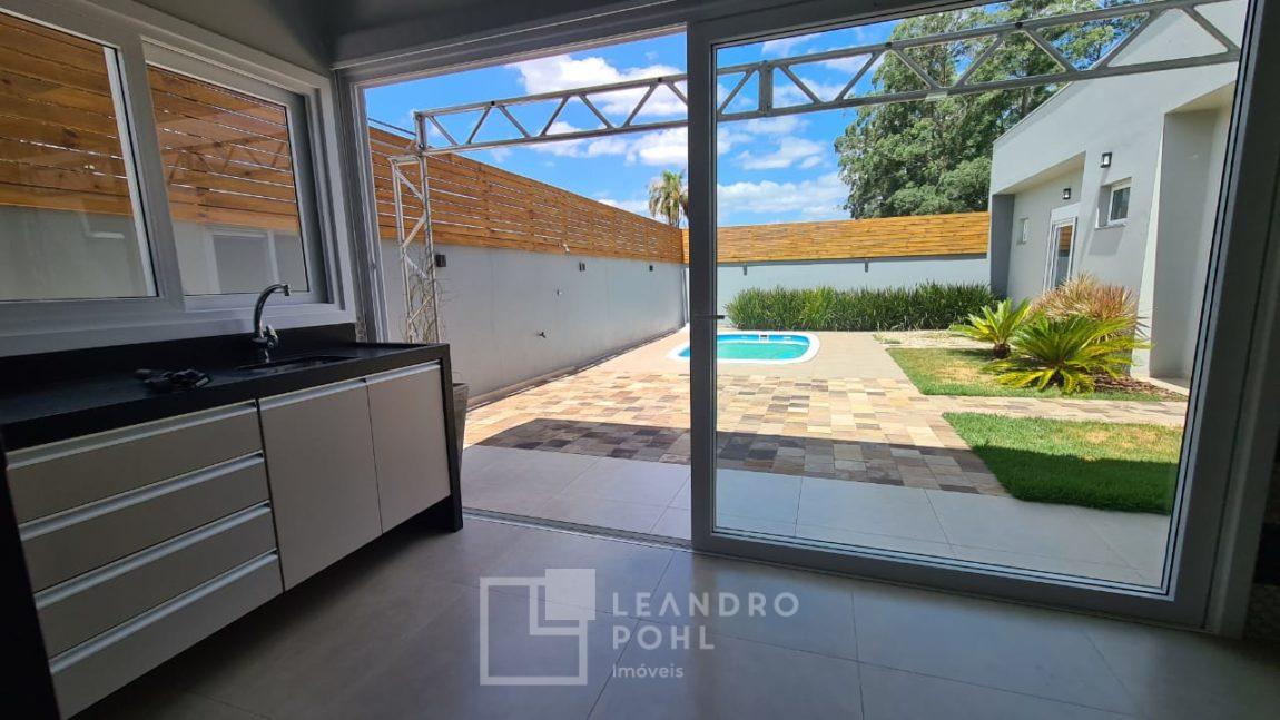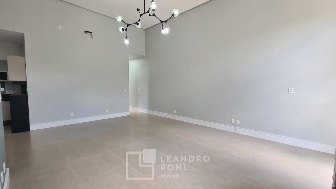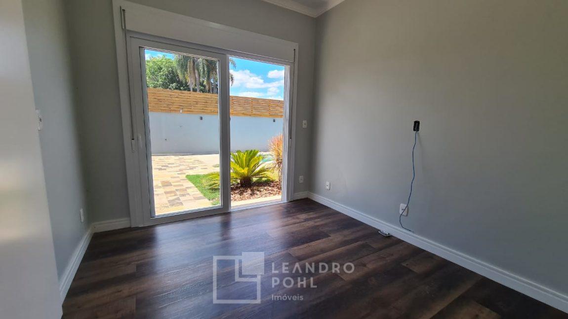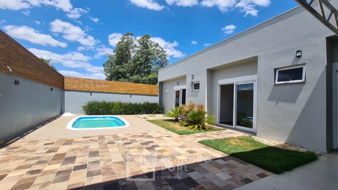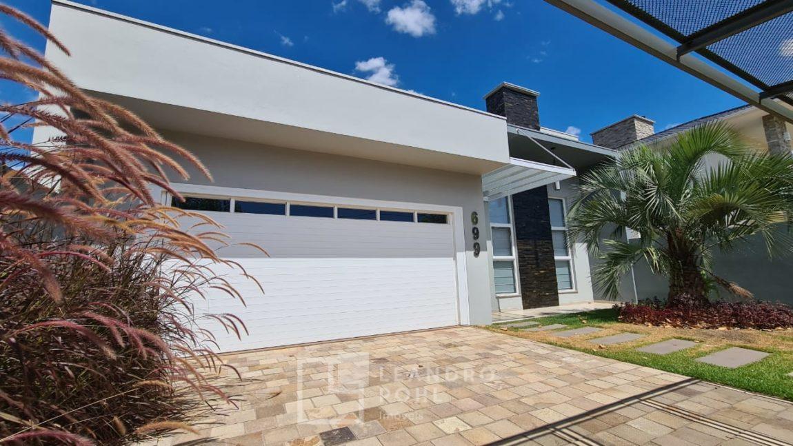Casa plana com pé direito duplo na sala, acabamento em gesso, parrilla uruguaia, lavabo, piscina, amplo pátio com paisagismo, espera para placas solares no telhado e para automação, 1 suite master e 2 suítes americanas, murada, cercada com portão eletrônico,