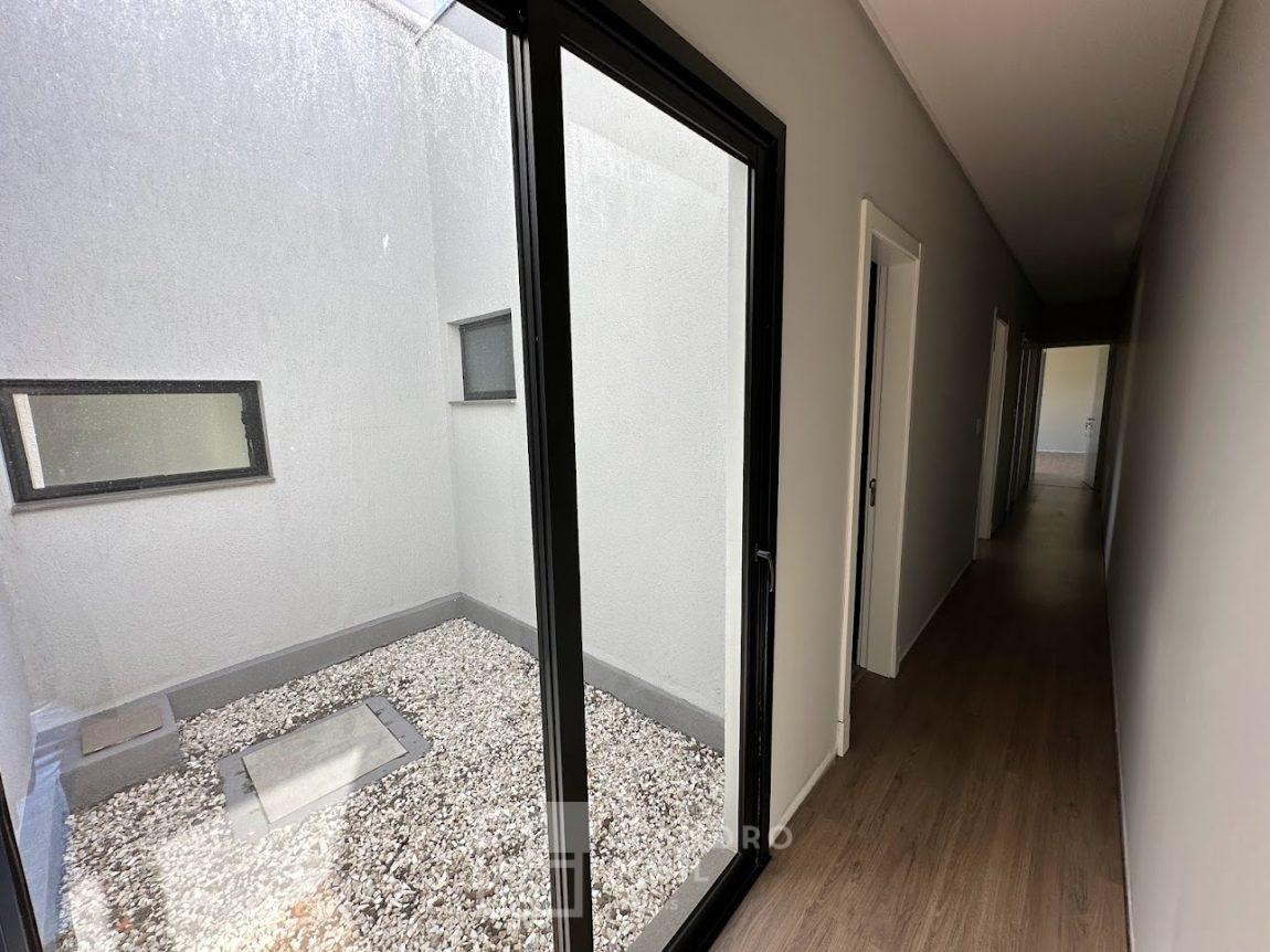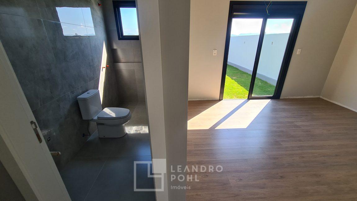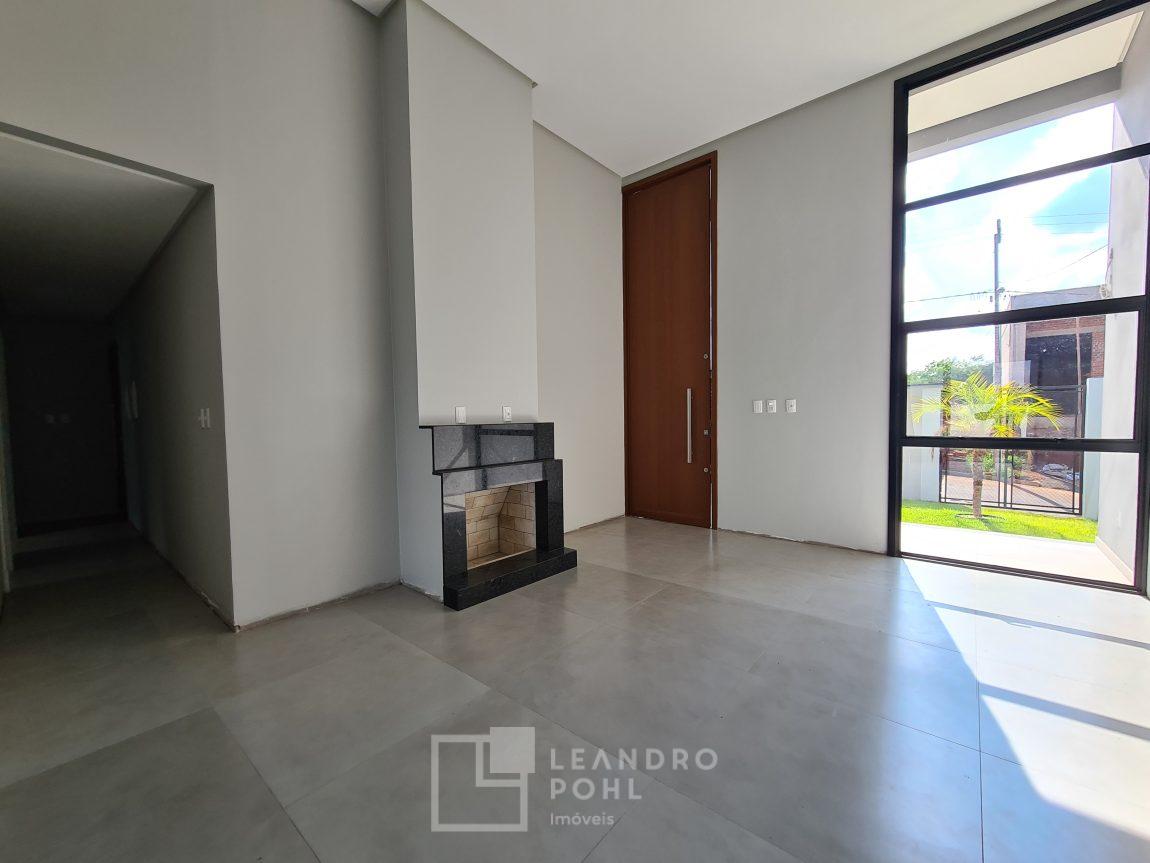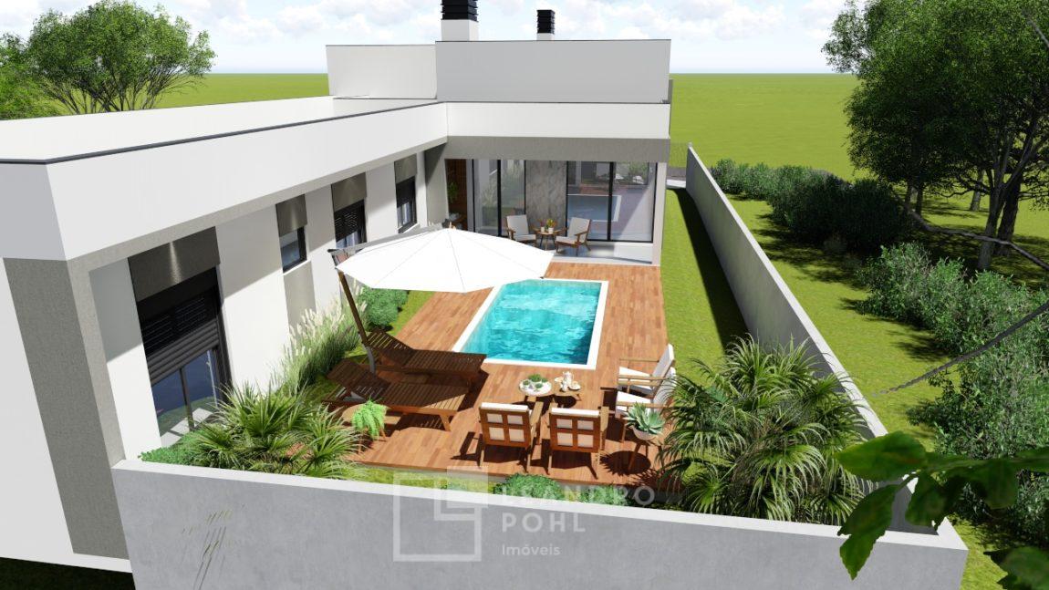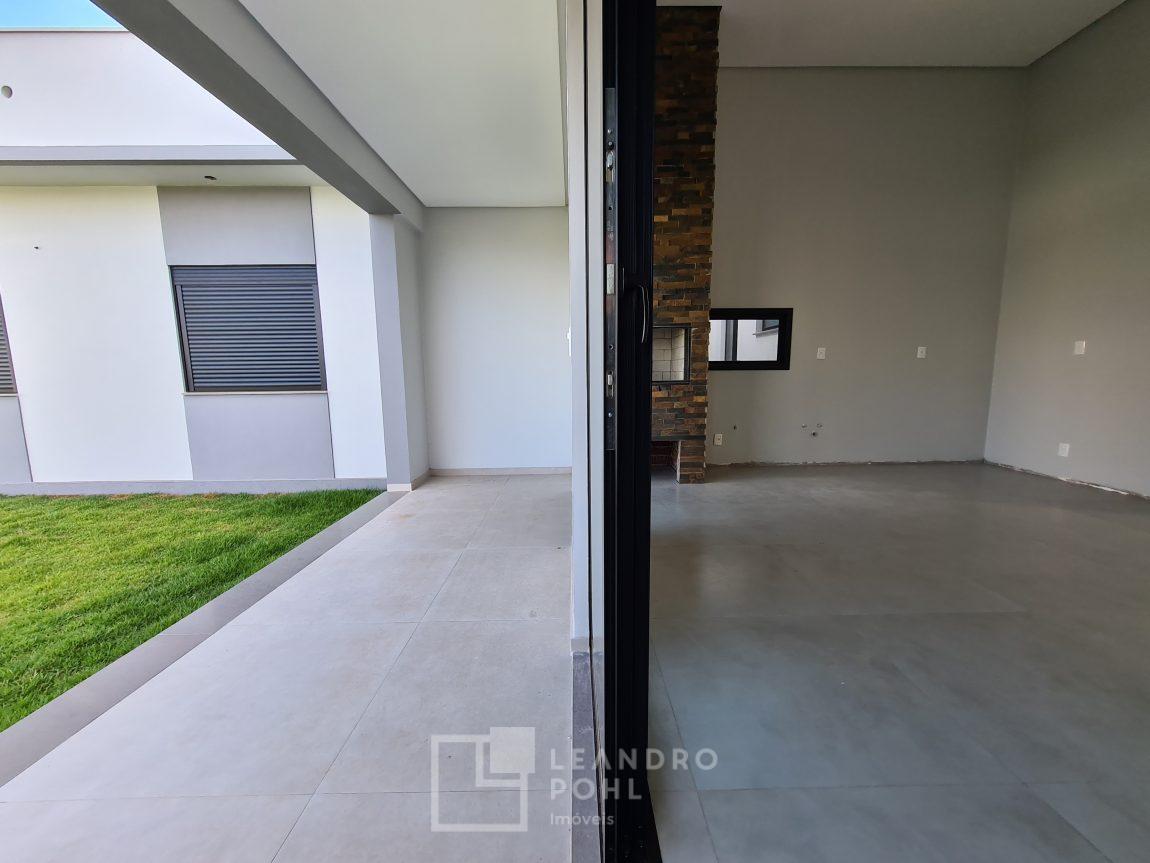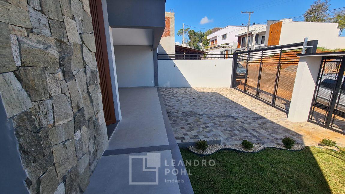 Casa plana, executada em alvenaria com área total de 182,20m² de área construída, são 3 dormitórios, sendo uma suíte, banheiro social e lavabo, área de serviço separada, churrasqueira, aberturas em alumínio, jardim de inverno, revestimentos internos em porcelanato no piso da área social, corredor e dormitórios em laminado, acabamento de fachada com detalhe em pedra natural, calçada em basalto regular e piso tátil, forro rebaixo de gesso em todos ambientes, esperas para split (dormitórios e estar), água quente (aquecimento a gás),cabeamento pra sistema de segurança, frente oeste.