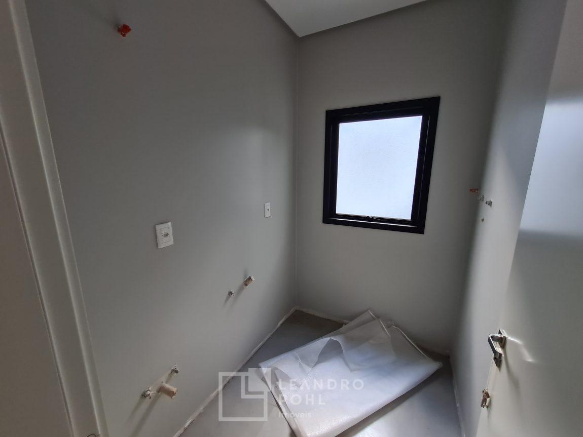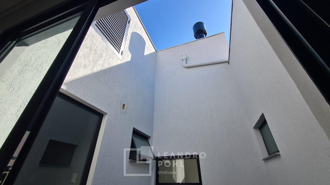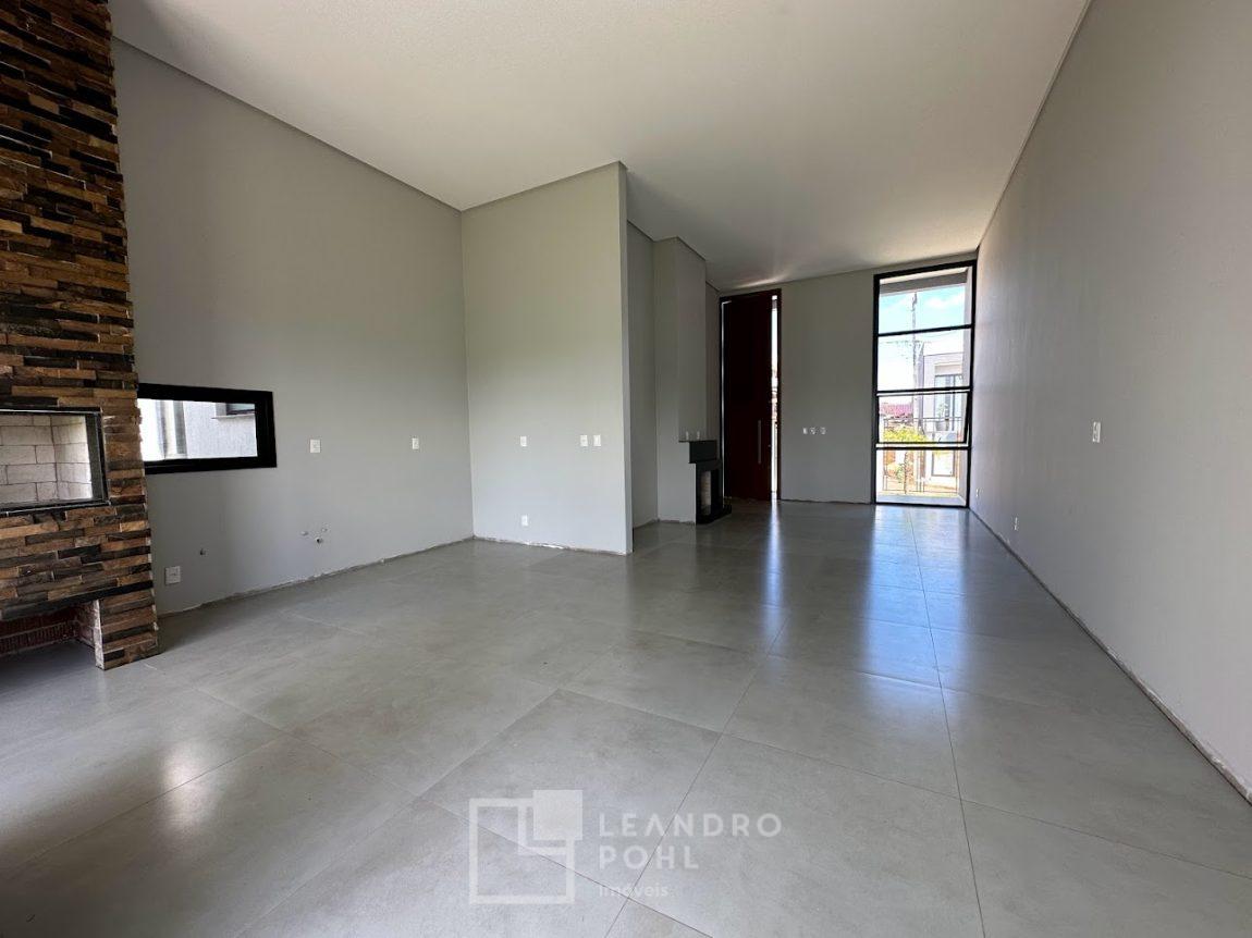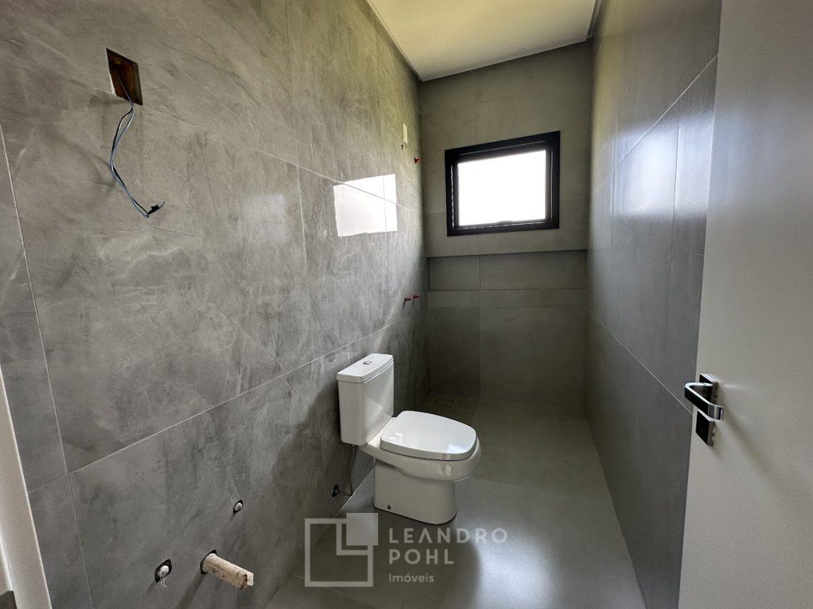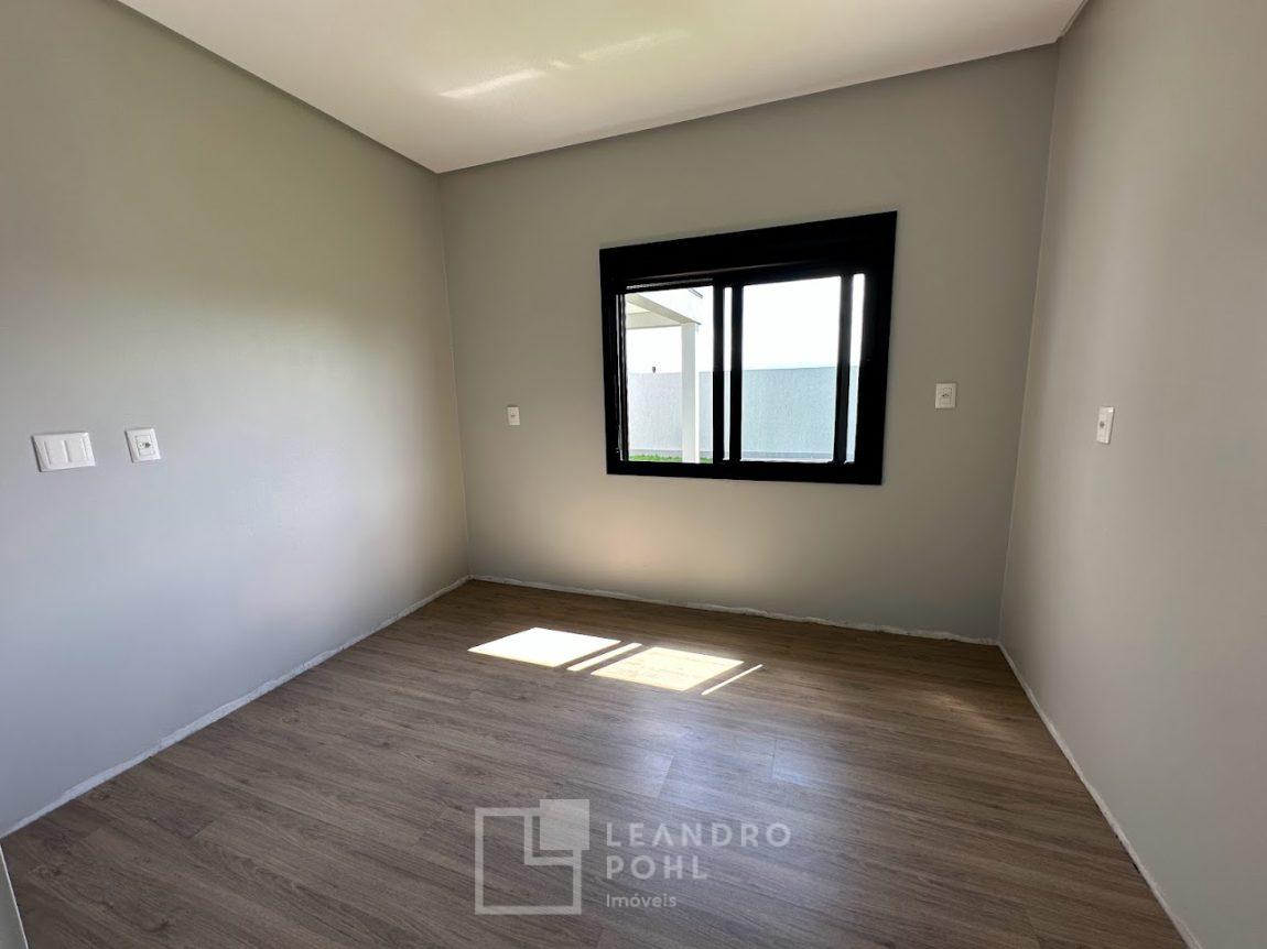 Casa plana, executada em alvenaria com área total de 182,20m² de área construída, são 3 dormitórios, sendo uma suíte, banheiro social e lavabo, área de serviço separada, churrasqueira, aberturas em alumínio, jardim de inverno, revestimentos internos em porcelanato no piso da área social, corredor e dormitórios em laminado, acabamento de fachada com detalhe em pedra natural, calçada em basalto regular e piso tátil, forro rebaixo de gesso em todos ambientes, esperas para split (dormitórios e estar), água quente (aquecimento a gás),cabeamento pra sistema de segurança, frente oeste.
