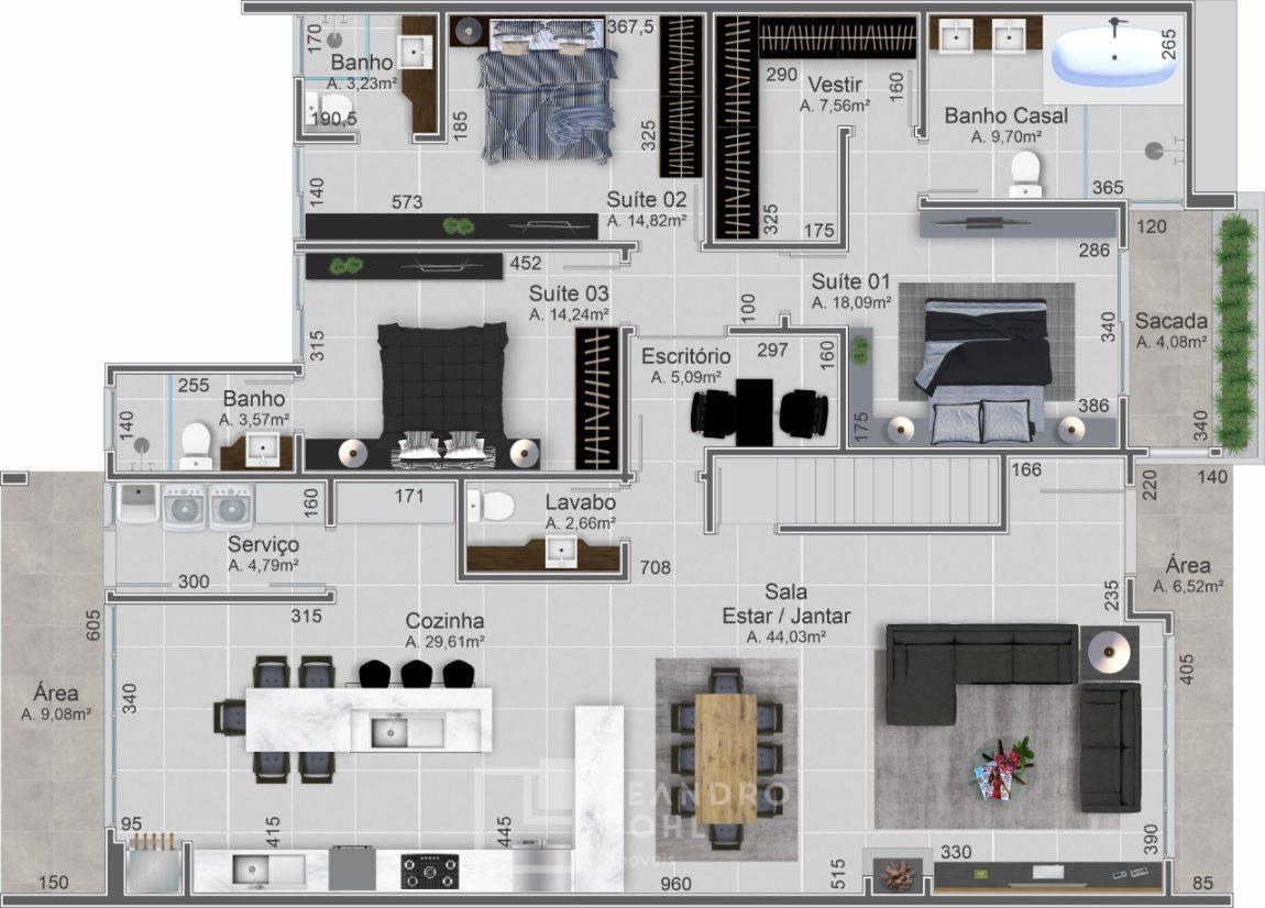 - Sala de estar, jantar e espaço gourmet integrados e com 4 m de pé direito,