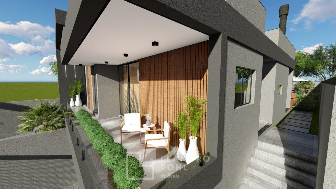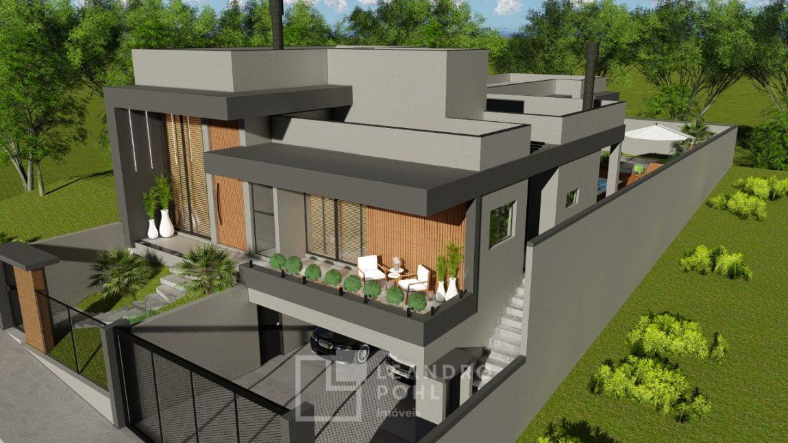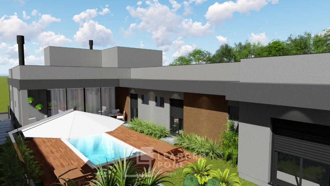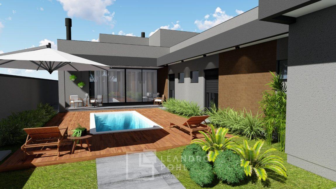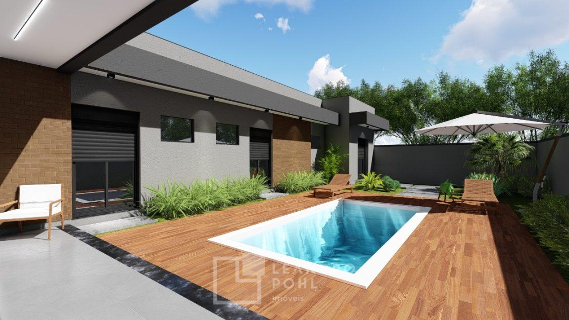Habitação Unifamiliar térrea. A edificação será executada de forma convencional em alvenaria e concreto com área aproximada de 280m² de área construída com piscina e deck.