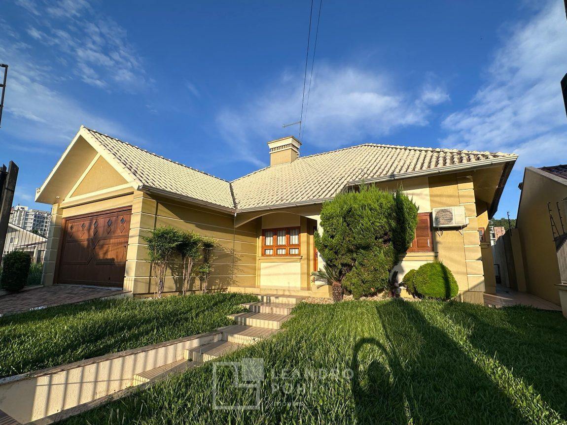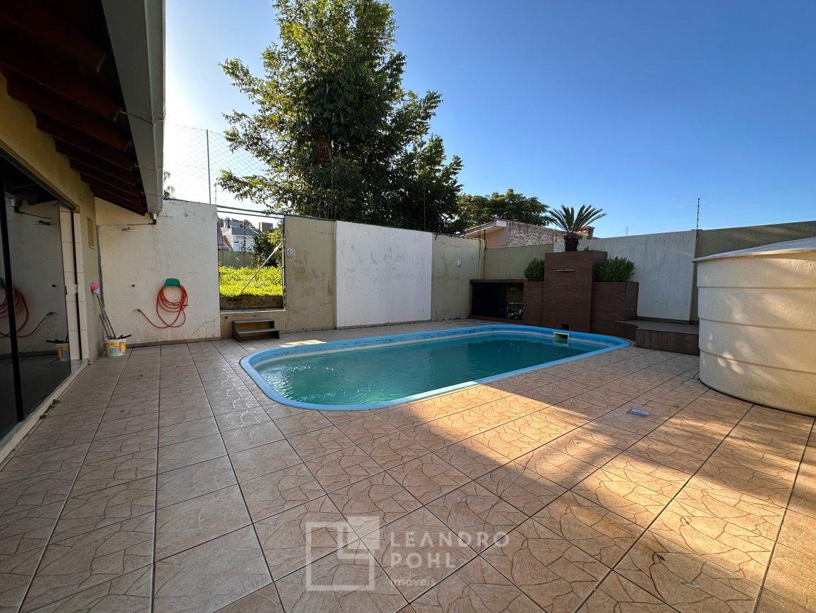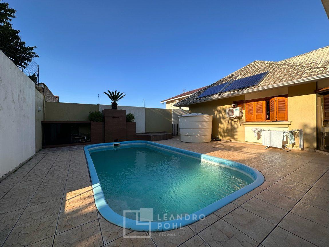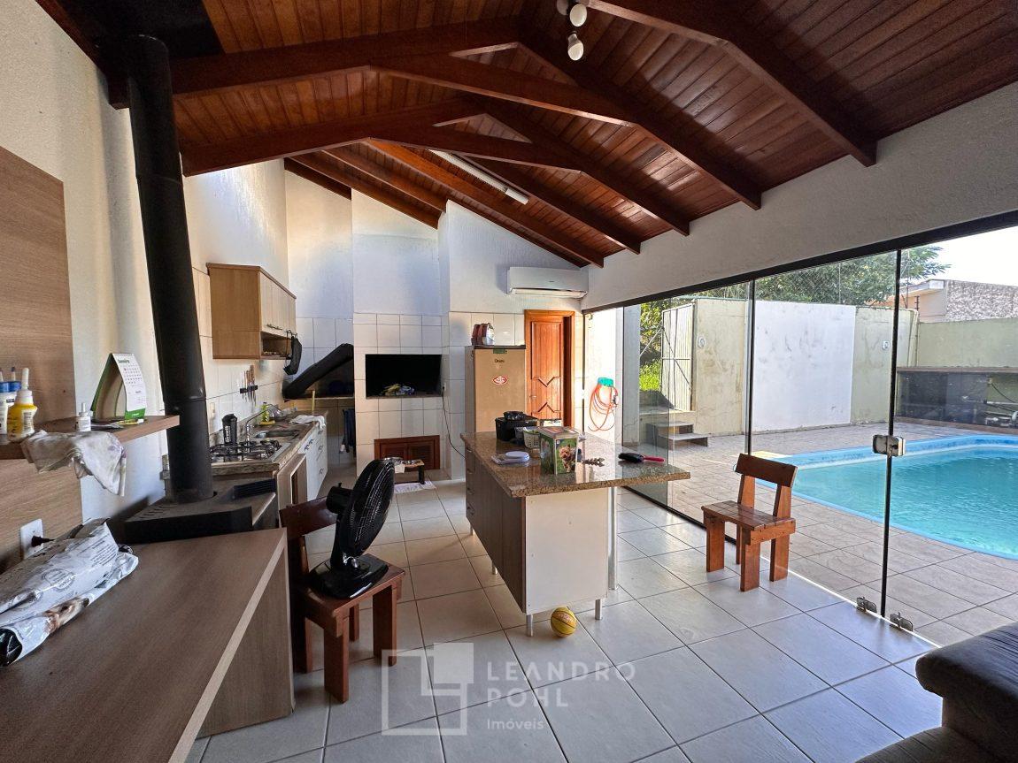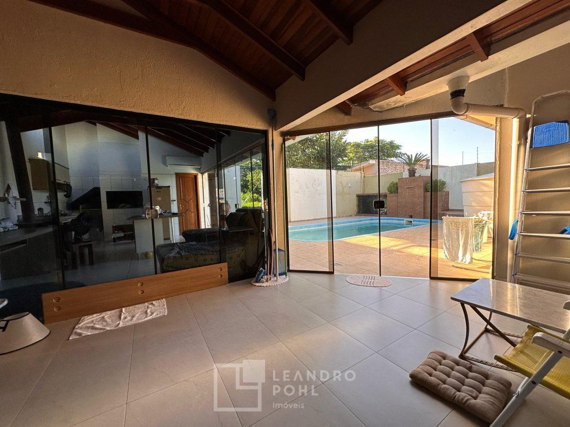 Casa plana no loteamento Verdes Vales, 3 dormitórios, sendo uma suíte e dois banheiros, cozinha com móveis projetados, sala de estar e jantar, sala com lareira, piso cerâmico, espaço gourmet e quiosque, piscina com aquecimento, duas churrasqueiras, duas lareiras, casa murada e cercada, possui aquecimento a gás e portão eletrônico, cisterna.