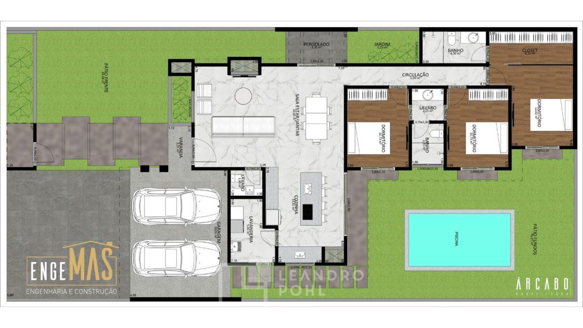 Casa plana 3 dormitórios, uma suíte e uma americana, integração social, pé direito de 4m, forro em gesso em toda edificação, reboco interno com acabamento em gesso