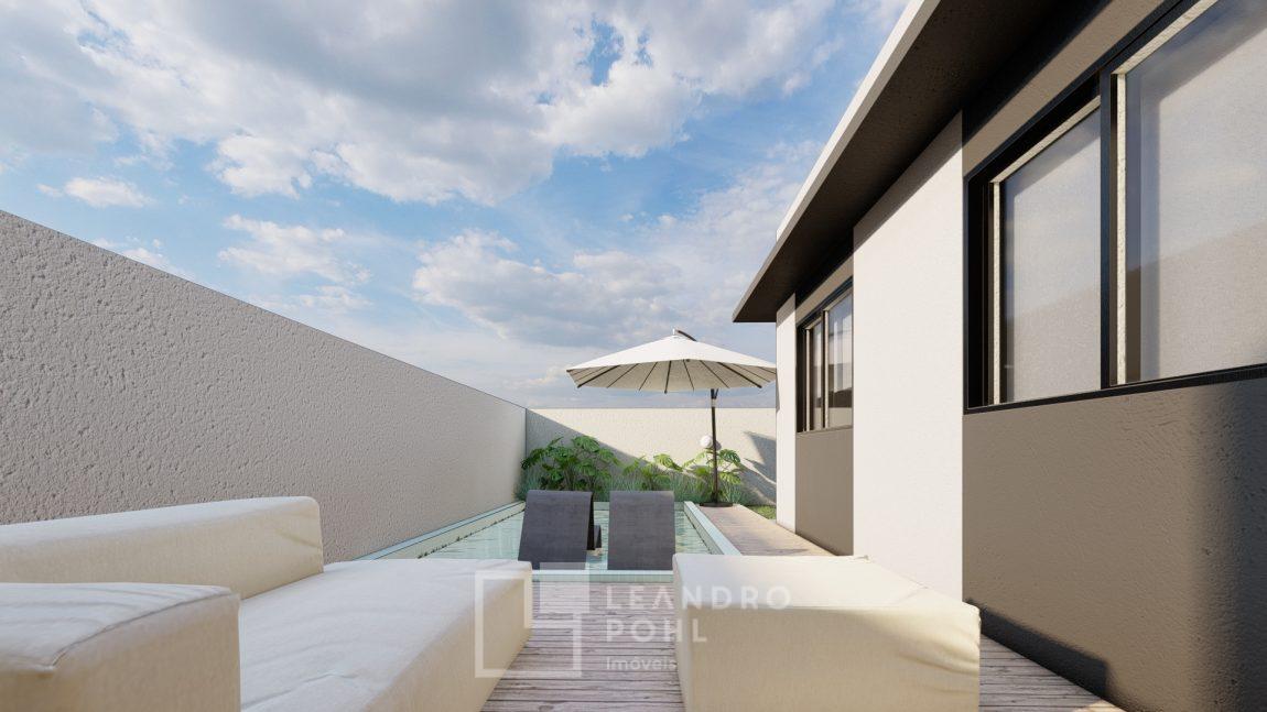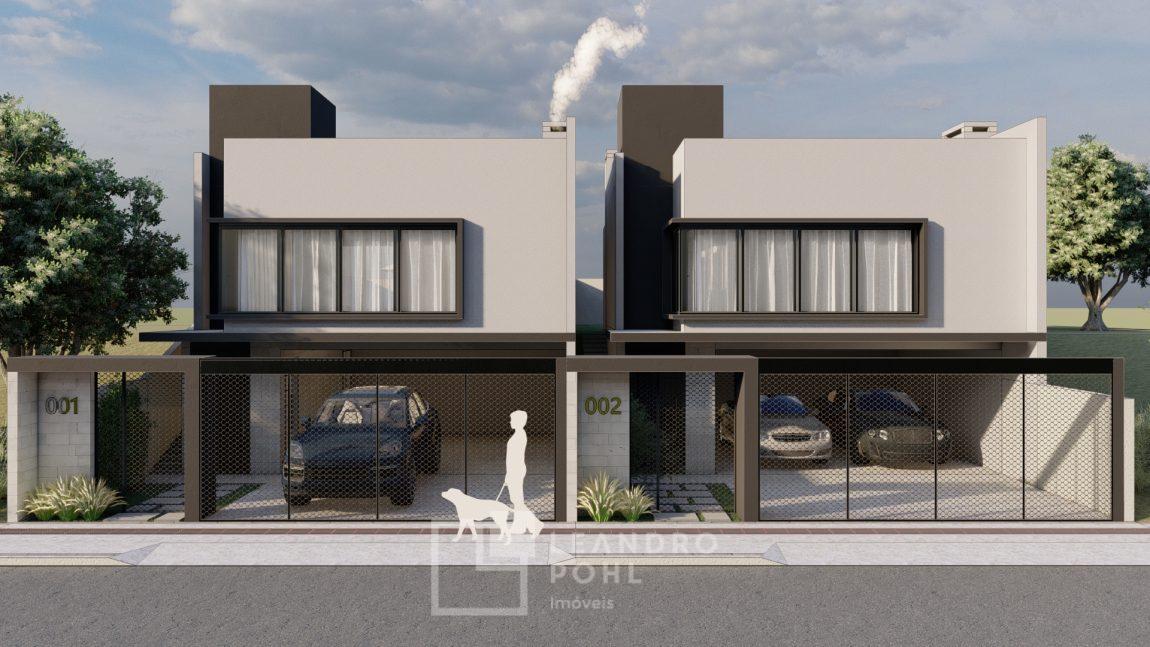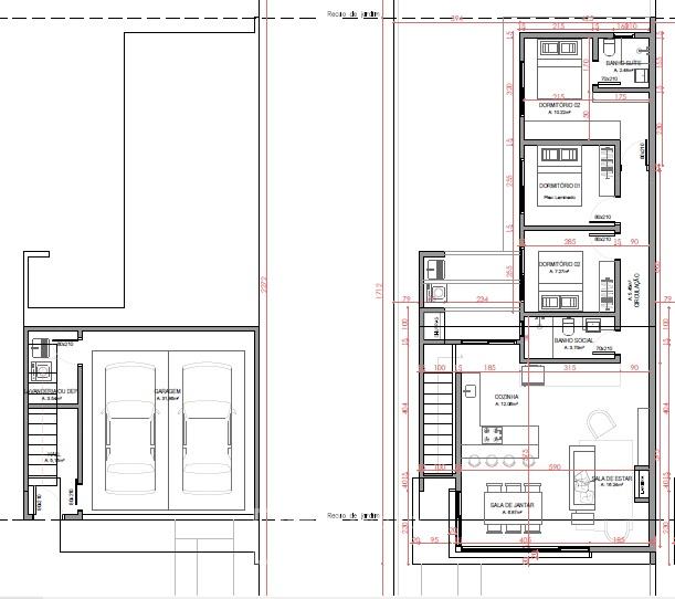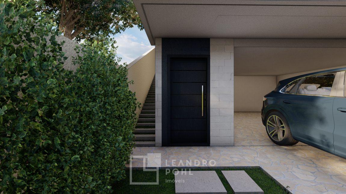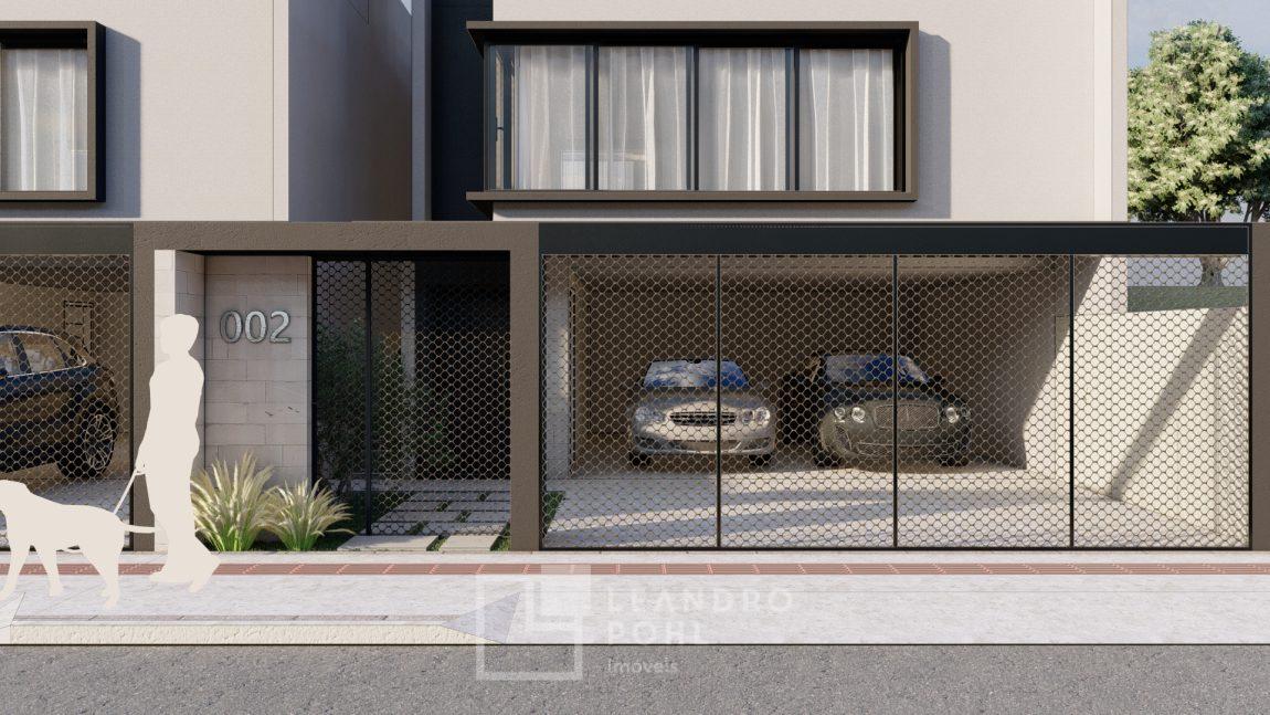 lavanderia (02 opções de implantação), depósito, espaço para armazenamento do gás de cozinha, banheiro social, garagem coberta para 02 veículos na parte inferior, murada e cercada, patio nos fundos de aprox 55m², área gourmet, amplo pátio, espera para aquecimento, esquadrias externas em alumínio preto, portas internas laqueadas, acessos e rampa de garagem, massa corrida nas paredes, forro em gesso