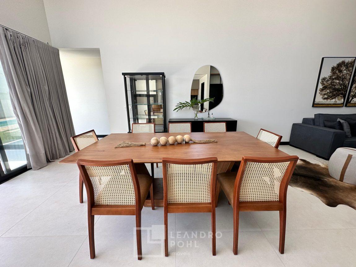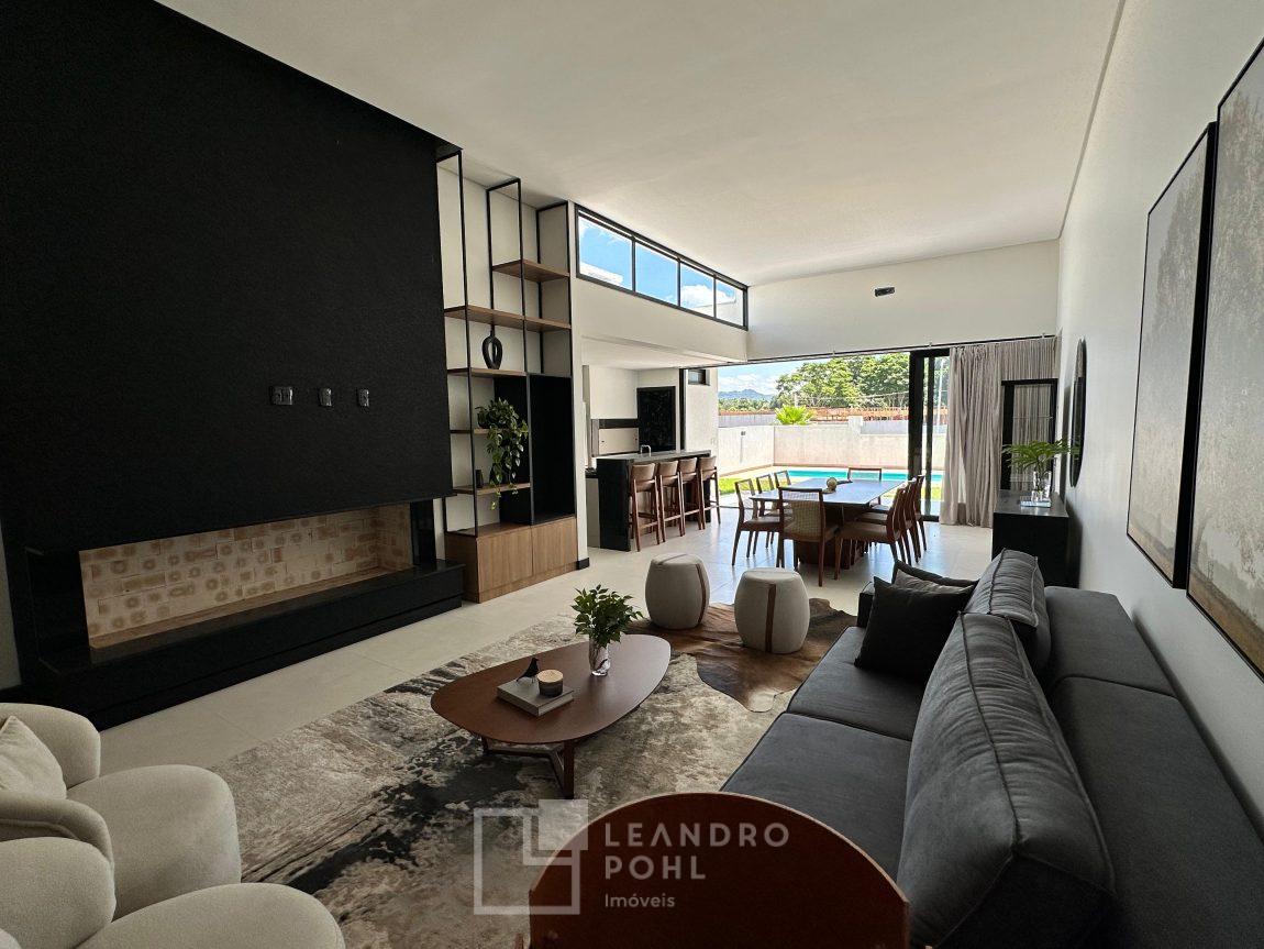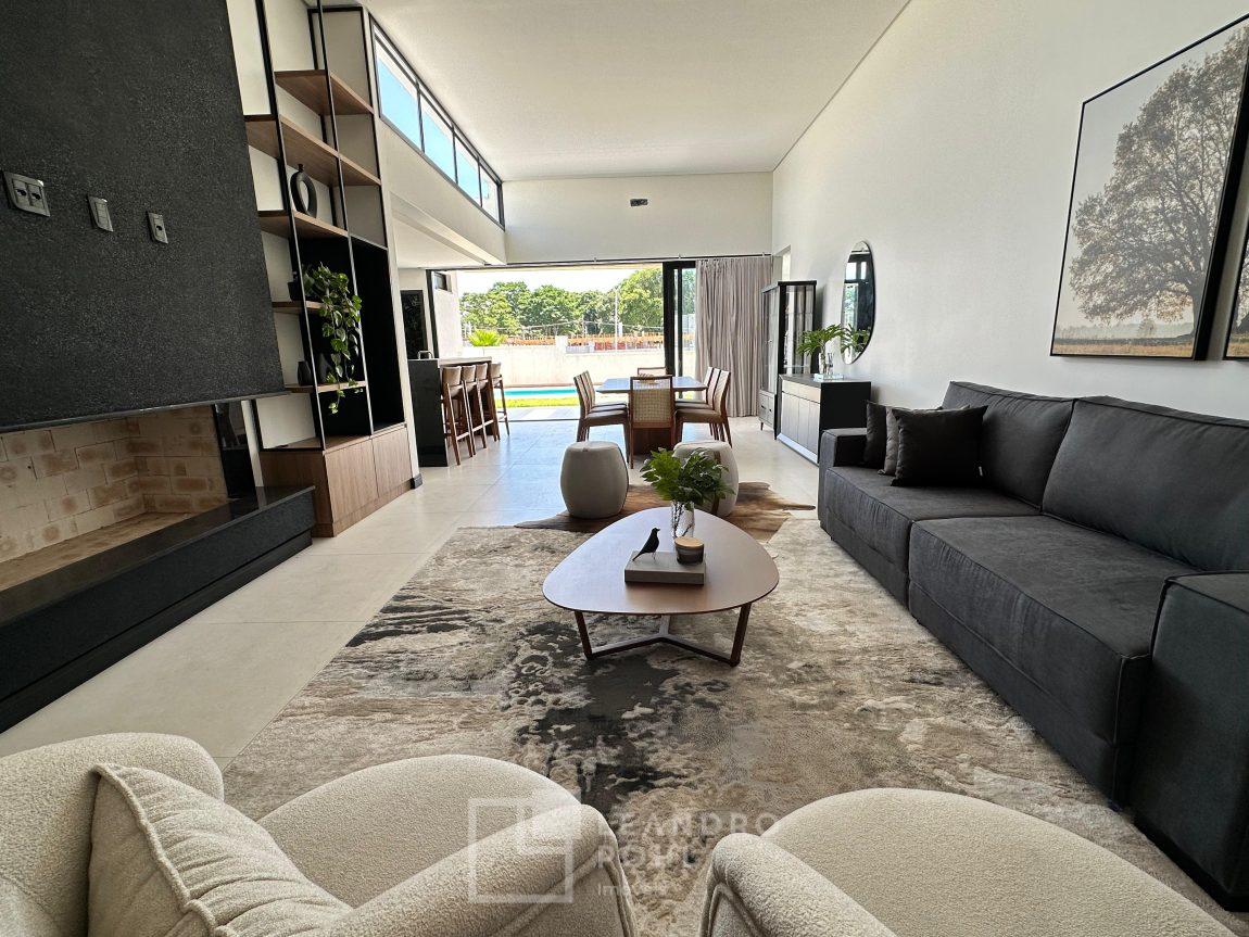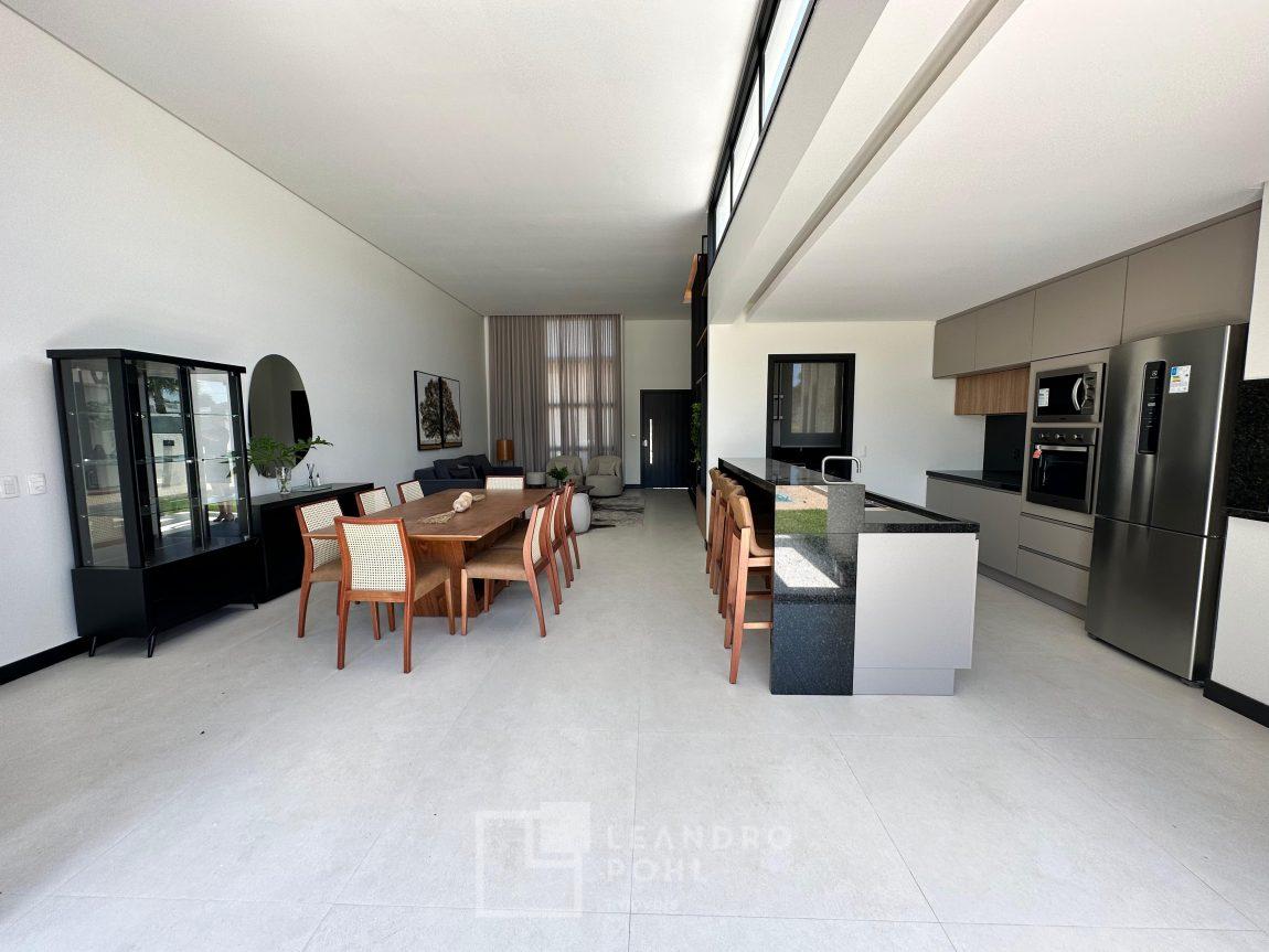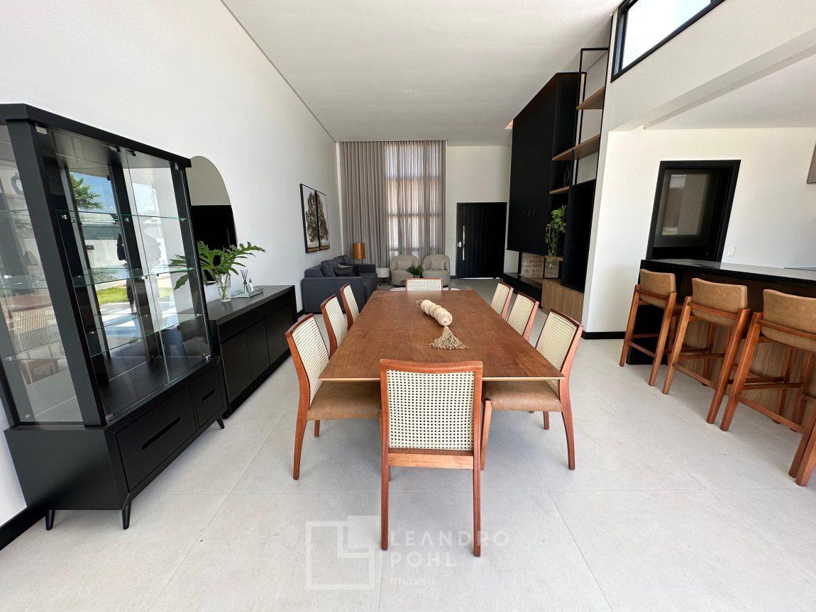 Casa plana, com 3 dormitórios sendo 1 suíte, sala com pé direito alto e ampla lareira, lavabo, cozinha e sala conjugadas, área de serviço separada, SEMIMOBILIADA, varanda, piscina, gesso, suíte, pátio com piscina, permanece mobiliada conforme imagens, persianas automatizadas, gás central, espera para split, fechadura eletronica, garagem para dois carros, estuda trocas sob análise, casa em condomínio fechado com infraestrutura e segurança.