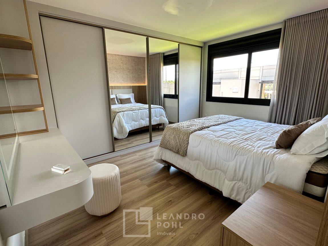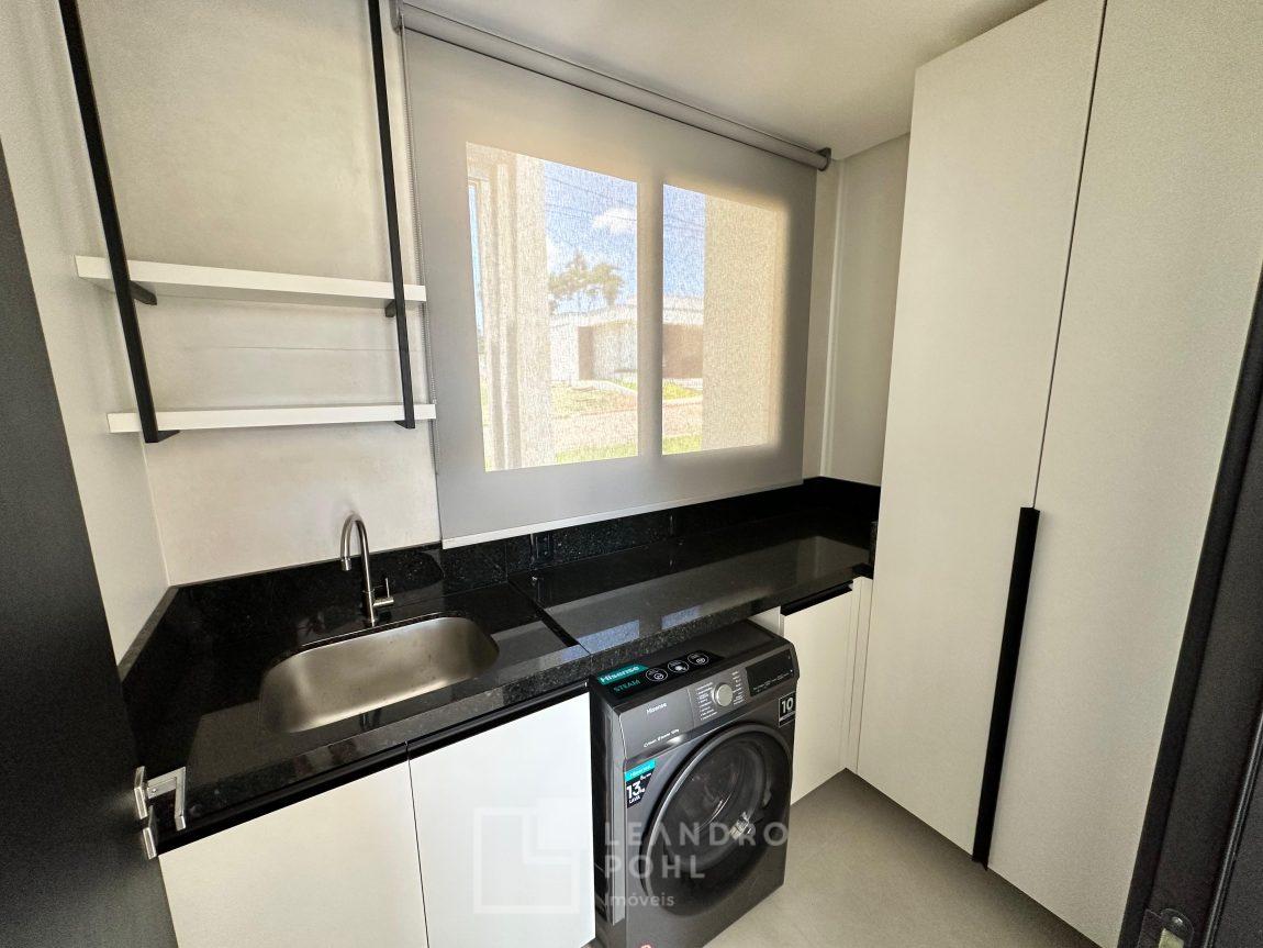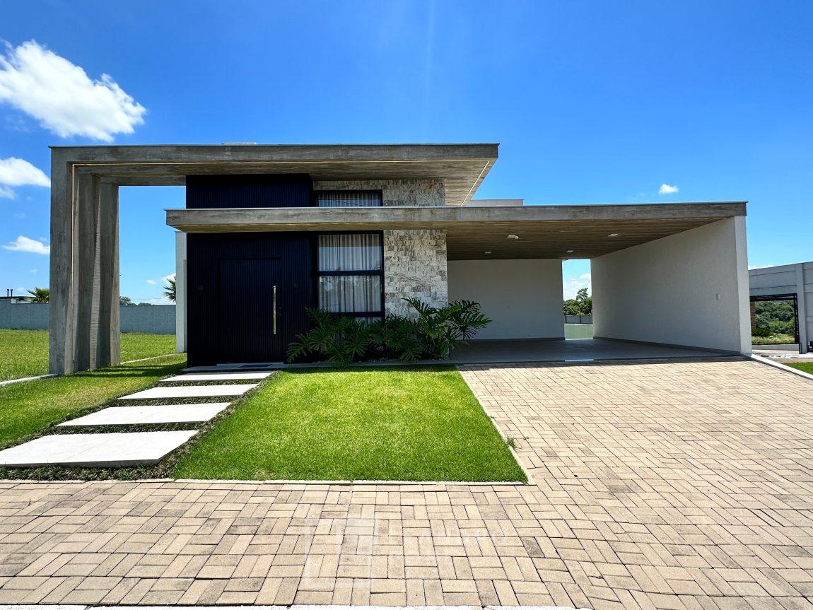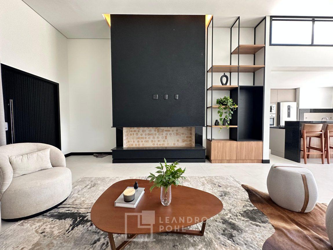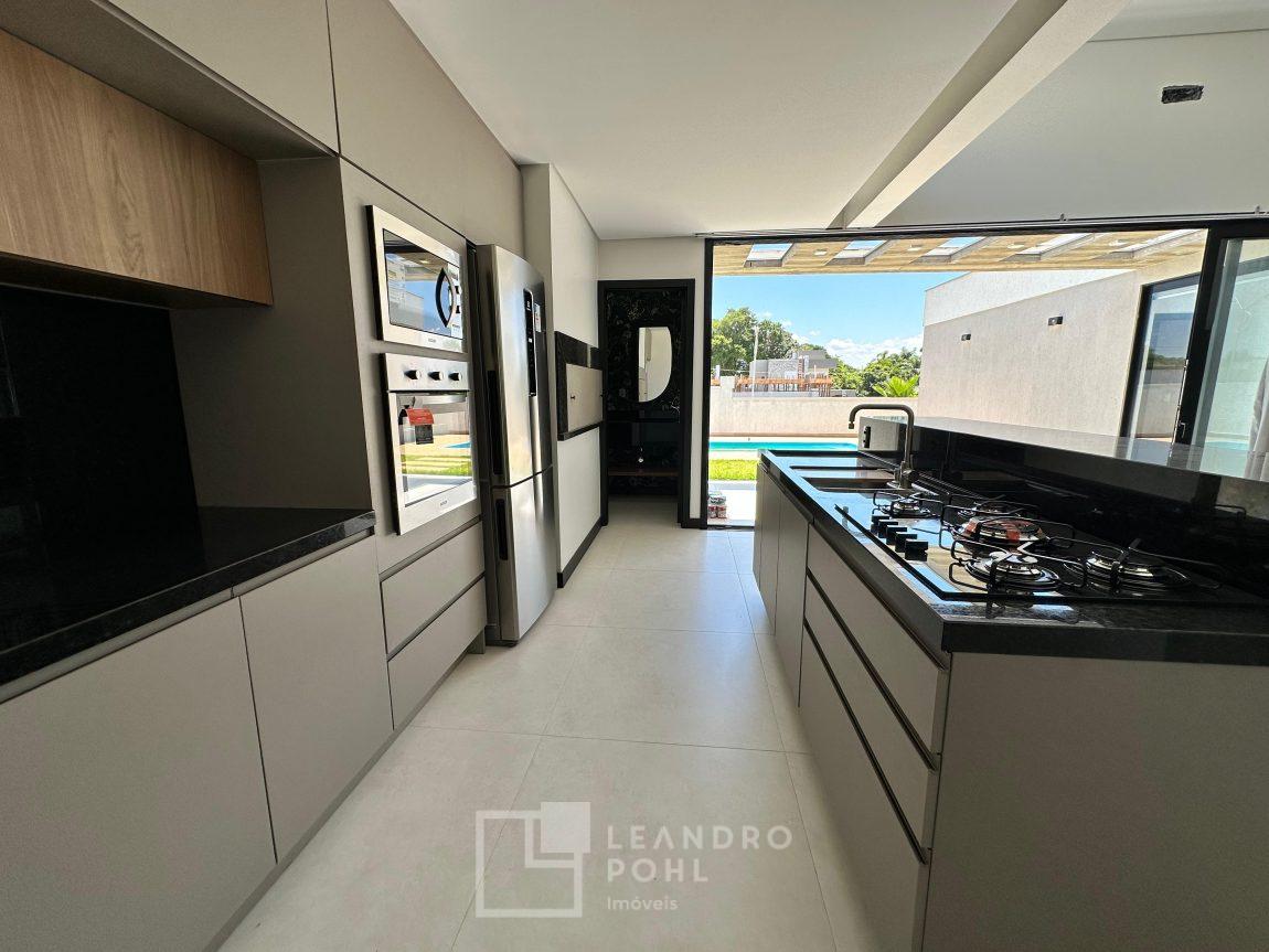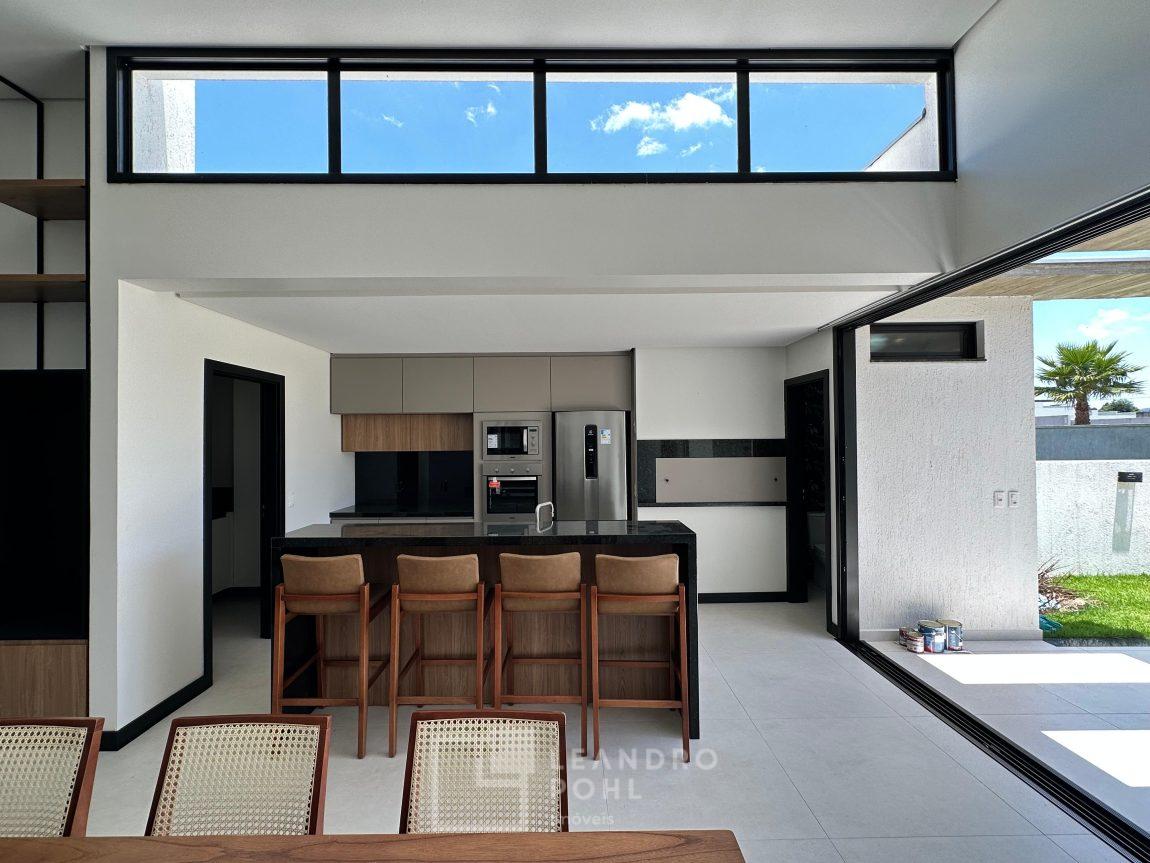 Casa plana, com 3 dormitórios sendo 1 suíte, sala com pé direito alto e ampla lareira, lavabo, cozinha e sala conjugadas, área de serviço separada, SEMIMOBILIADA, varanda, piscina, gesso, suíte, pátio com piscina, permanece mobiliada conforme imagens, persianas automatizadas, gás central, espera para split, fechadura eletronica, garagem para dois carros, estuda trocas sob análise, casa em condomínio fechado com infraestrutura e segurança.