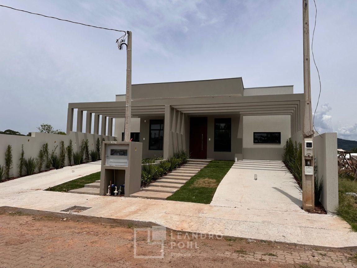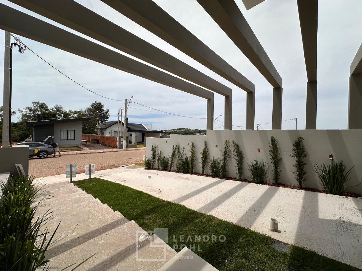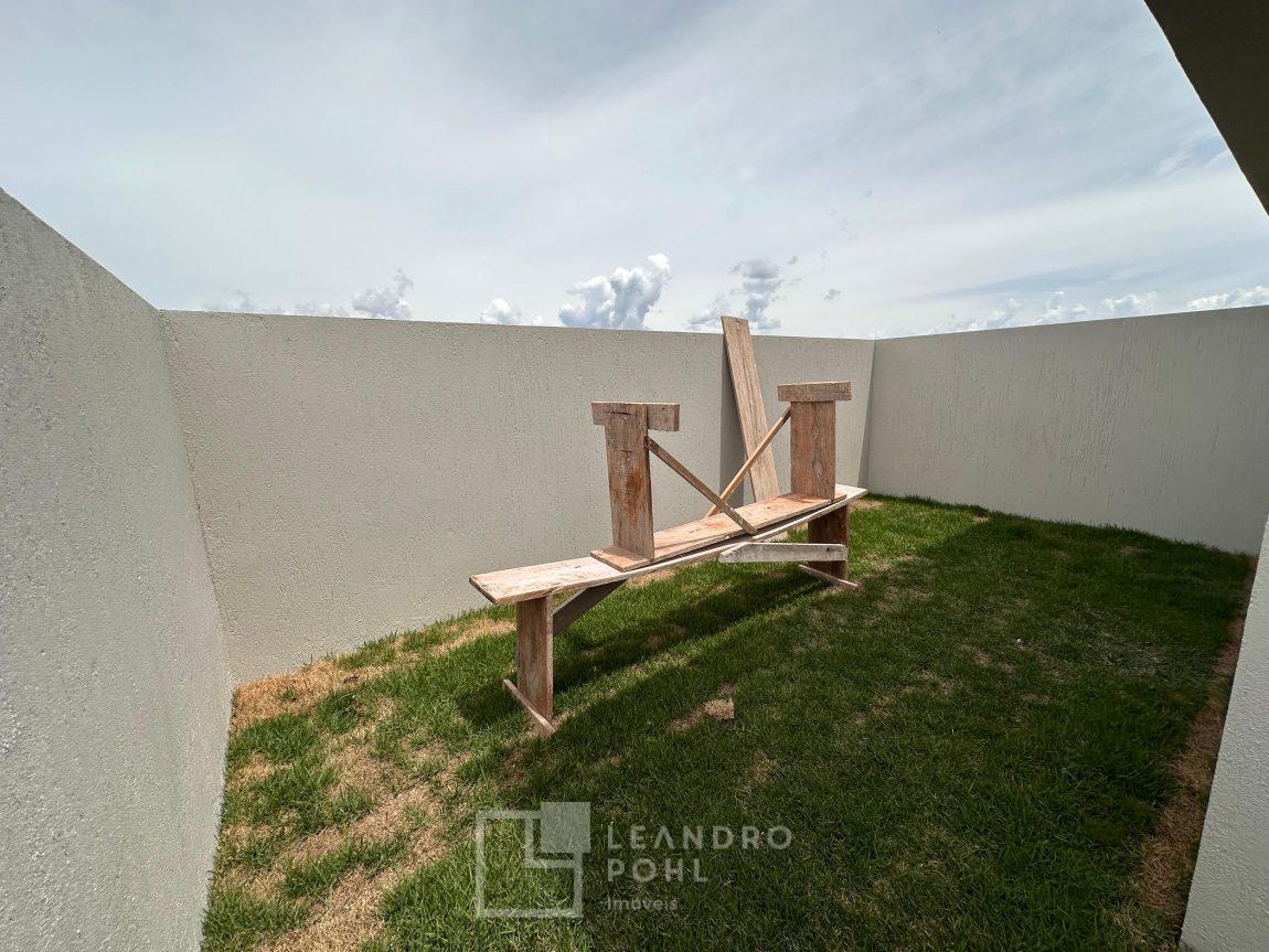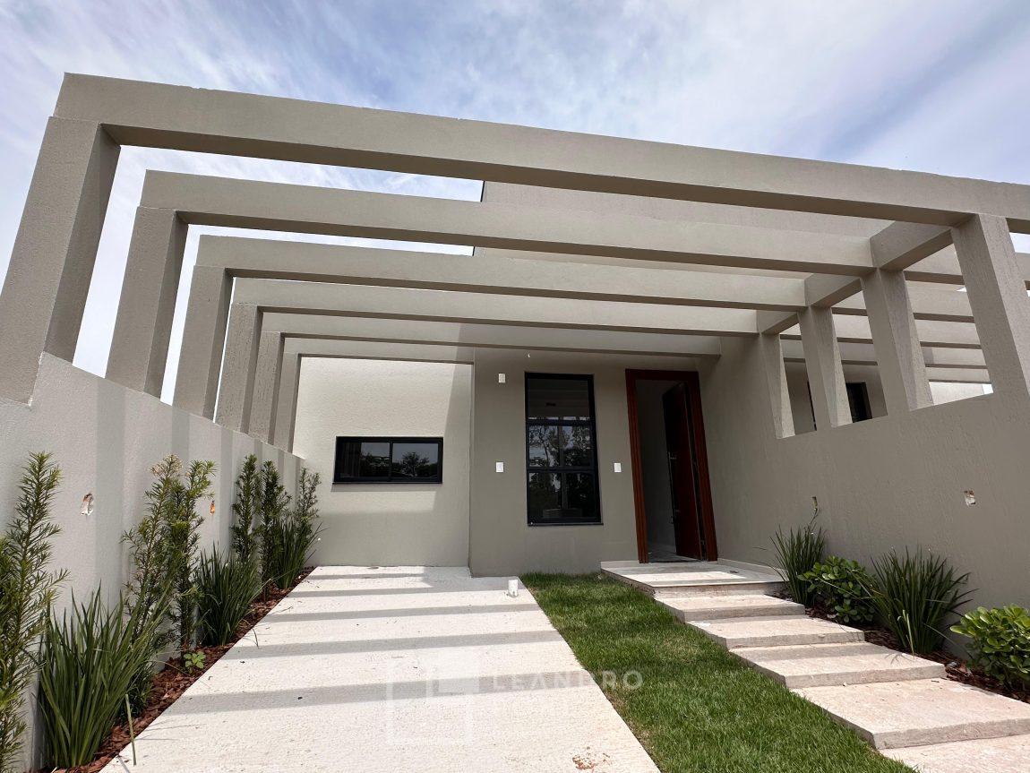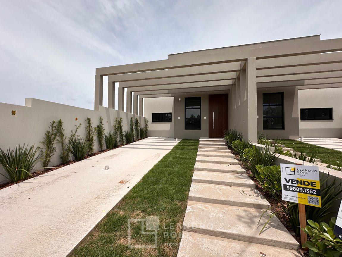Casa geminada plana, com 3 dormitórios, sendo 1 suíte , banheiro social, sala de estar e jantar integradas com pé direito alto, além de uma cozinha moderna, lavanderia separada, churrasqueira, pátio na frente e nos fundos, vaga de garagem para 2 carros e pergolado descoberto,