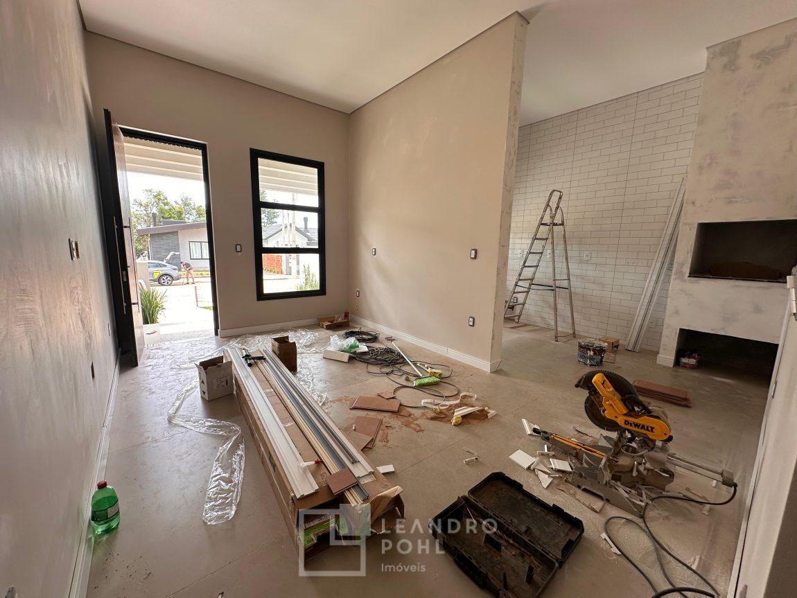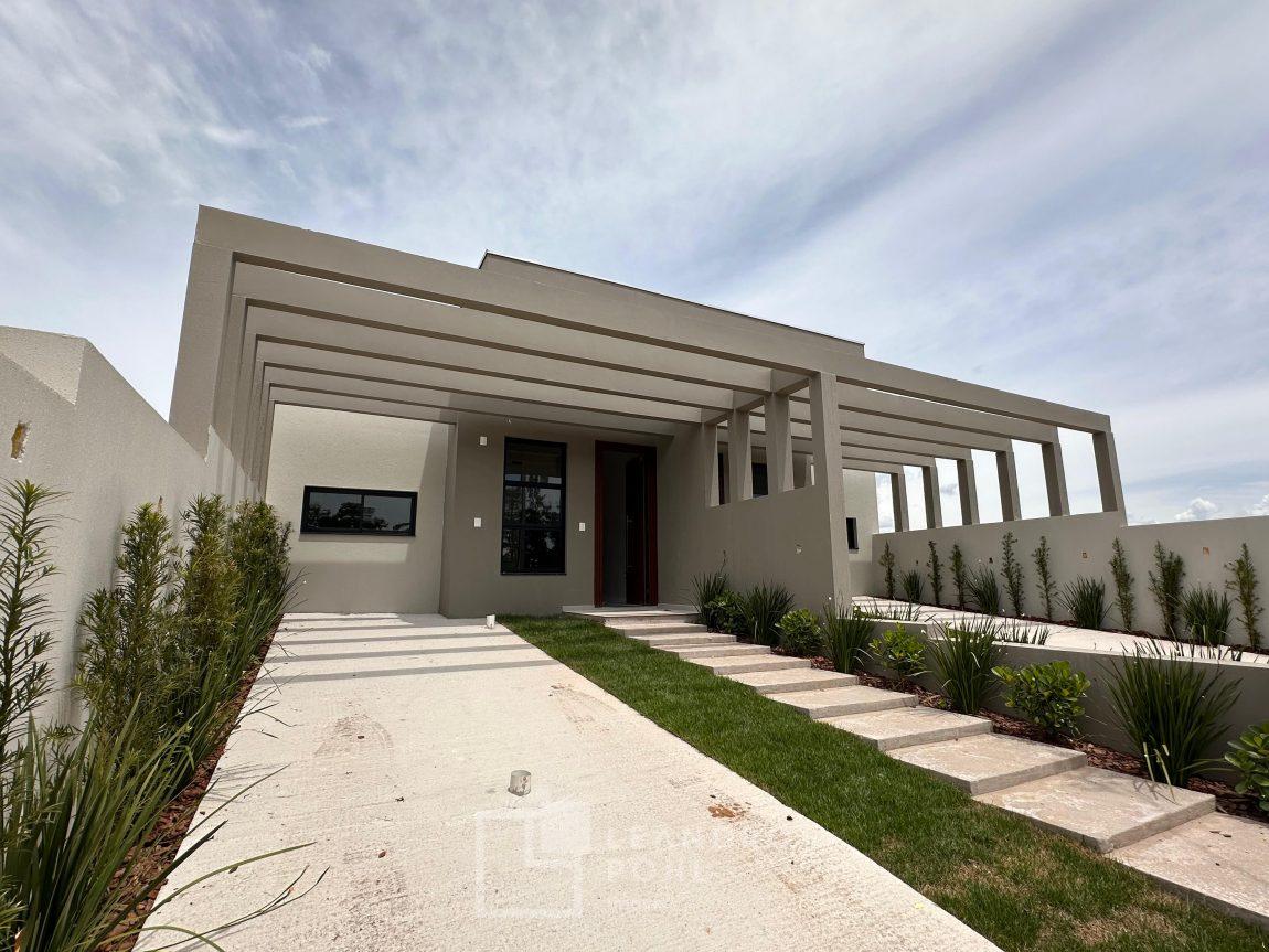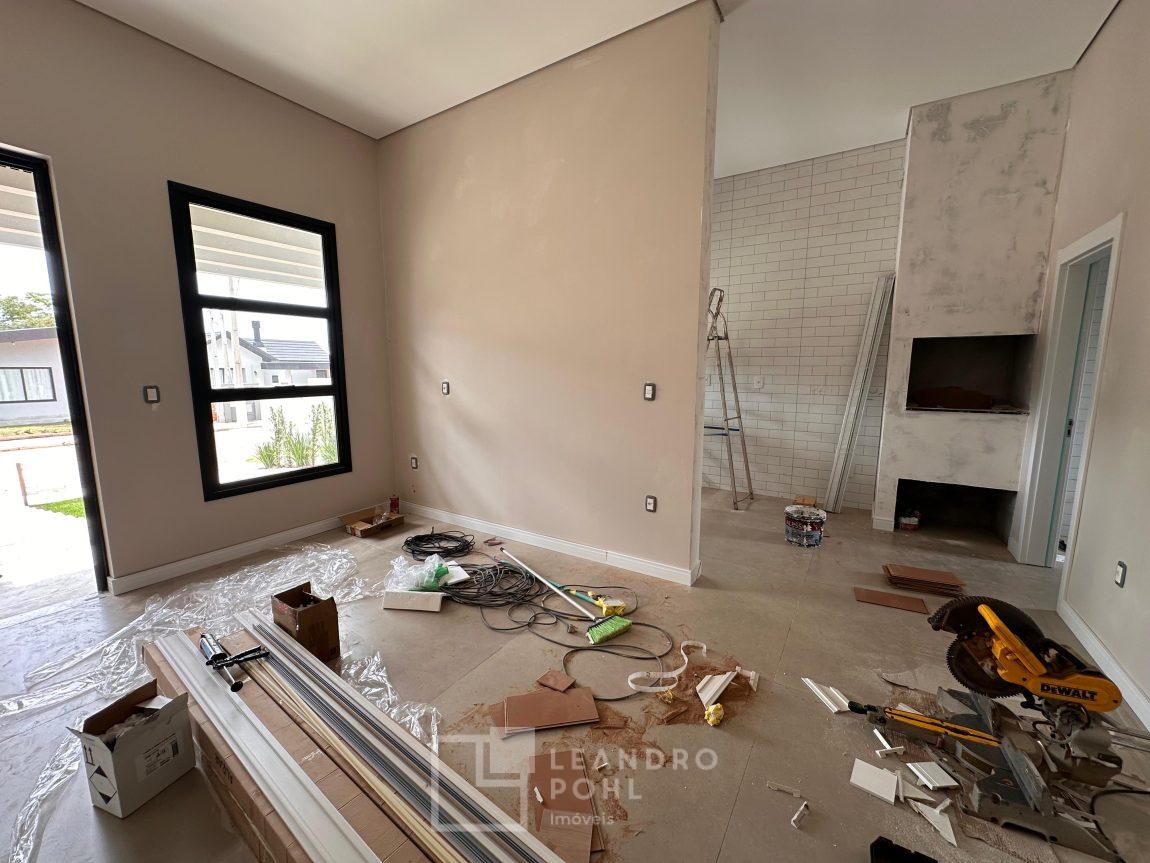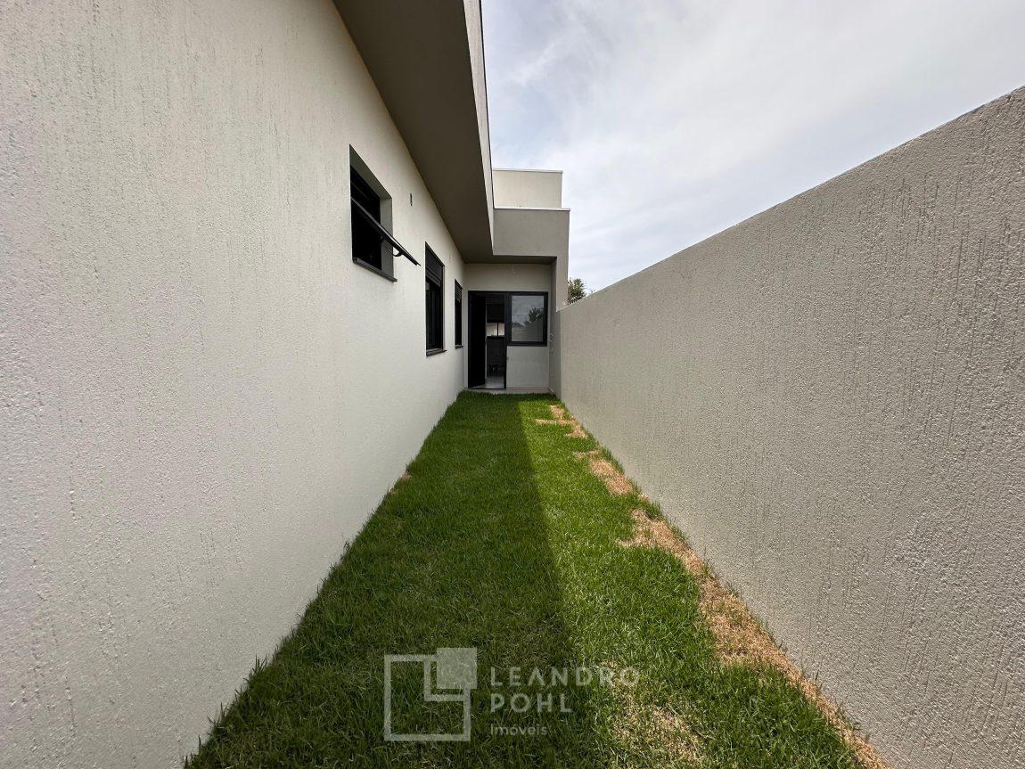 Casa geminada plana, com 3 dormitórios, sendo 1 suíte , banheiro social, sala de estar e jantar integradas com pé direito alto, além de uma cozinha moderna, lavanderia separada, churrasqueira, pátio na frente e nos fundos, vaga de garagem para 2 carros e pergolado descoberto,