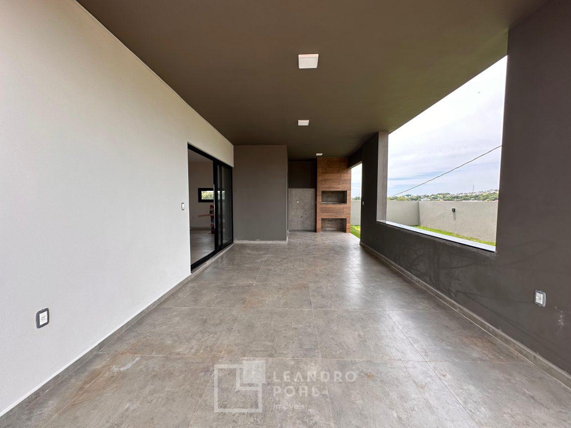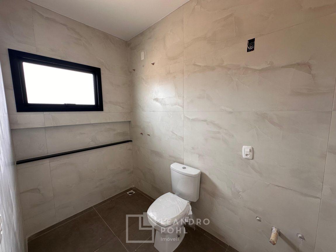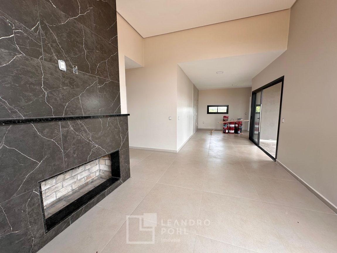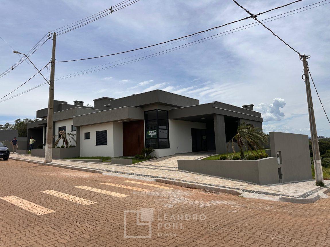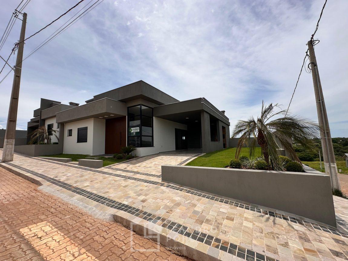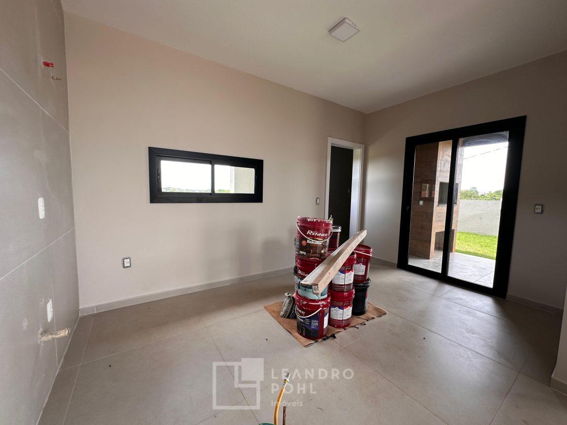 Casa de esquina, plana, nova, 3 dormitórios (1 suíte), pátio, com espera para piscina, lareira e churrasqueira, pé direito elevado na área social, tubulação para água quente, espera para split, fino acabamento em massa corrida e porcelanato, vista privilegiada para o Bairro, loteamento Berghaus é tranquilo e valorizado, próximo a escolas, comércios e serviços essenciais.