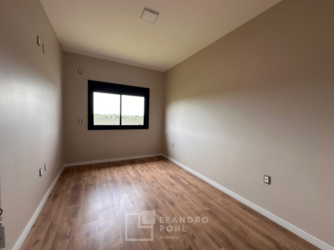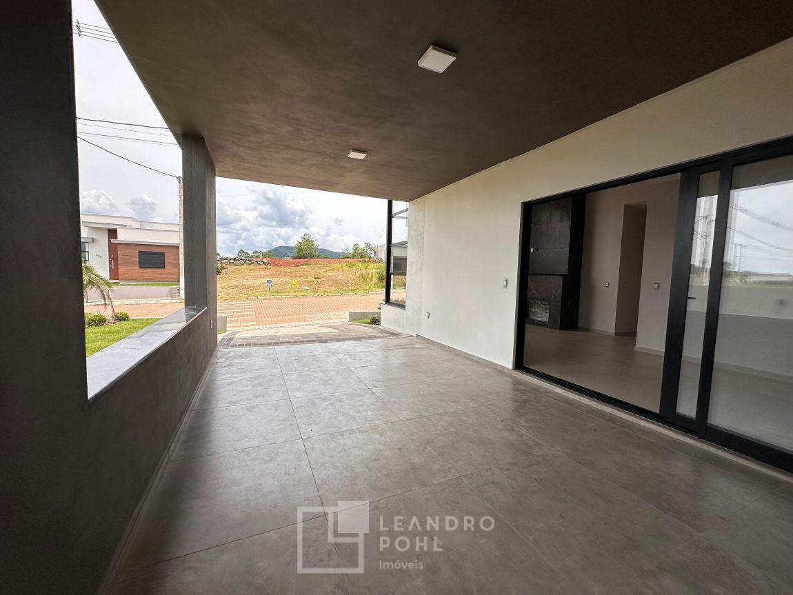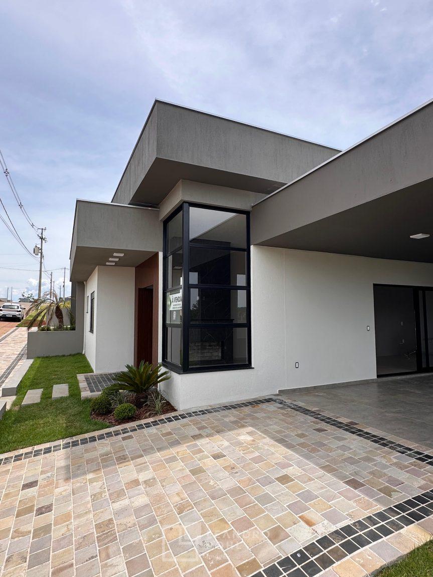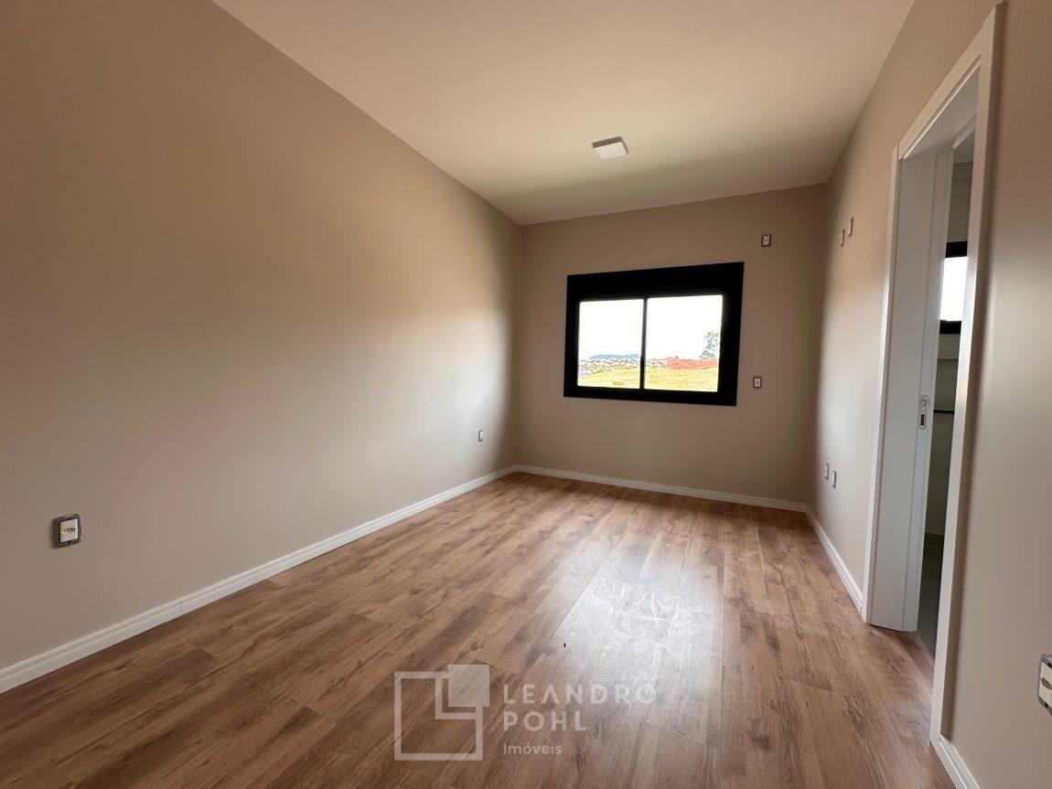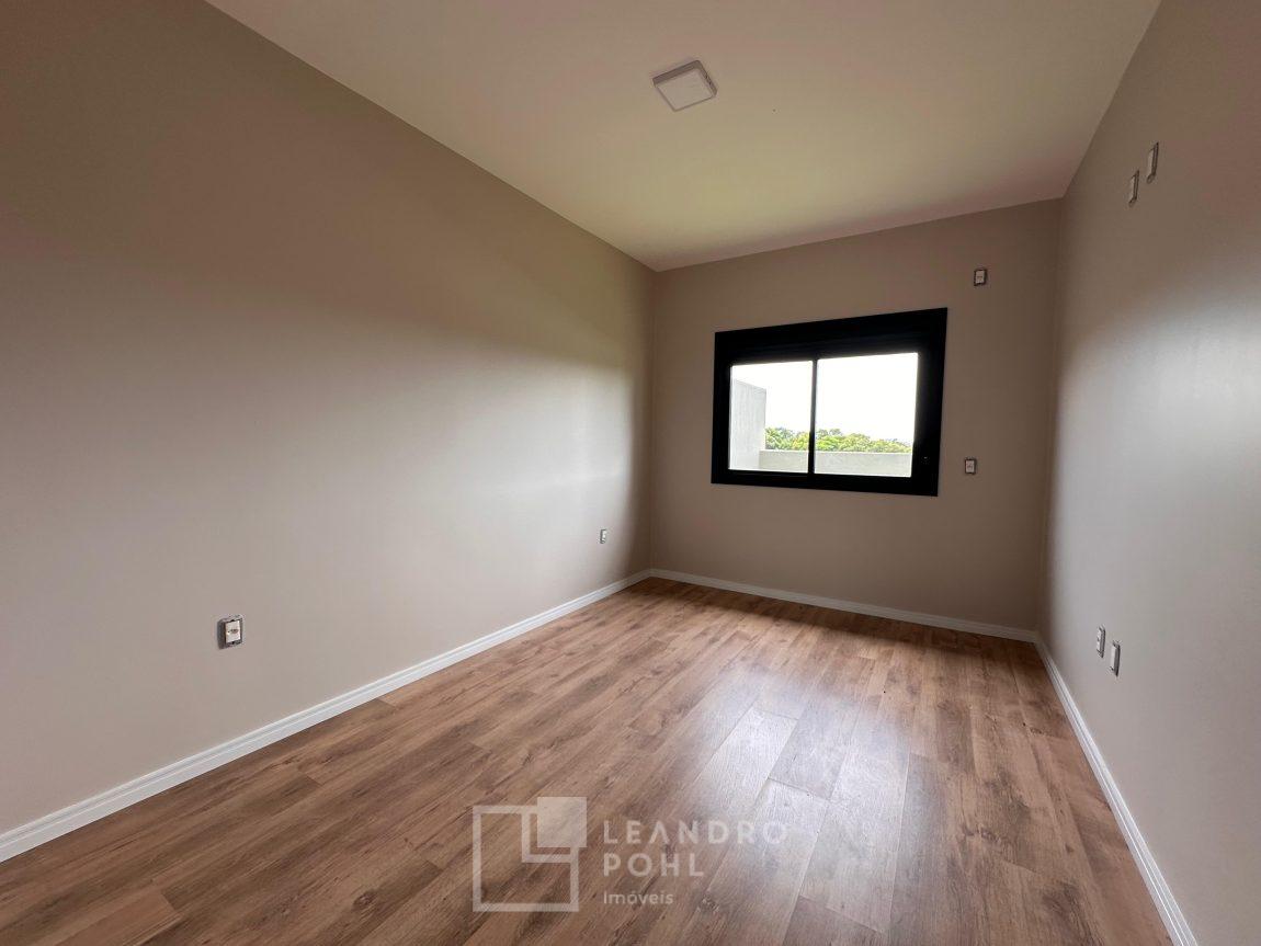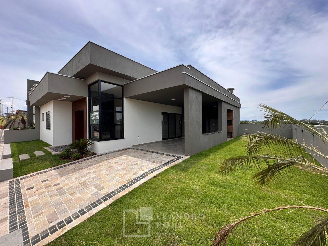 Casa de esquina, plana, nova, 3 dormitórios (1 suíte), pátio, com espera para piscina, lareira e churrasqueira, pé direito elevado na área social, tubulação para água quente, espera para split, fino acabamento em massa corrida e porcelanato, vista privilegiada para o Bairro, loteamento Berghaus é tranquilo e valorizado, próximo a escolas, comércios e serviços essenciais.